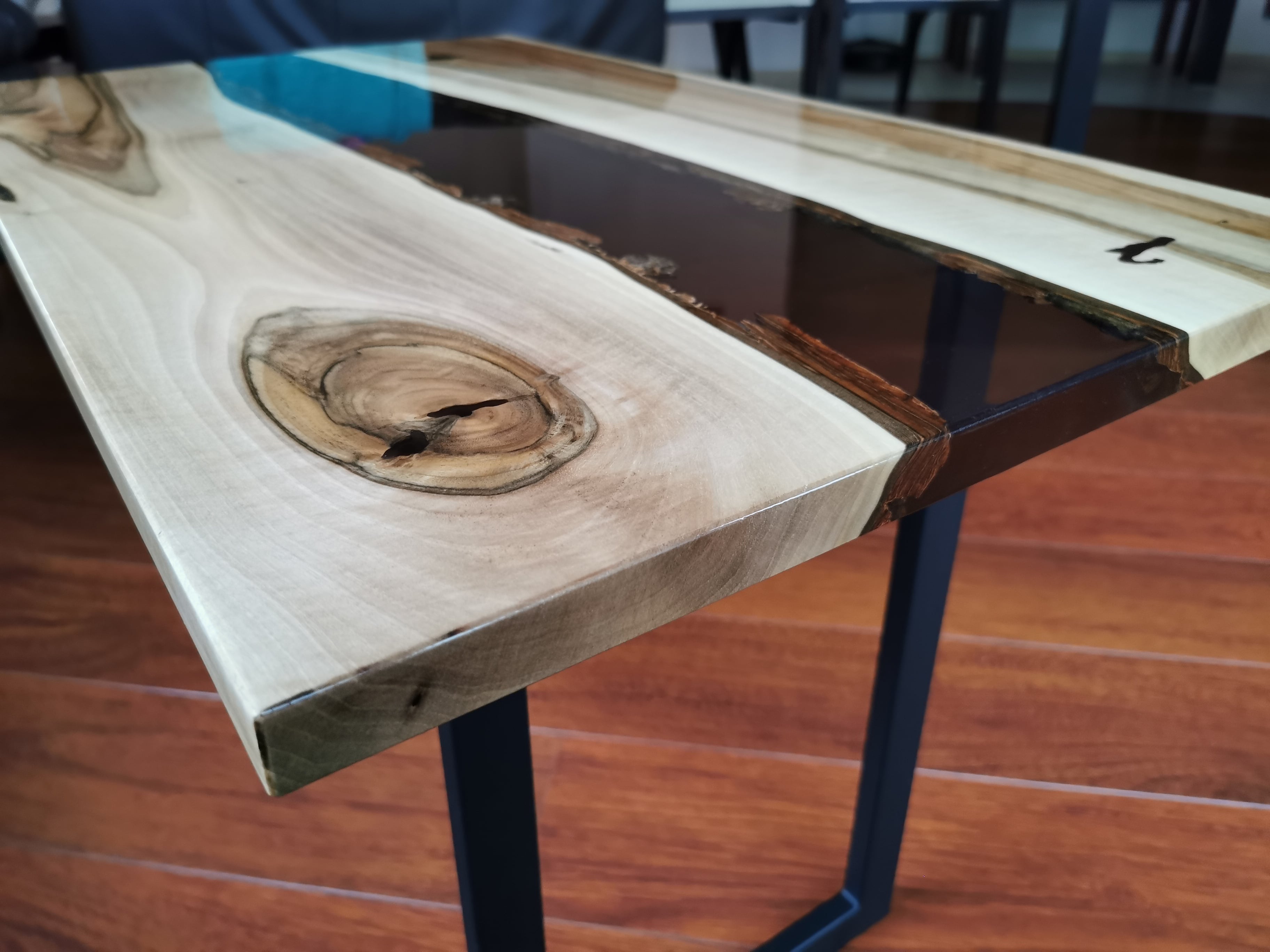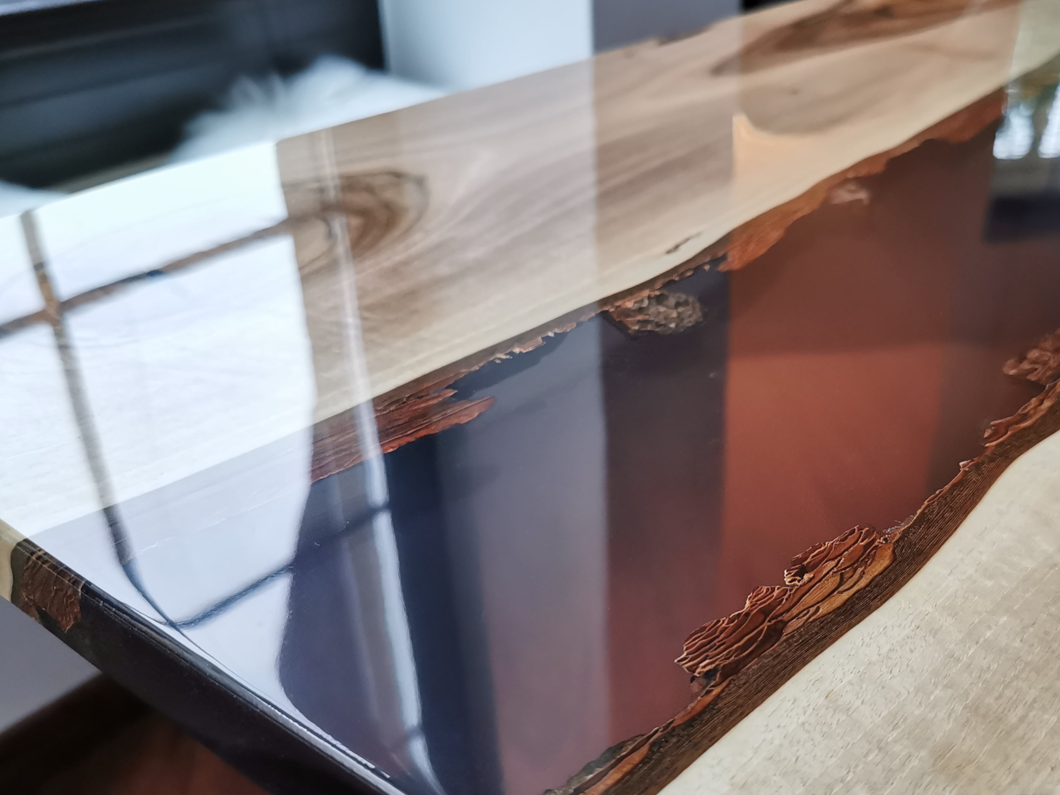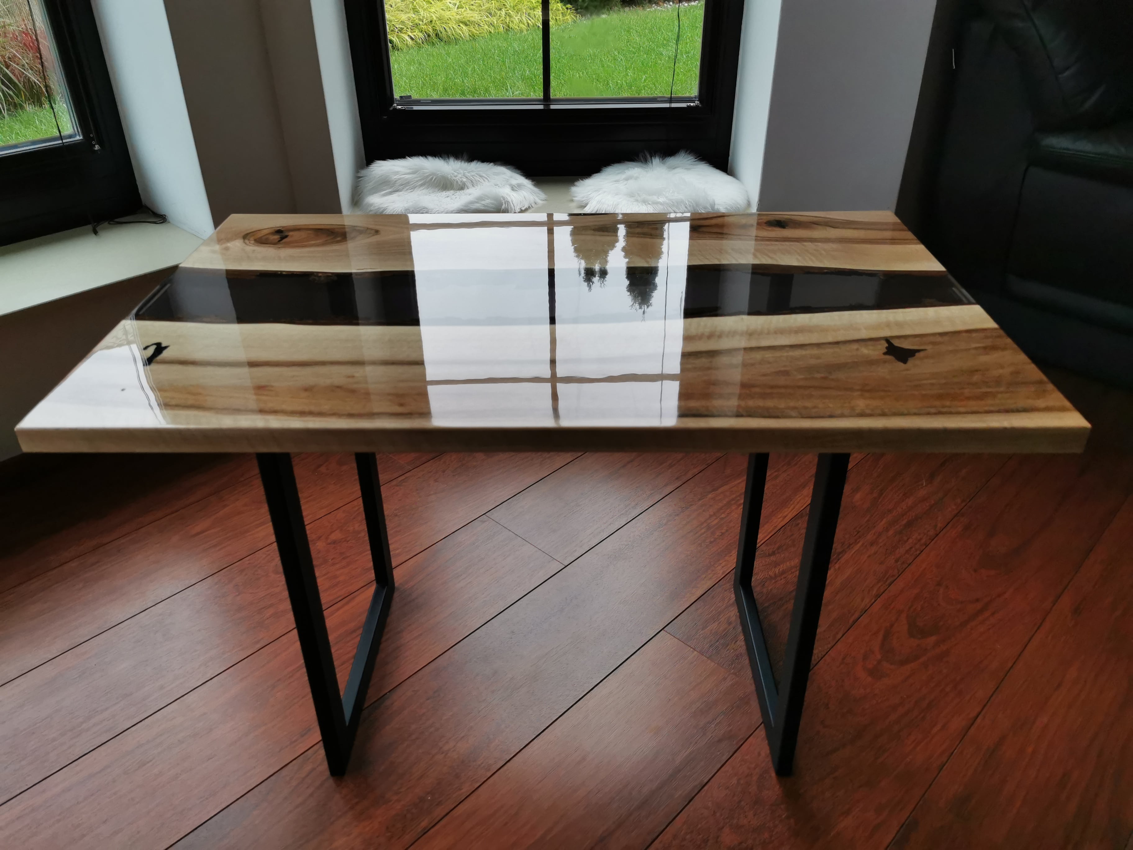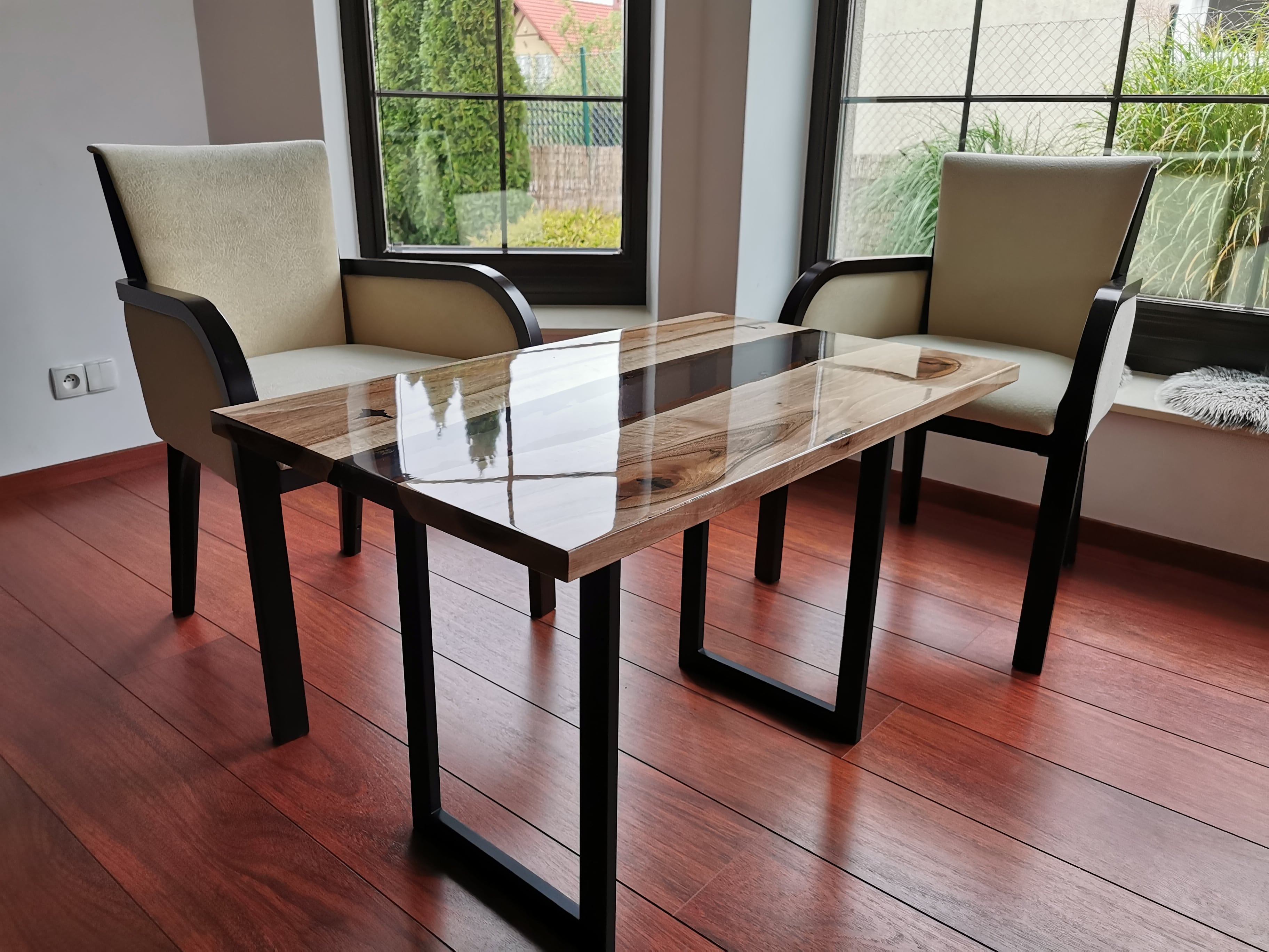Przepiękny stół z orzecha włoskiego z "płynącą" po środku żywicą. Widoczna w transparentnej żywicy surowa kora dodaje charakteru i stwarza niesamowity efekt. Deski z oryginalnym ubarwieniem i niepowtarzalnym wzorem słojów. Drewno wzmocnione poprzez kilkukrotną dogłębną impregnację żywicą. Całość zabezpieczona dwuskładnikowym lakierem poliuretanowym. Blat stołu idealnie wyrównany, wyszlifowany oraz wypolerowany na wysoki połysk. Nogi typu LOFT o kształcie i profilu prostokątnym wykonane z metalu i pokryte trwałym lakierem proszkowym w kolorze czarnym.