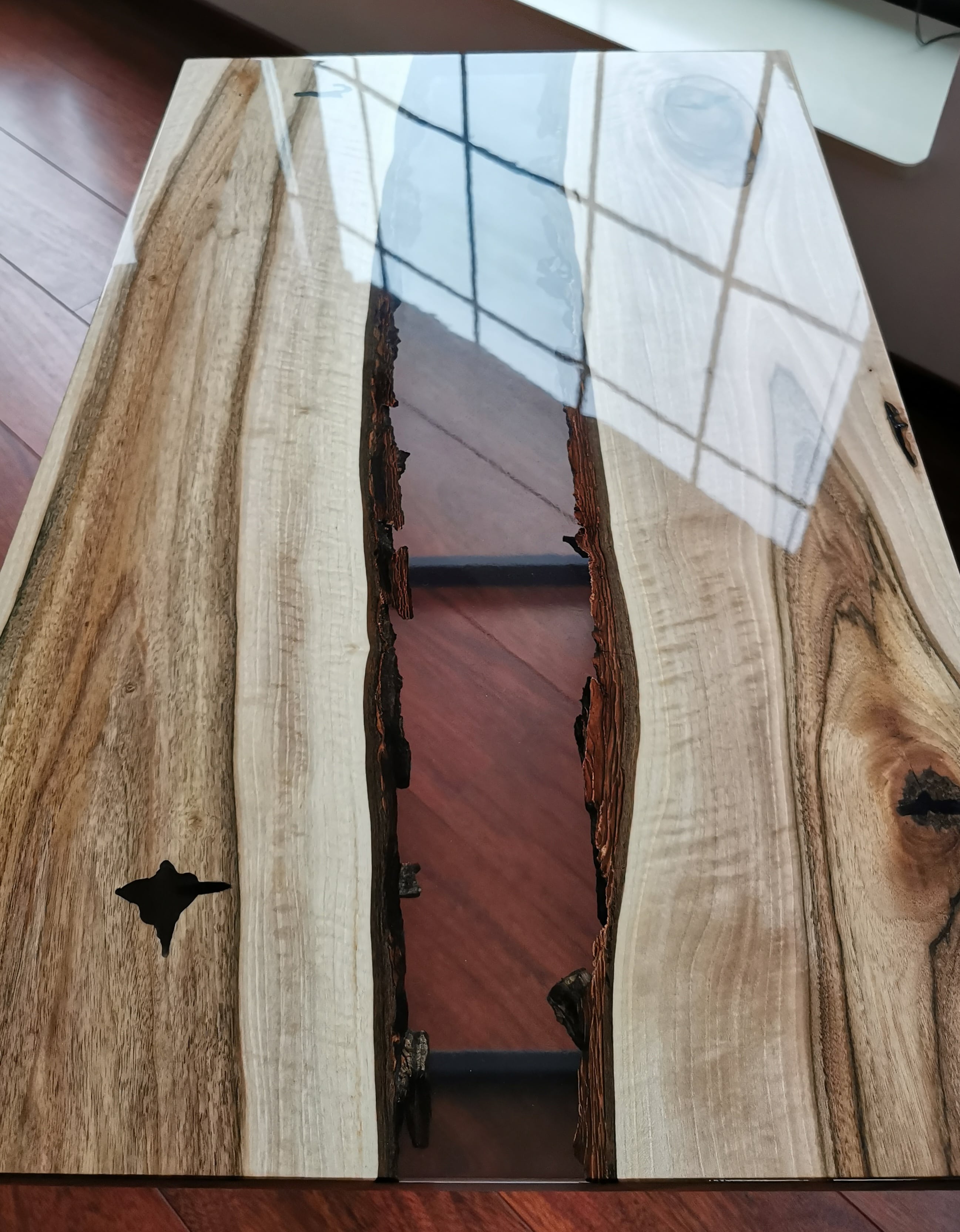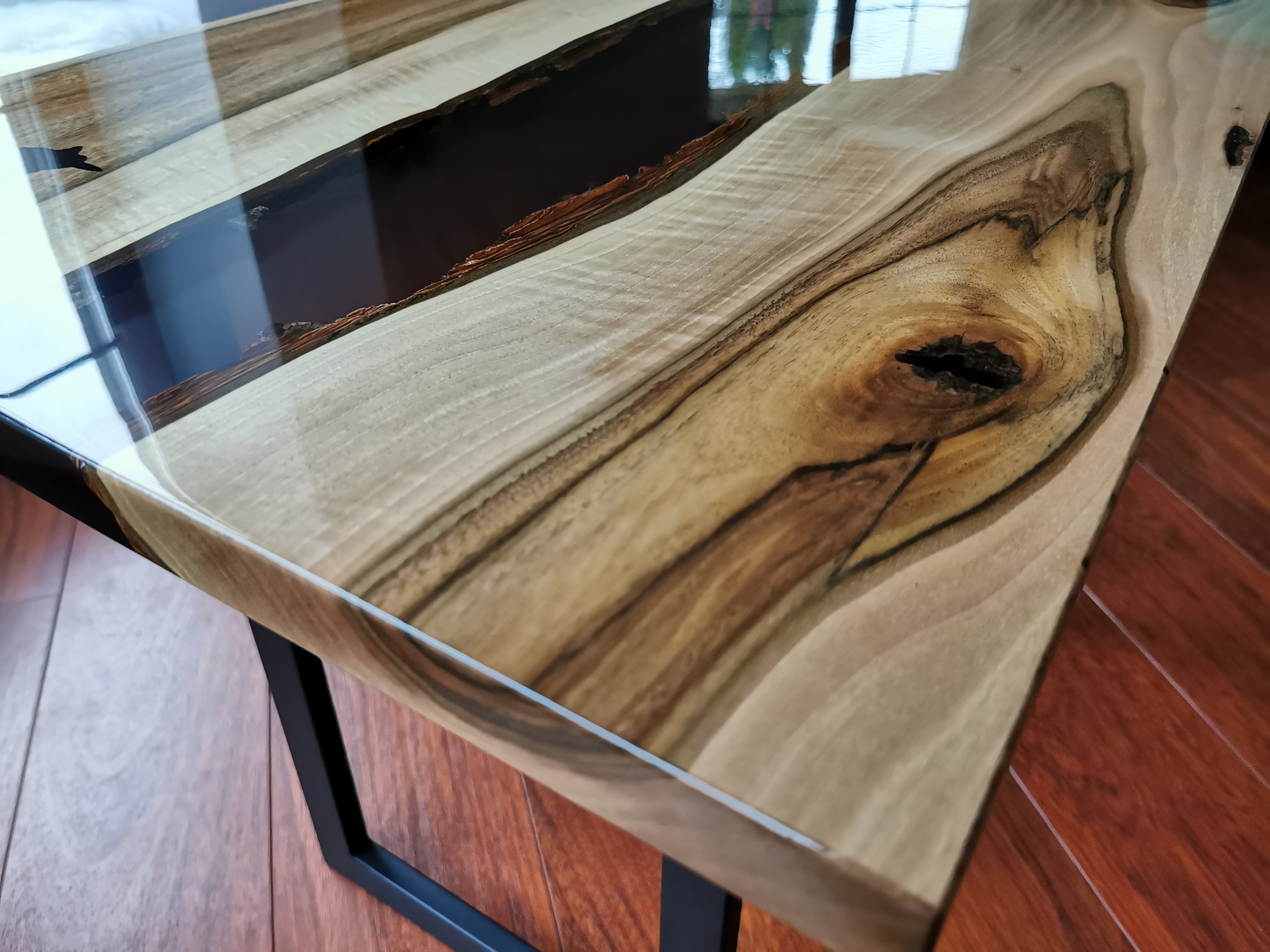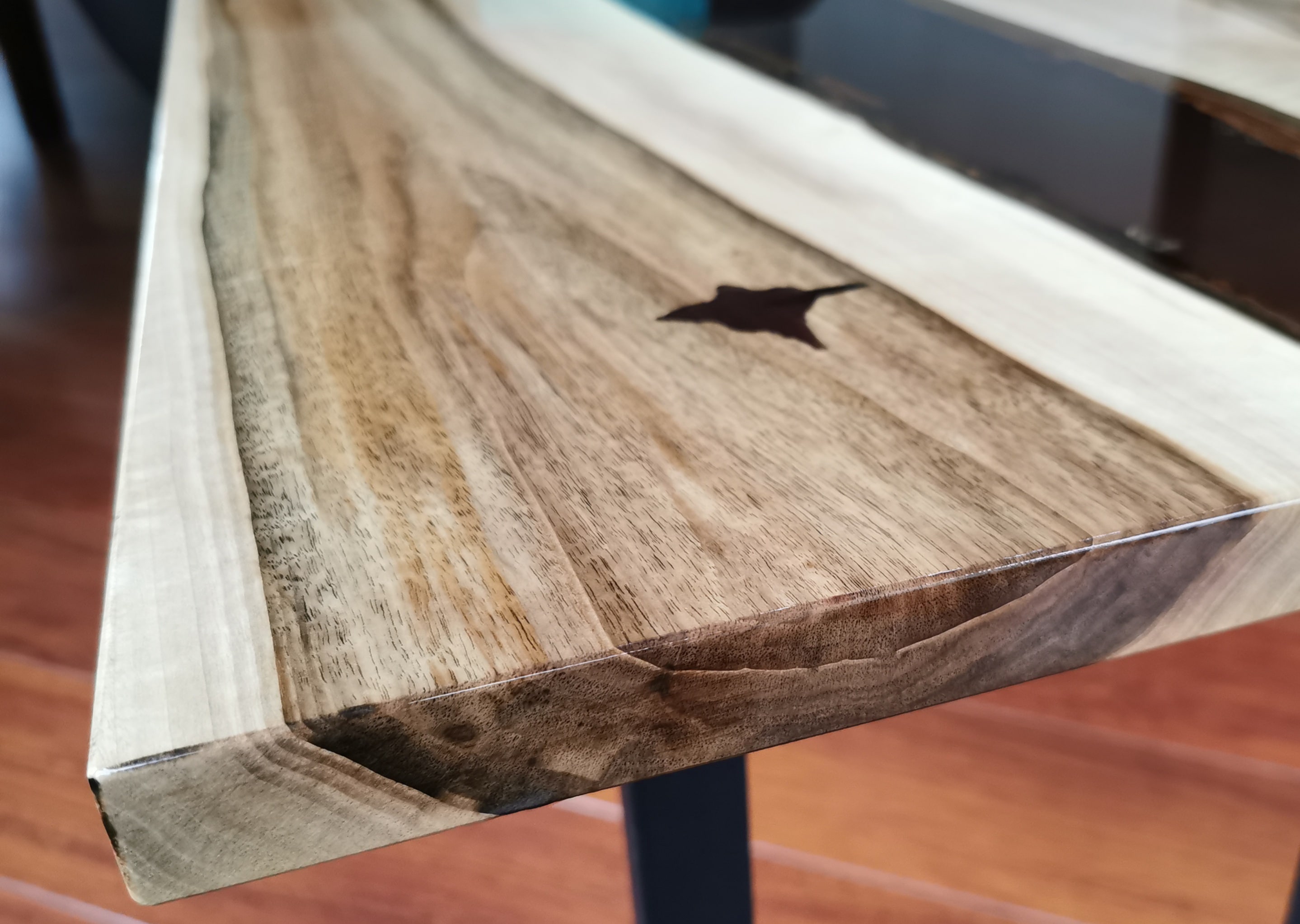 Przepiękny stół z orzecha włoskiego z "płynącą" po środku żywicą. Widoczna w transparentnej żywicy surowa kora dodaje charakteru i stwarza niesamowity efekt. Deski z oryginalnym ubarwieniem i niepowtarzalnym wzorem słojów. Drewno wzmocnione poprzez kilkukrotną dogłębną impregnację żywicą. Całość zabezpieczona dwuskładnikowym lakierem poliuretanowym. Blat stołu idealnie wyrównany, wyszlifowany oraz wypolerowany na wysoki połysk. Nogi typu LOFT o kształcie i profilu prostokątnym wykonane z metalu i pokryte trwałym lakierem proszkowym w kolorze czarnym.