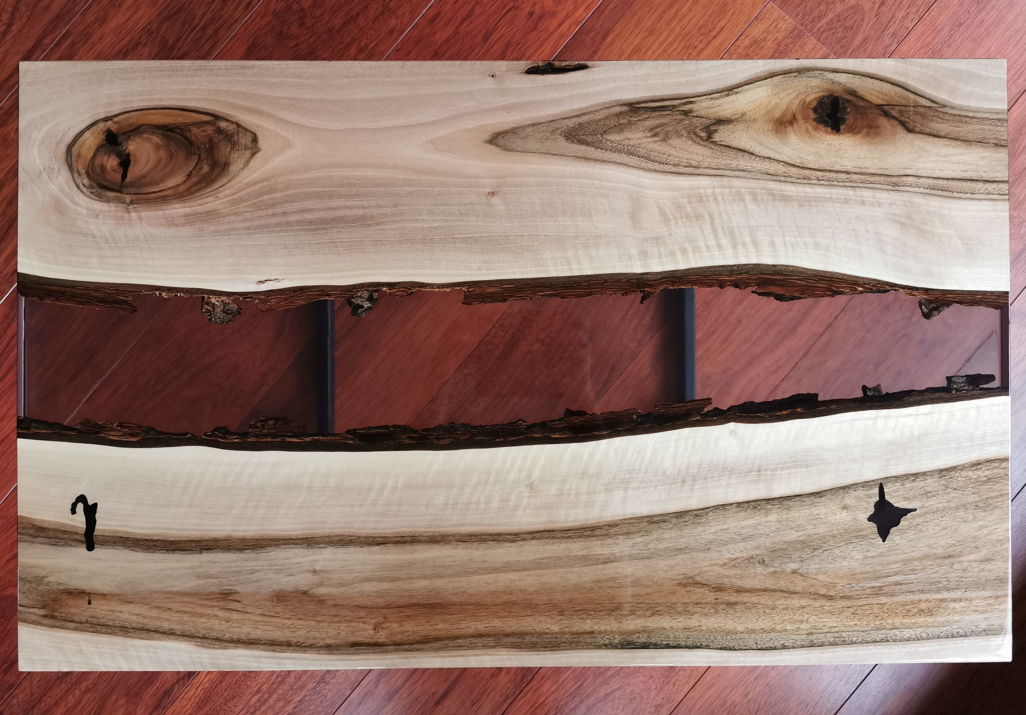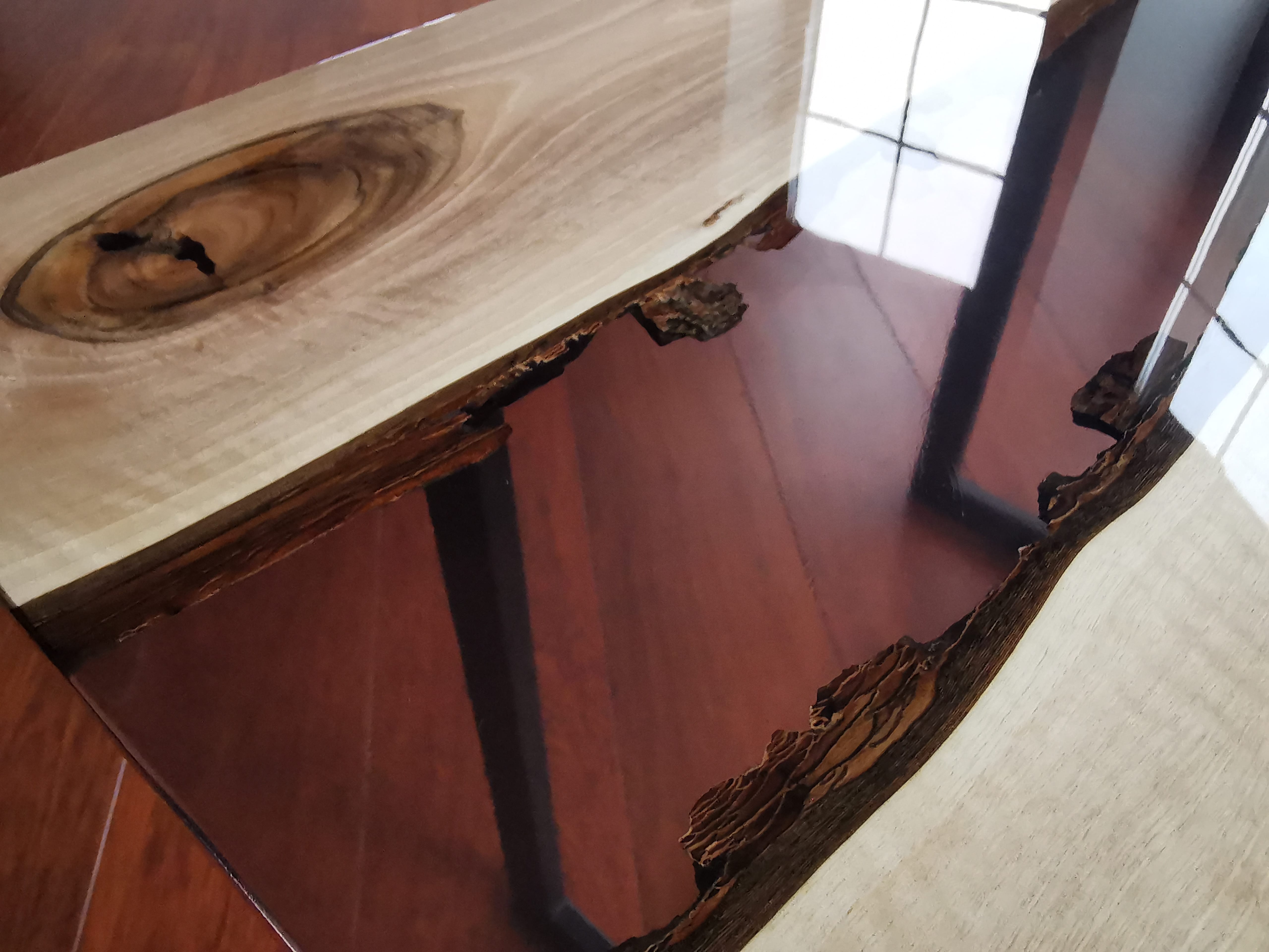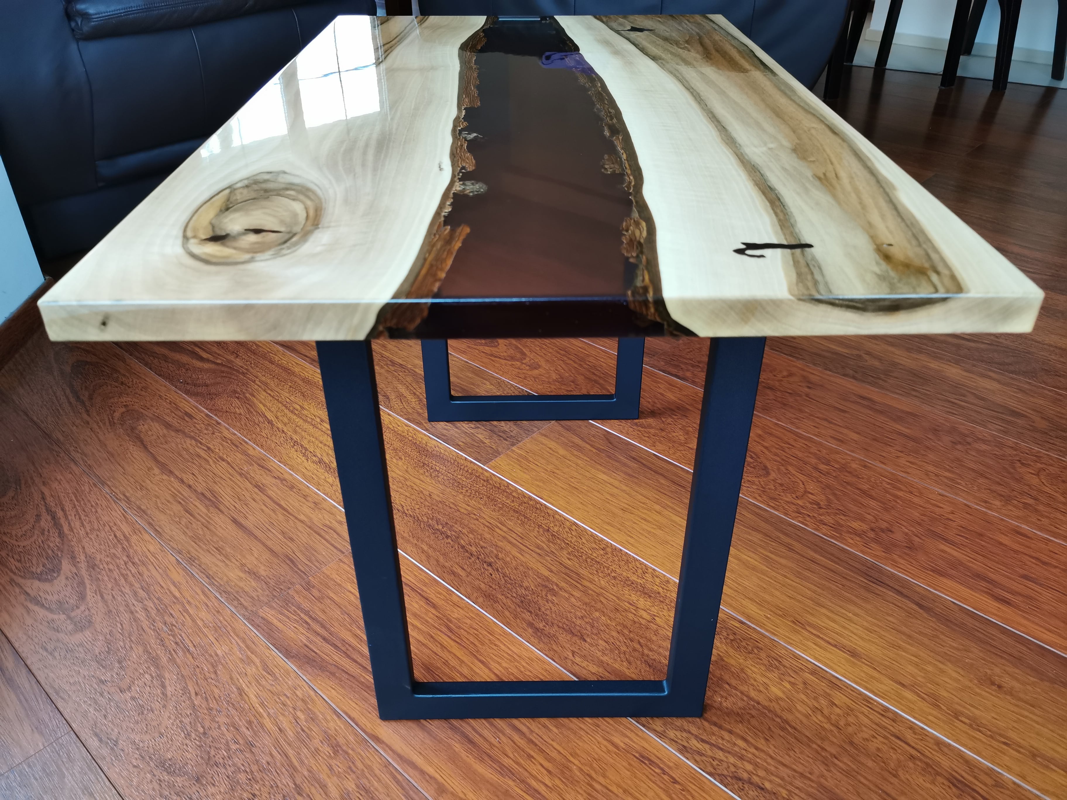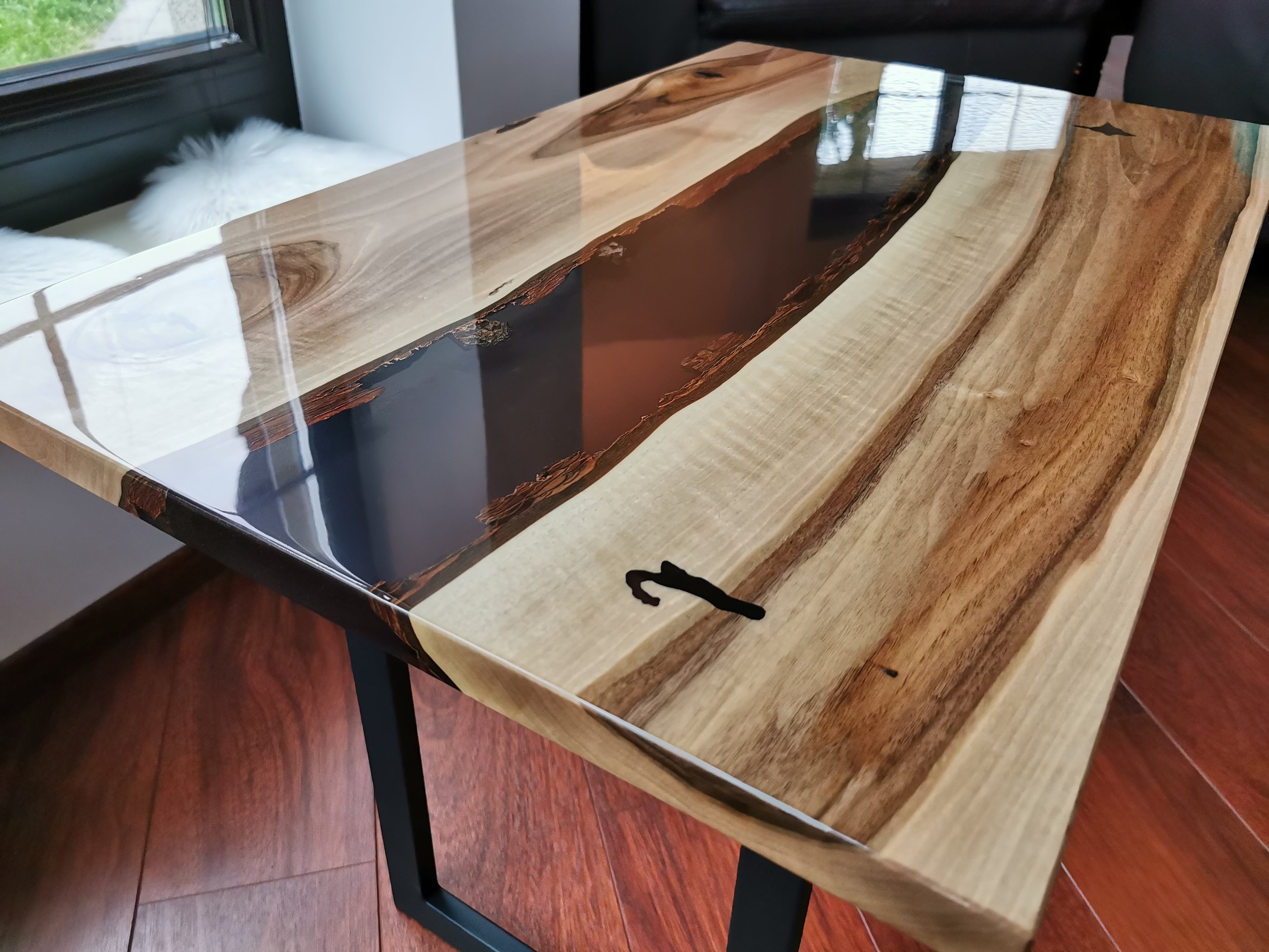 Przepiękny stół z orzecha włoskiego z "płynącą" po środku żywicą. Widoczna w transparentnej żywicy surowa kora dodaje charakteru i stwarza niesamowity efekt. Deski z oryginalnym ubarwieniem i niepowtarzalnym wzorem słojów. Drewno wzmocnione poprzez kilkukrotną dogłębną impregnację żywicą. Całość zabezpieczona dwuskładnikowym lakierem poliuretanowym. Blat stołu idealnie wyrównany, wyszlifowany oraz wypolerowany na wysoki połysk. Nogi typu LOFT o kształcie i profilu prostokątnym wykonane z metalu i pokryte trwałym lakierem proszkowym w kolorze czarnym.