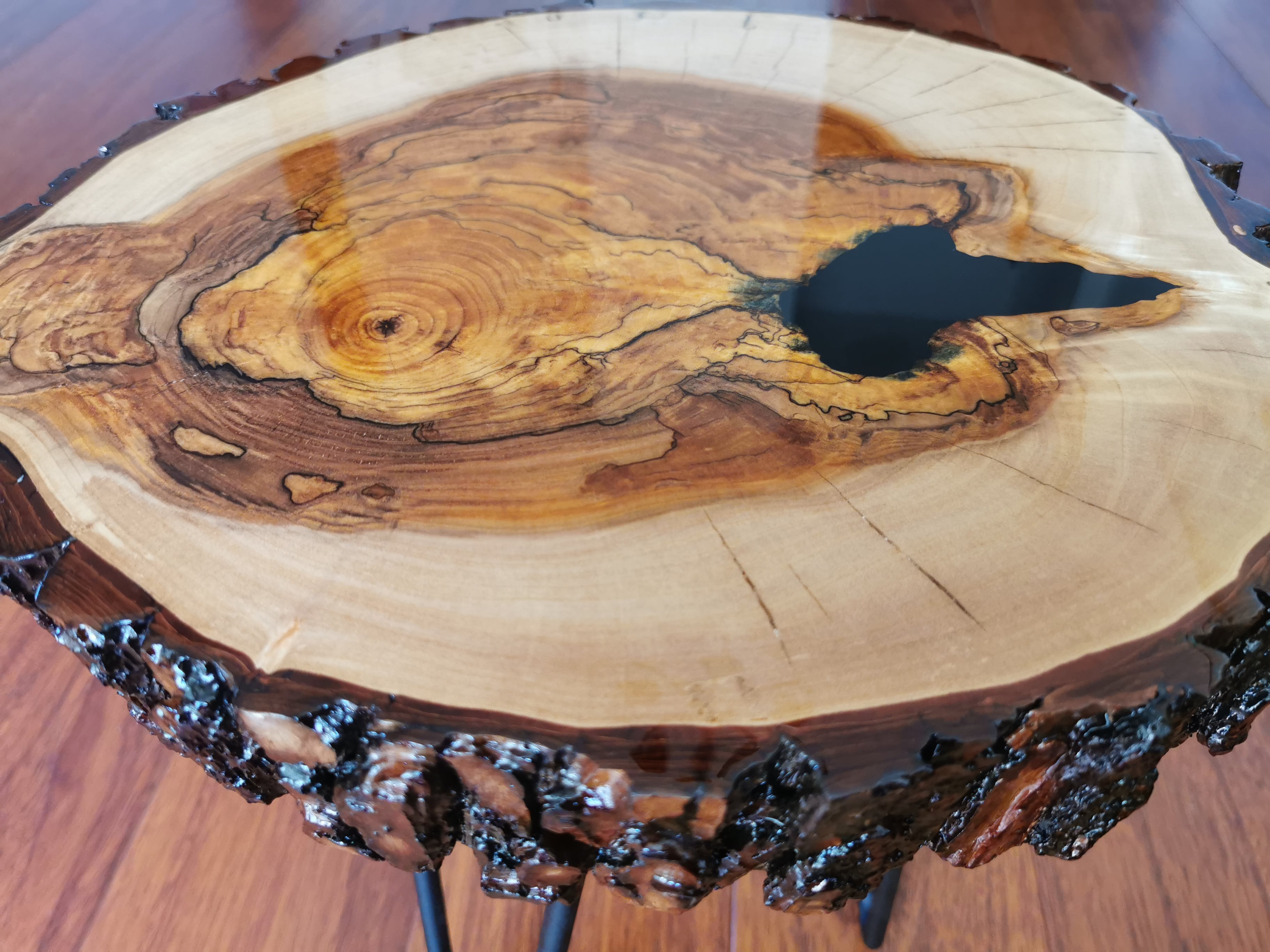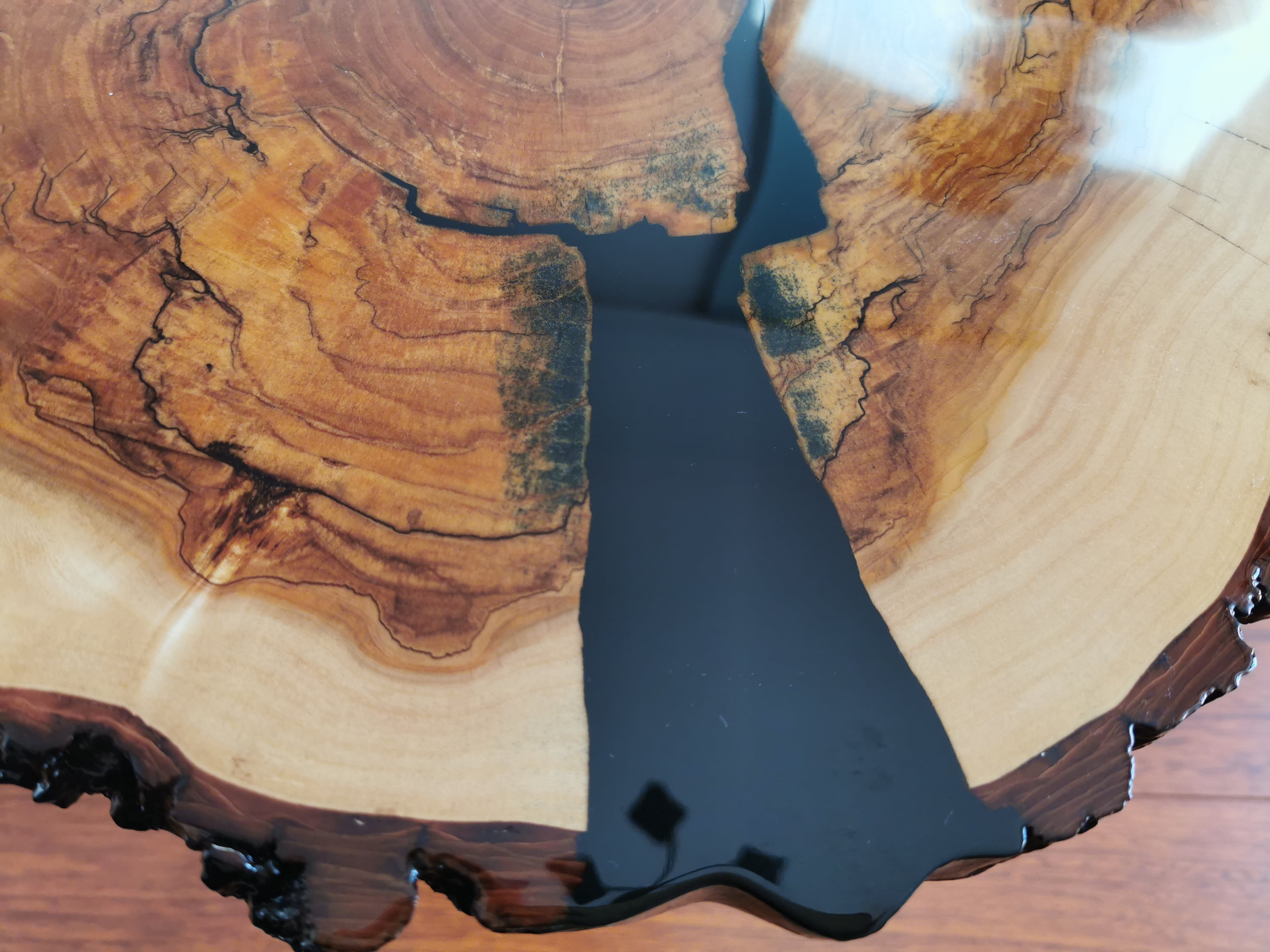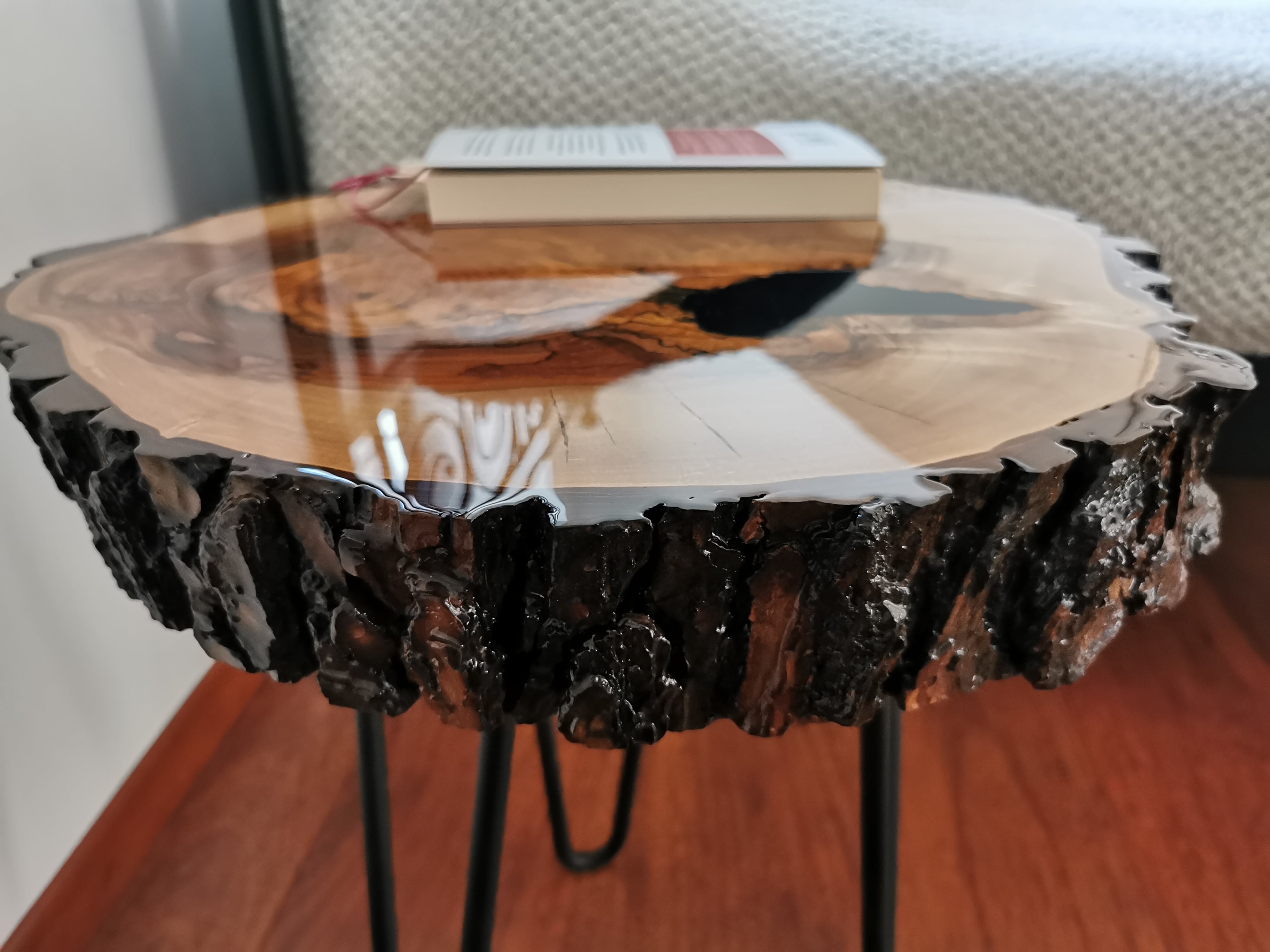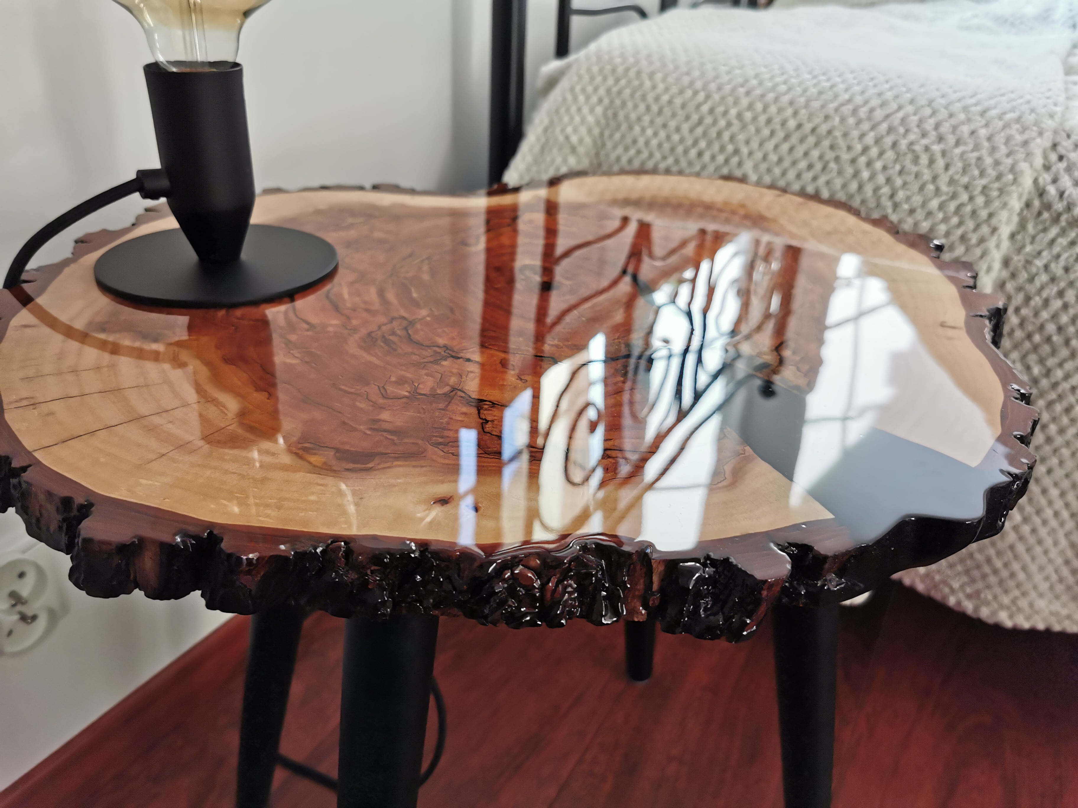 Przepiękne usłojenie wierzby w tym stoliku stawia go w gronie najciekawszych i najbardziej oryginalnych plastrów w mojej kolekcji. Obraz stworzony przez naturę naprawdę urzeka. Blat stołu zaimpregnowany i wzmocniony został żywicą epoksydową. Tą samą żywicą jest wykonany kanion w kolorze głębokiej czerni. Całość zabezpieczona z dwóch stron dwuskładnikowym lakierem poliuretanowym włoskiego producenta ICA. Lakier nanoszony pistoletem natryskowym. Wypolerowany na wysoki połysk. Nogi w stylu Hairpin wykonane z metalu.