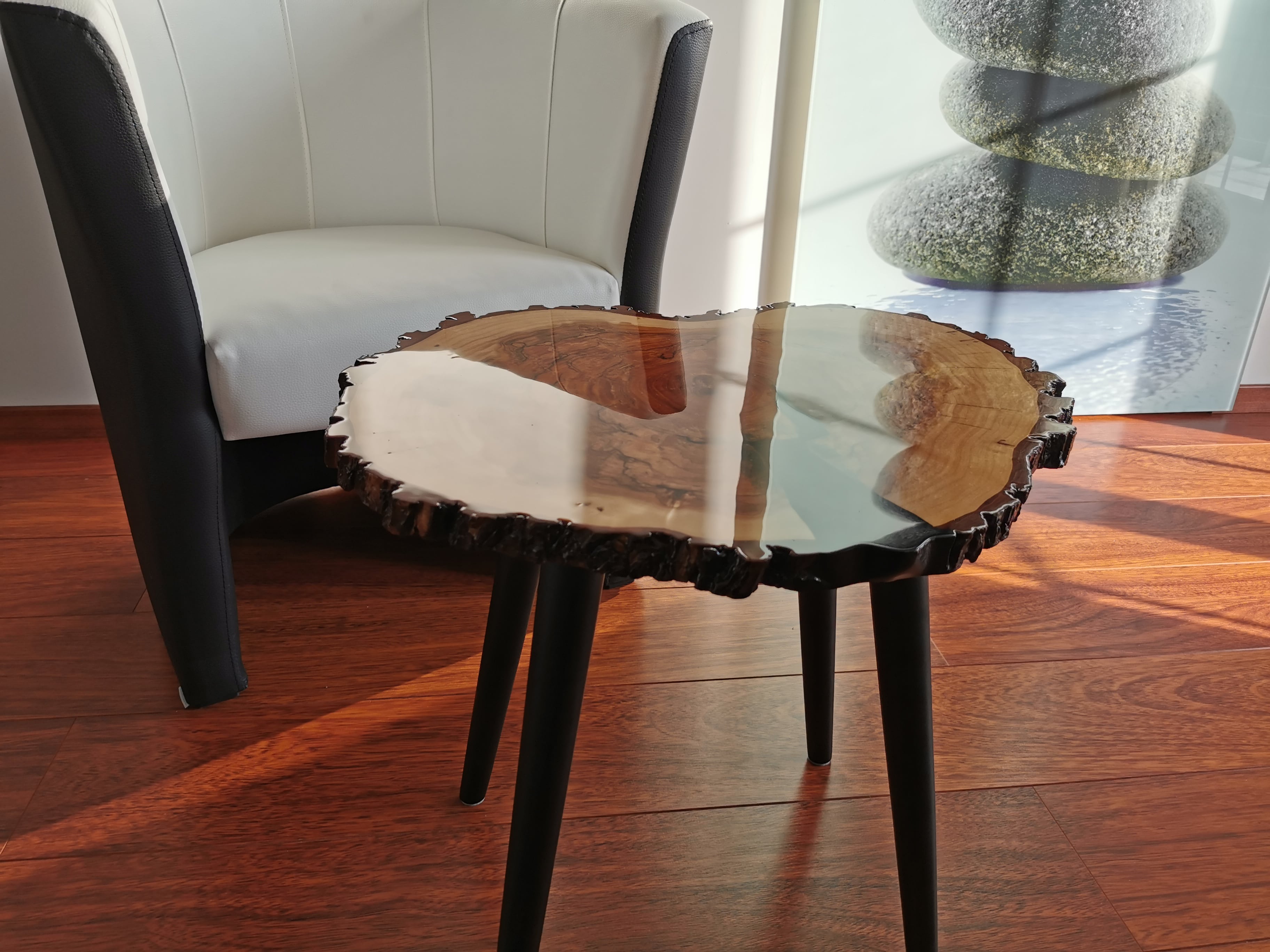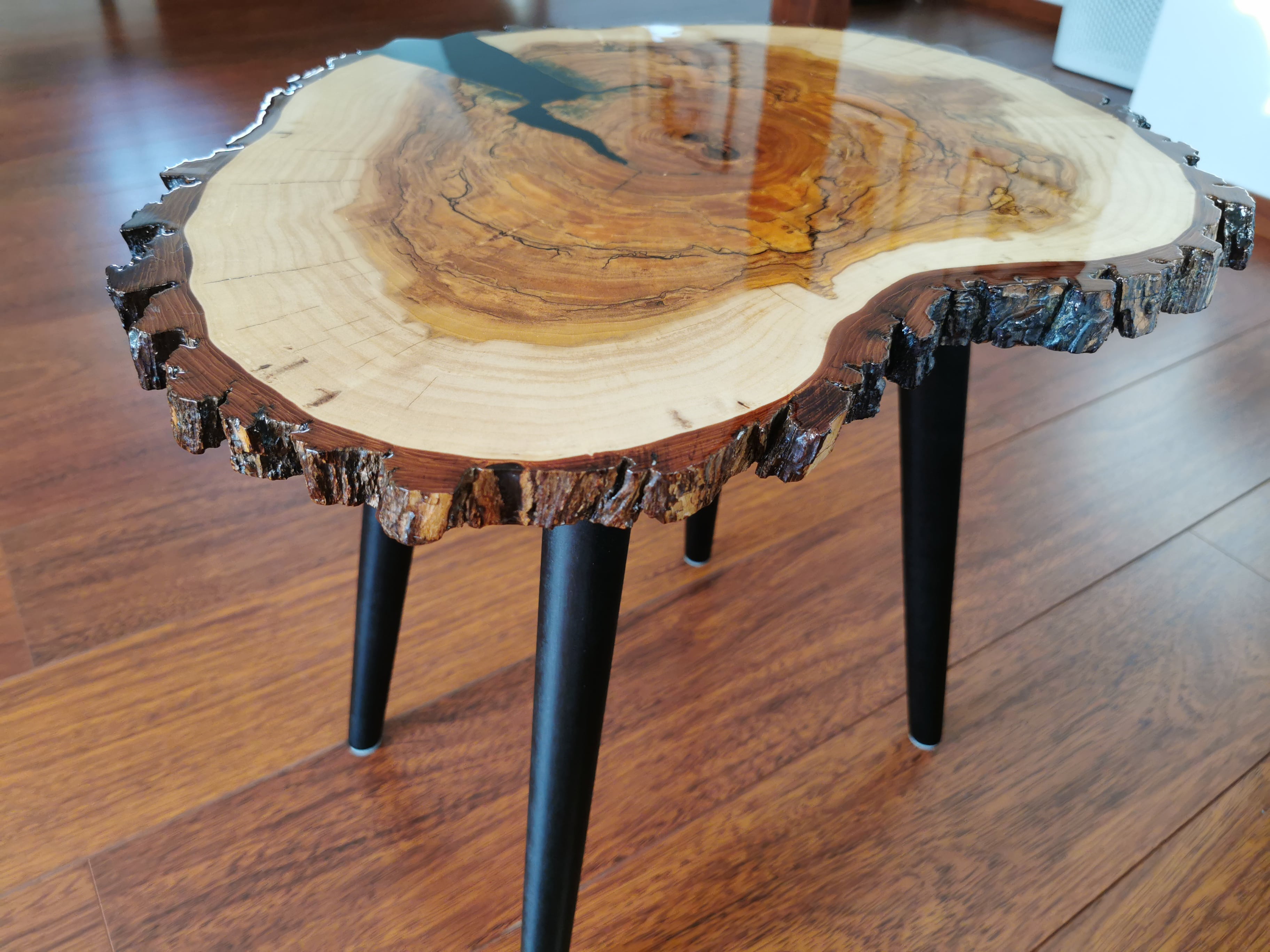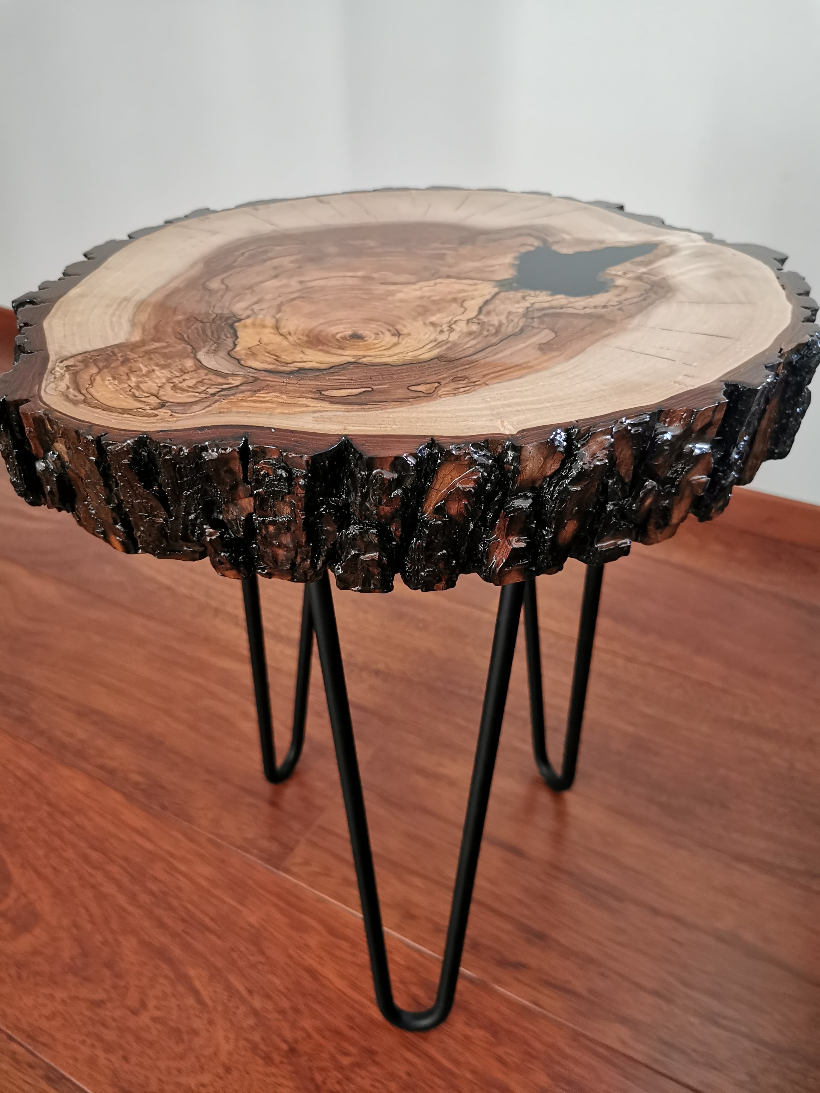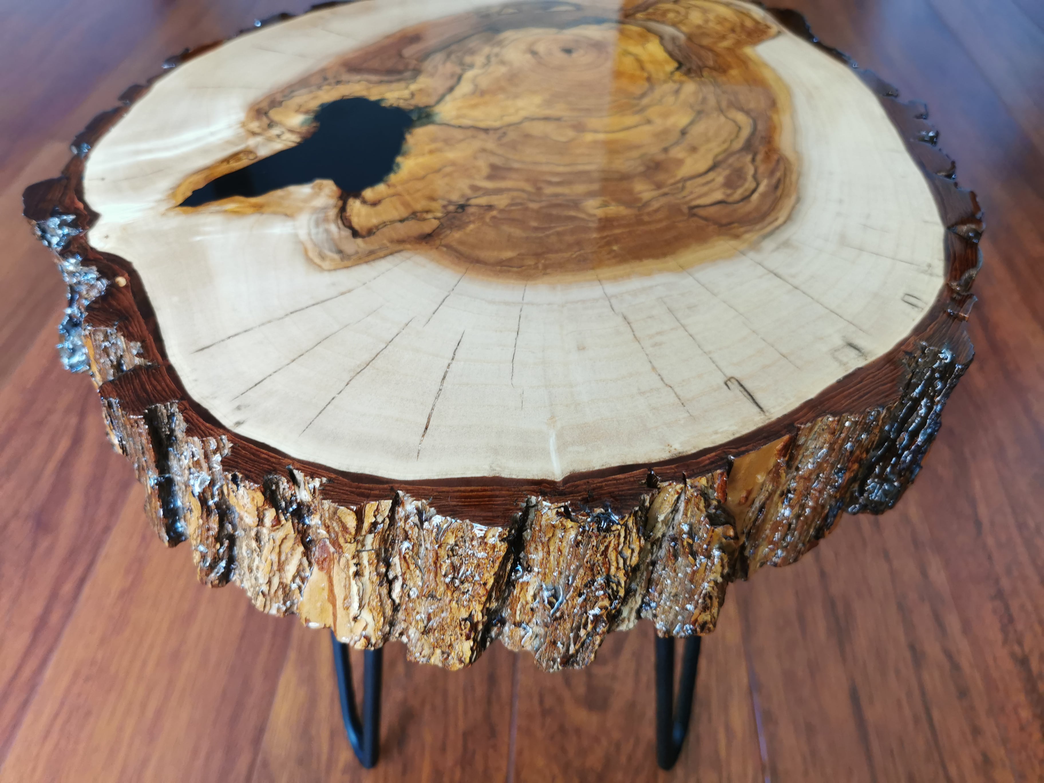 Przepiękne usłojenie wierzby w tym stoliku stawia go w gronie najciekawszych i najbardziej oryginalnych plastrów w mojej kolekcji. Obraz stworzony przez naturę naprawdę urzeka. Blat stołu zaimpregnowany i wzmocniony został żywicą epoksydową. Tą samą żywicą jest wykonany kanion w kolorze głębokiej czerni. Całość zabezpieczona z dwóch stron dwuskładnikowym lakierem poliuretanowym włoskiego producenta ICA. Lakier nanoszony pistoletem natryskowym. Wypolerowany na wysoki połysk. Nogi w stylu Hairpin wykonane z metalu.
