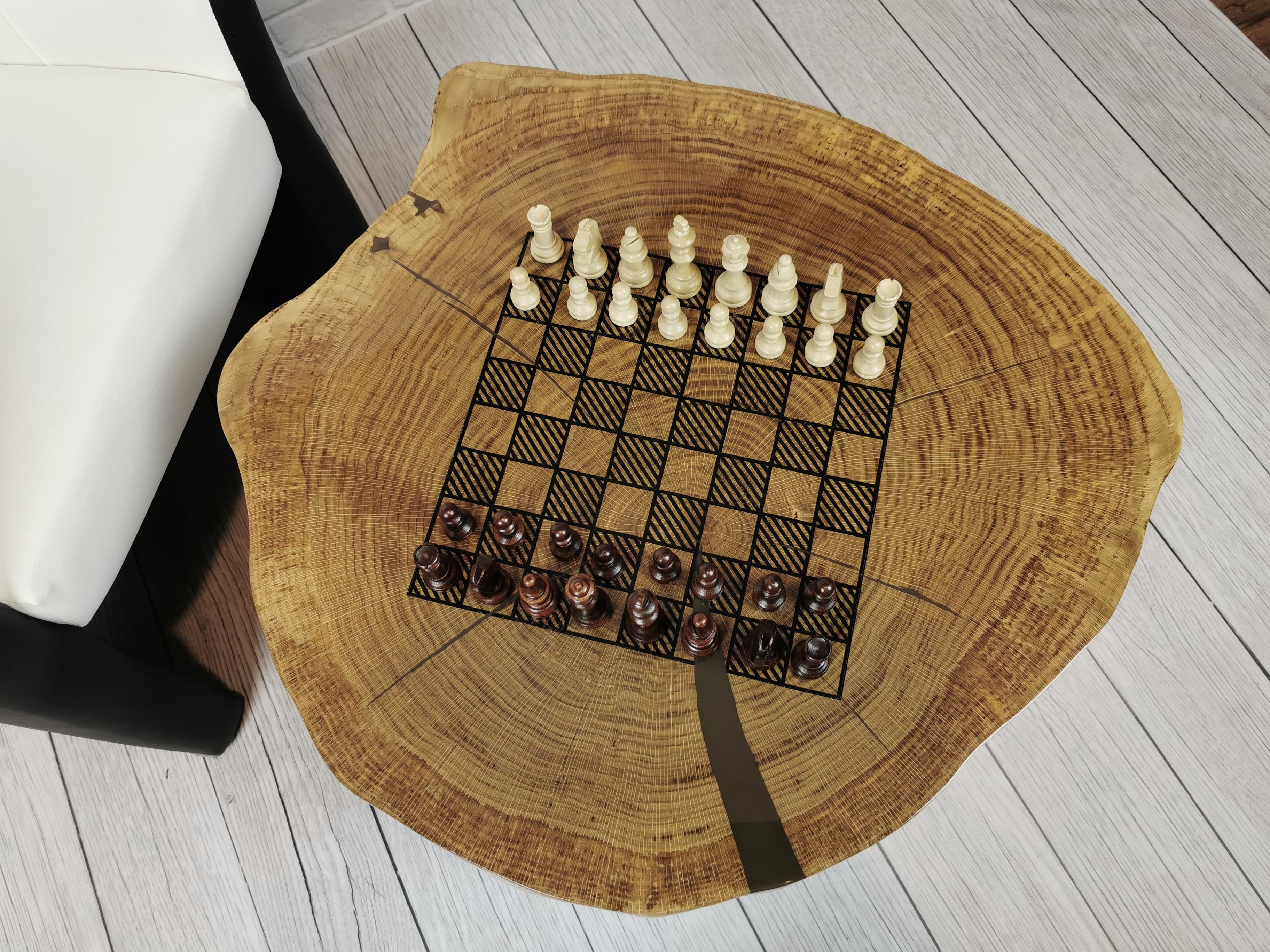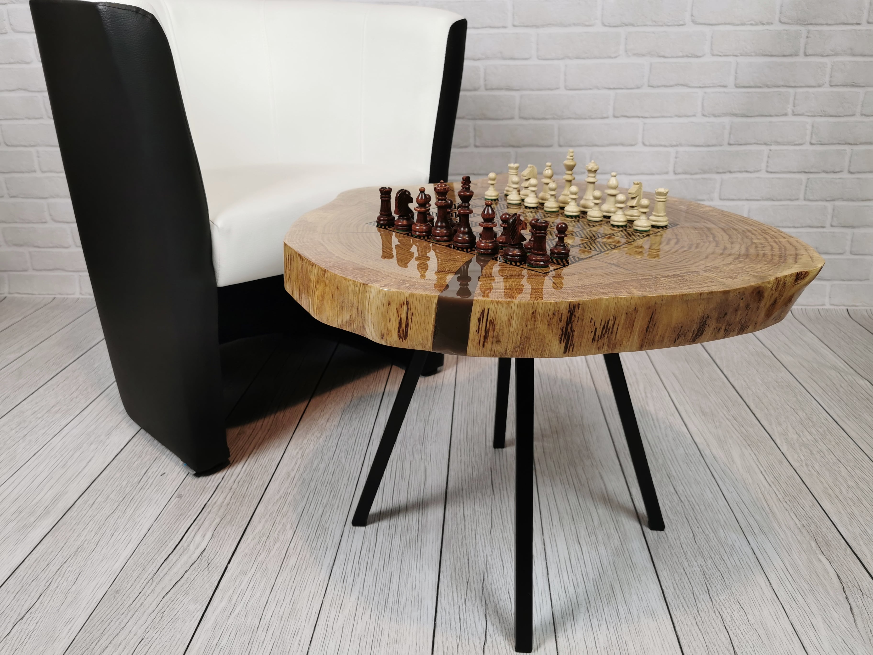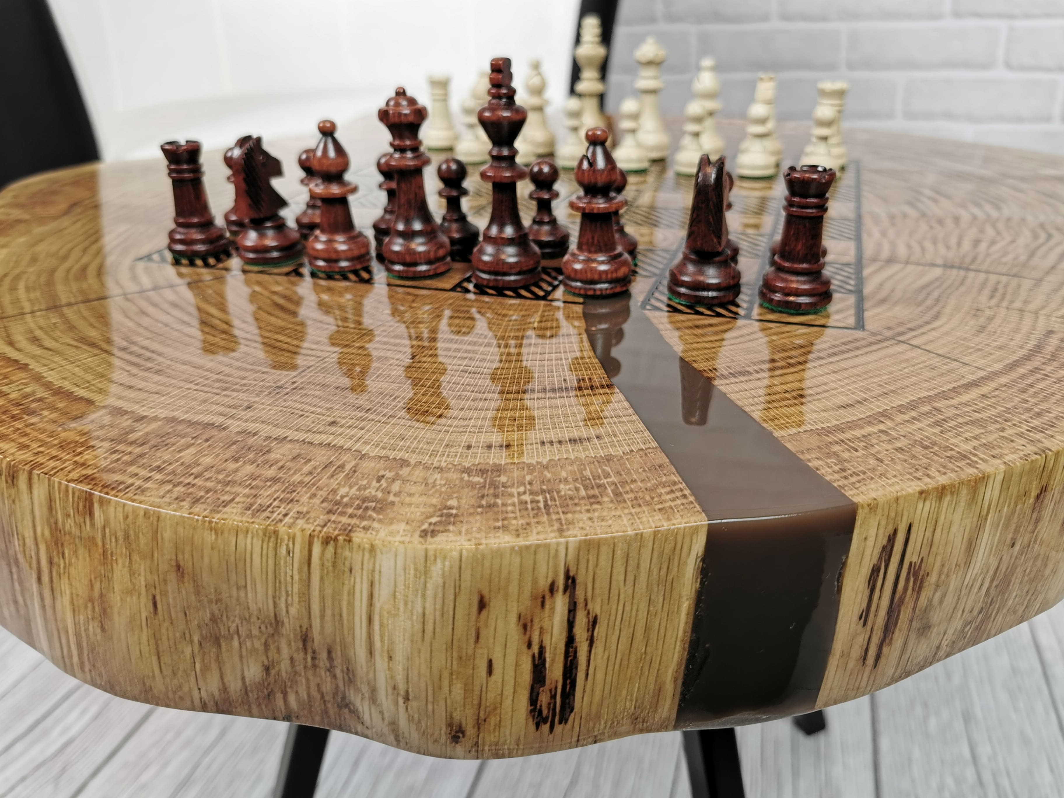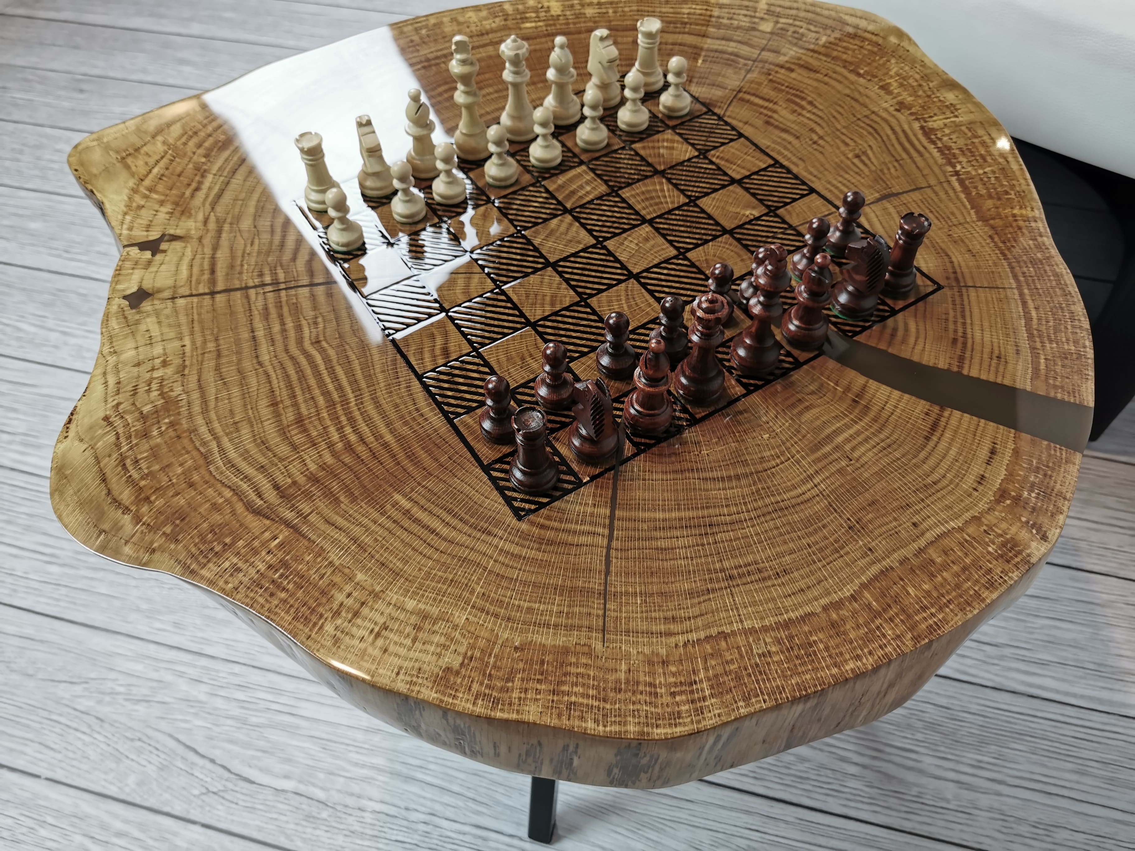 Idealny prezent dla szachisty. Niepowtarzalny stolik kawowy z wygrawerowaną laserem szachownicą. Blat wykonany z oryginalnego dużego plastra dębu. Zaimpregnowany żywicą, wyszlifowany i polakierowany na wysoki połysk. Głębokie grawerowanie stwarza przyjemną w dotyku fakturę szachownicy, która na tle tafli lakieru daje piękny efekt. W komplecie ze stołem zestaw drewnianych ręcznie robionych figur szachowych No.4 w dedykowanym kuferku. Nogi stołu metalowe skośne w stylu LOFT w czarnym kolorze.