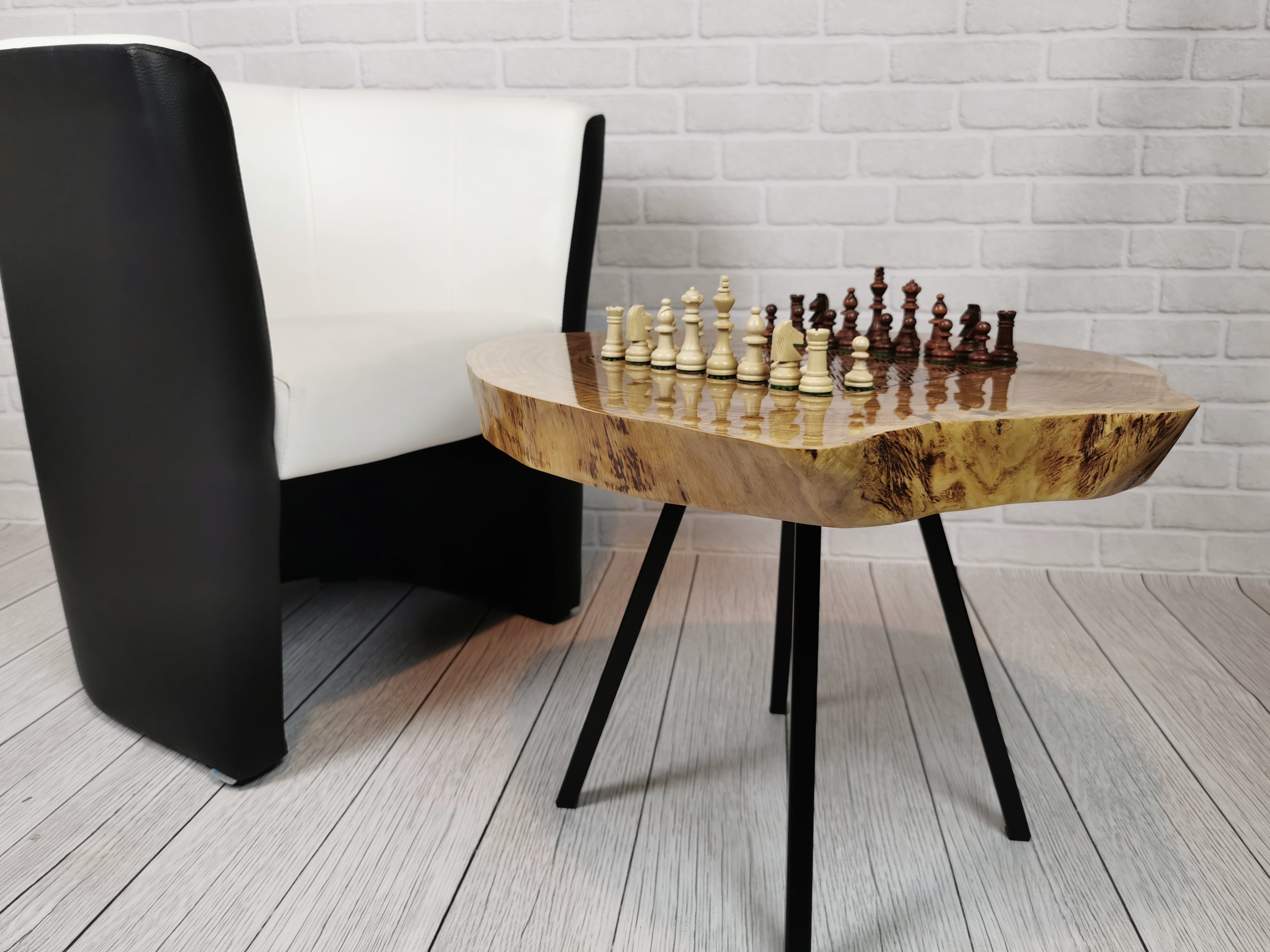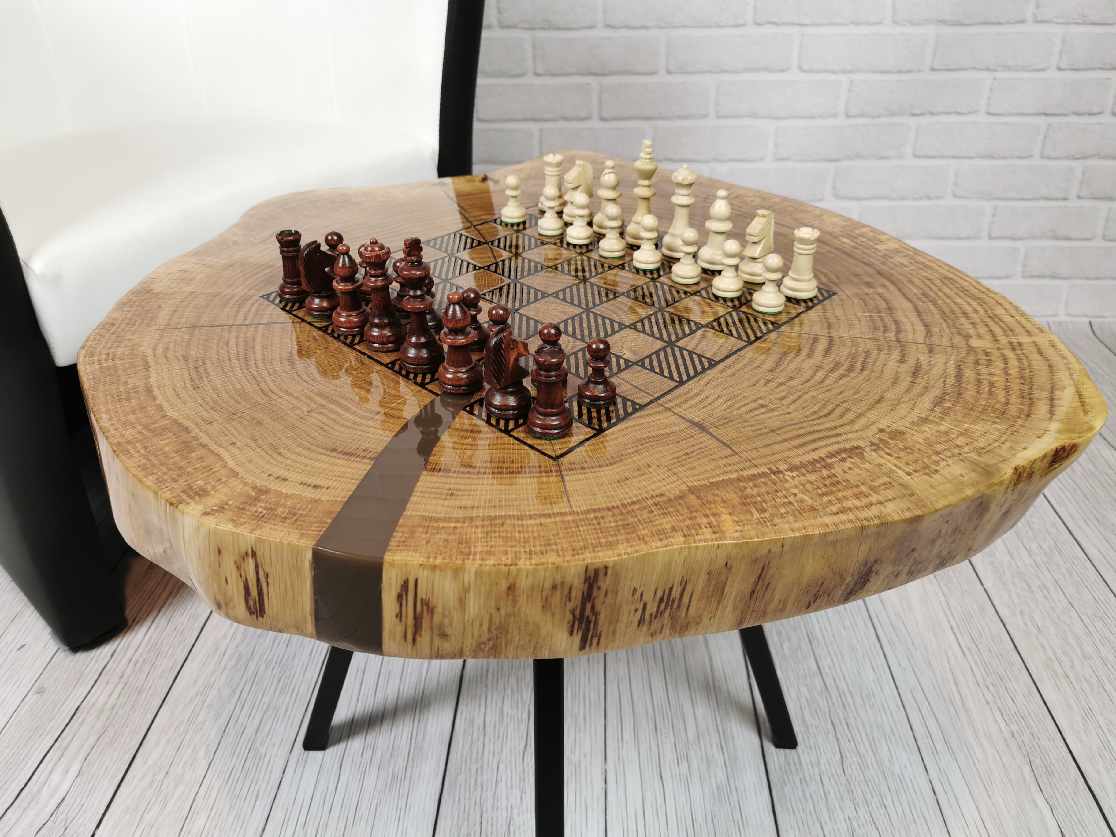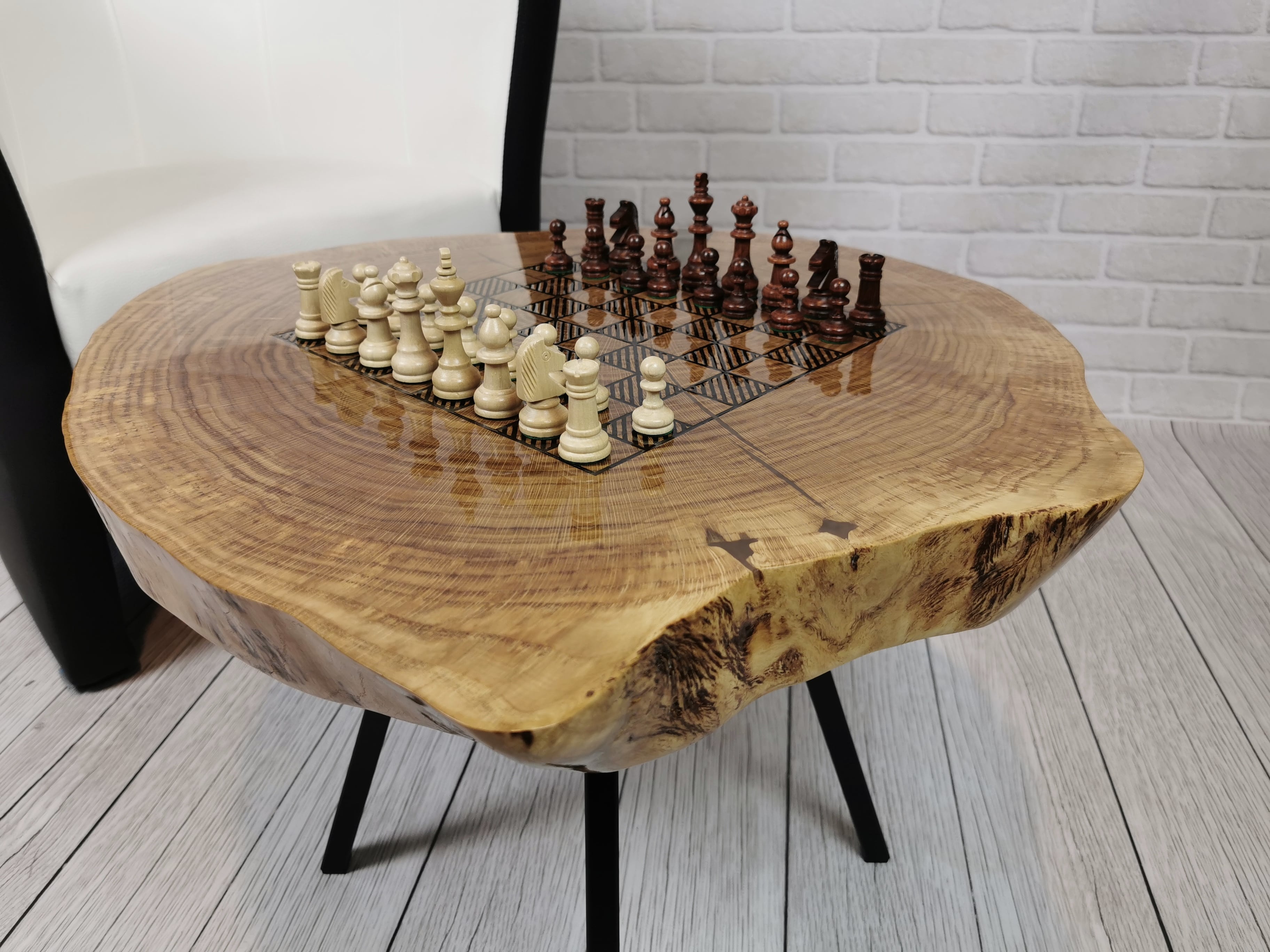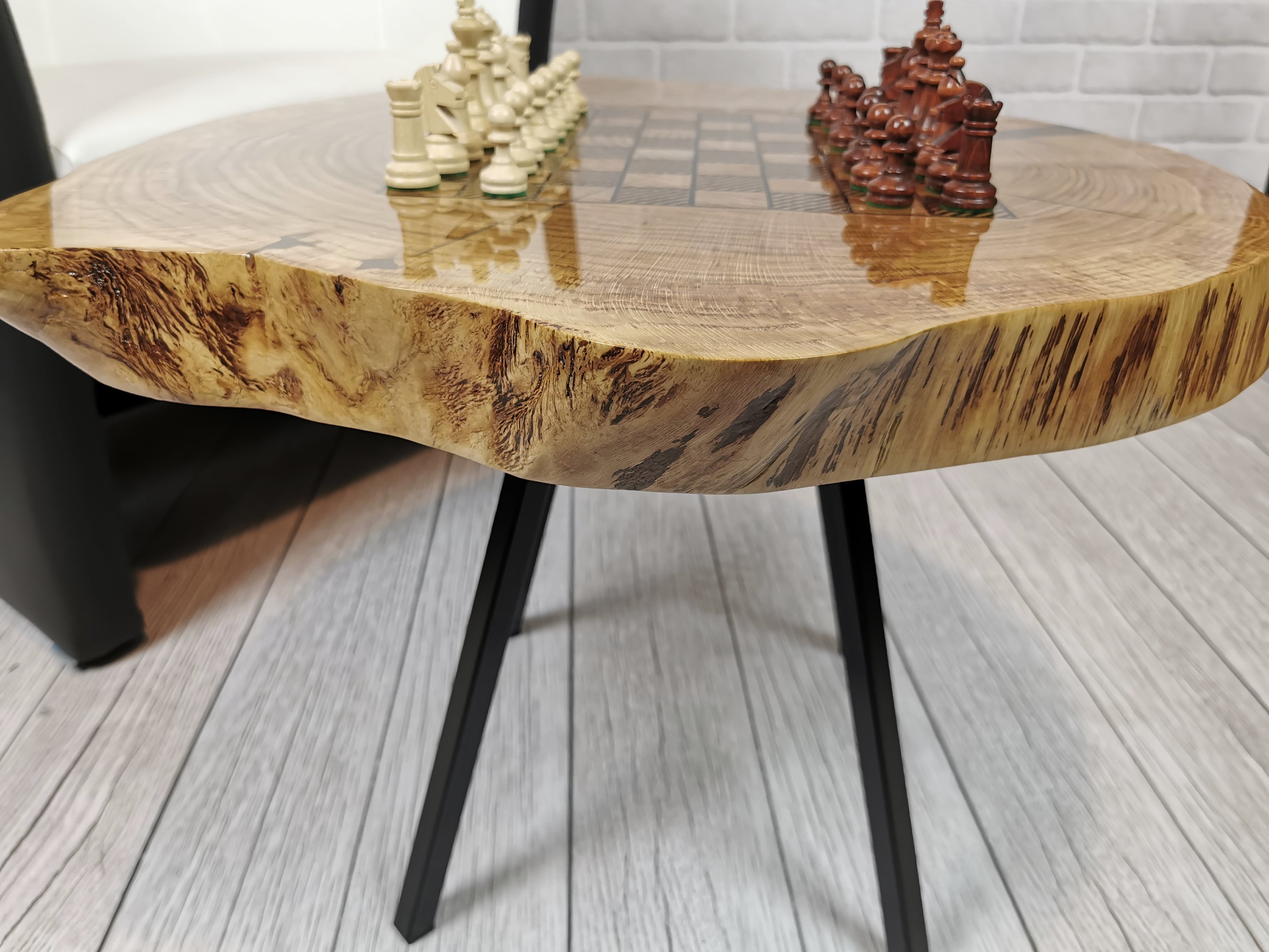 Idealny prezent dla szachisty. Niepowtarzalny stolik kawowy z wygrawerowaną laserem szachownicą. Blat wykonany z oryginalnego dużego plastra dębu. Zaimpregnowany żywicą, wyszlifowany i polakierowany na wysoki połysk. Głębokie grawerowanie stwarza przyjemną w dotyku fakturę szachownicy, która na tle tafli lakieru daje piękny efekt. W komplecie ze stołem zestaw drewnianych ręcznie robionych figur szachowych No.4 w dedykowanym kuferku. Nogi stołu metalowe skośne w stylu LOFT w czarnym kolorze.