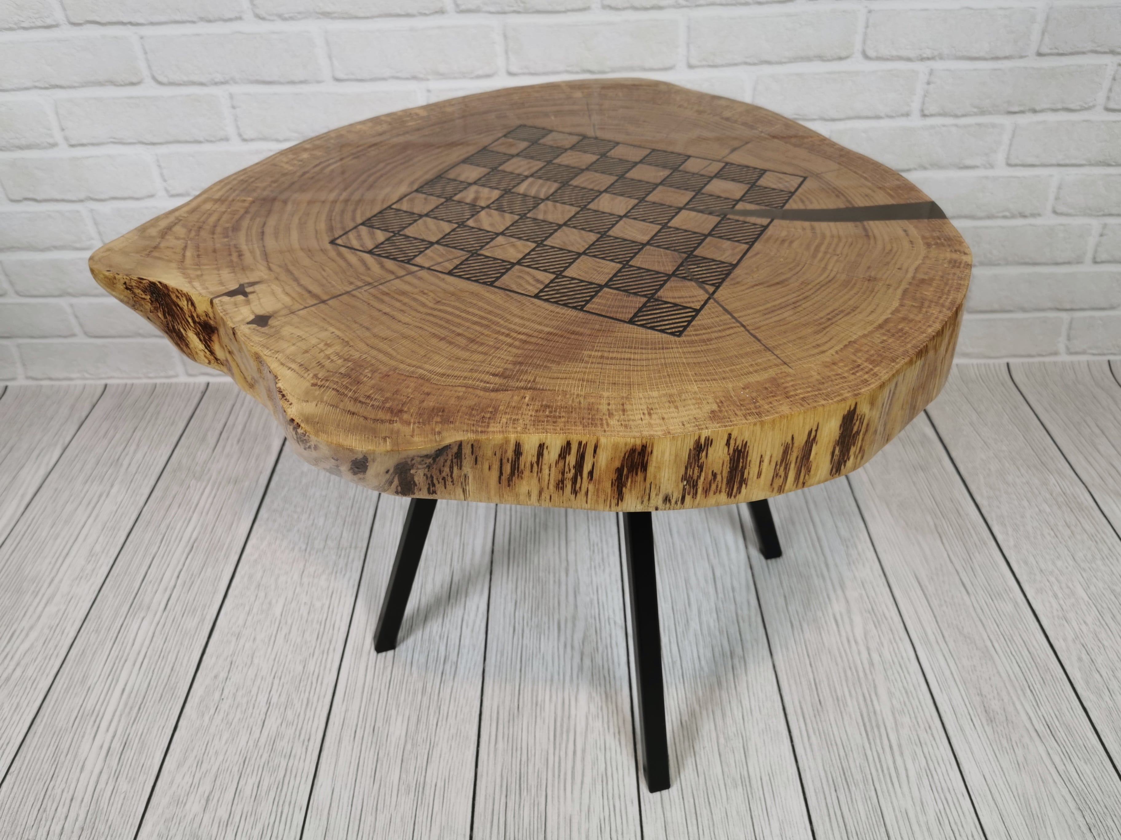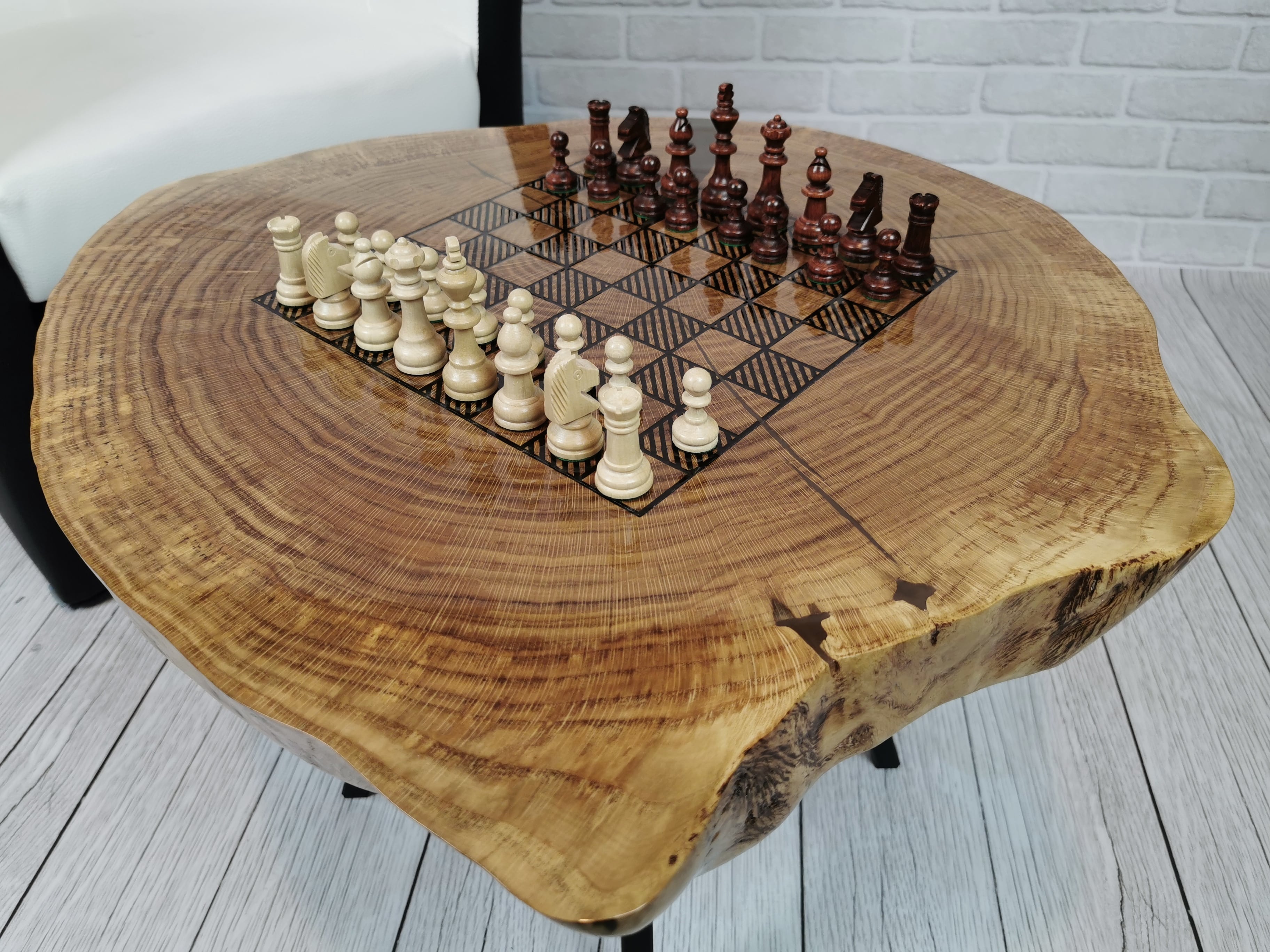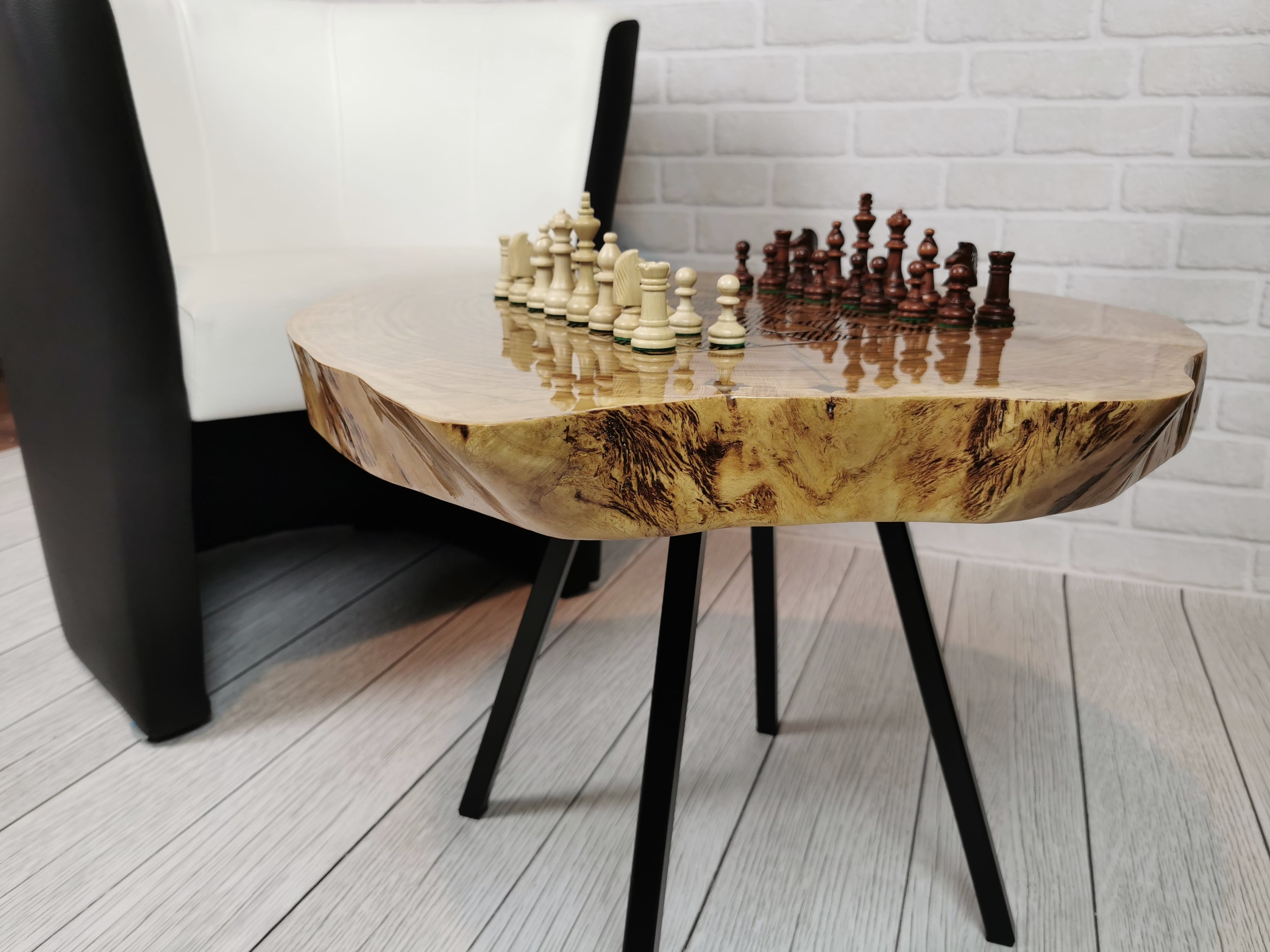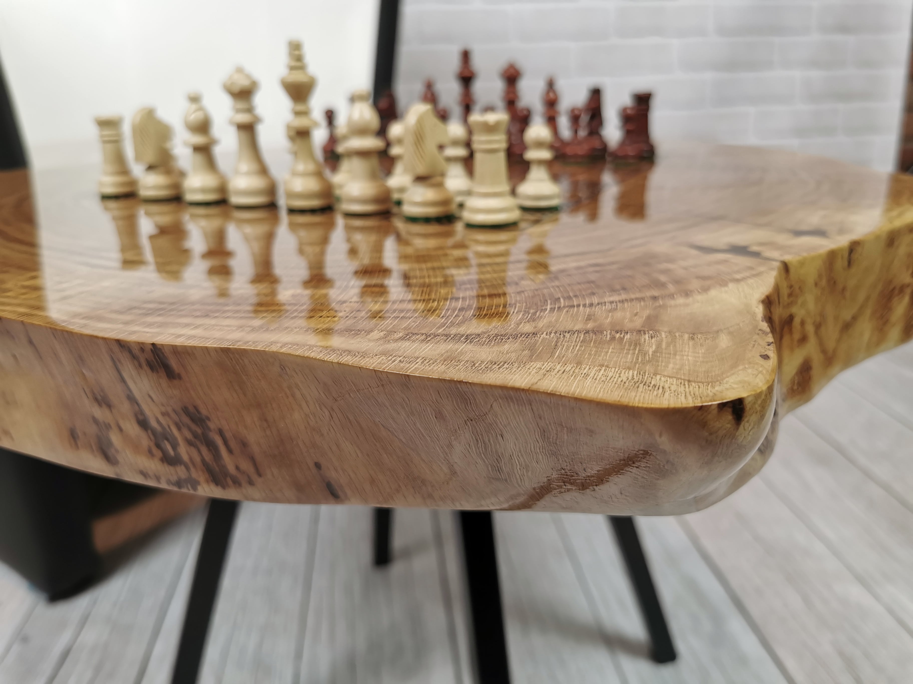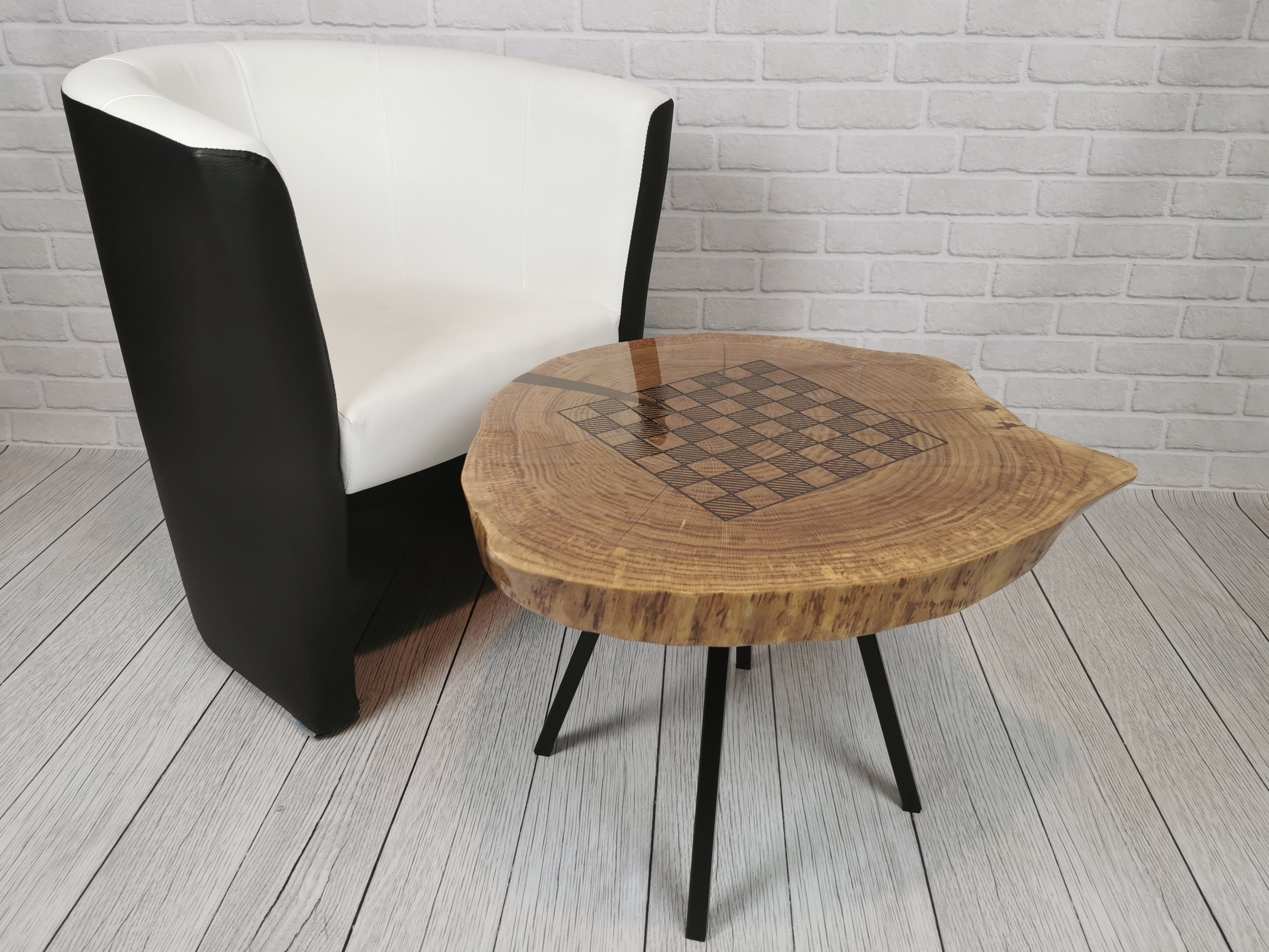 Idealny prezent dla szachisty. Niepowtarzalny stolik kawowy z wygrawerowaną laserem szachownicą. Blat wykonany z oryginalnego dużego plastra dębu. Zaimpregnowany żywicą, wyszlifowany i polakierowany na wysoki połysk. Głębokie grawerowanie stwarza przyjemną w dotyku fakturę szachownicy, która na tle tafli lakieru daje piękny efekt. W komplecie ze stołem zestaw drewnianych ręcznie robionych figur szachowych No.4 w dedykowanym kuferku. Nogi stołu metalowe skośne w stylu LOFT w czarnym kolorze.