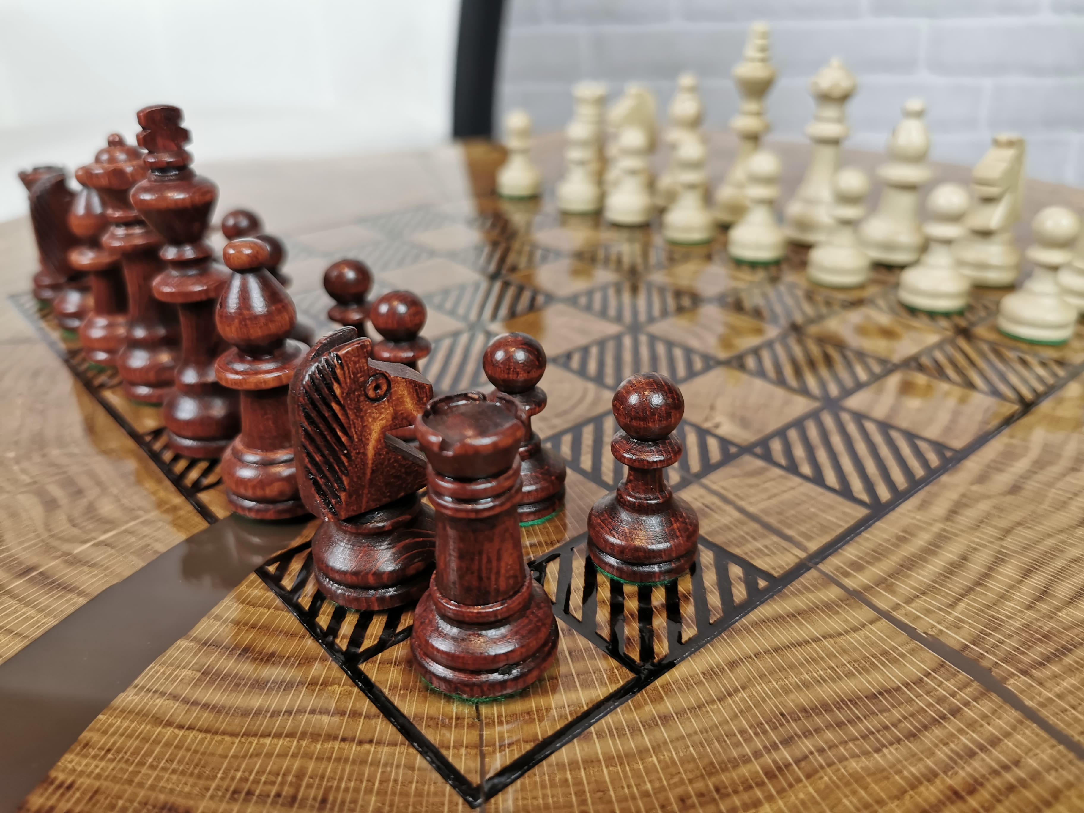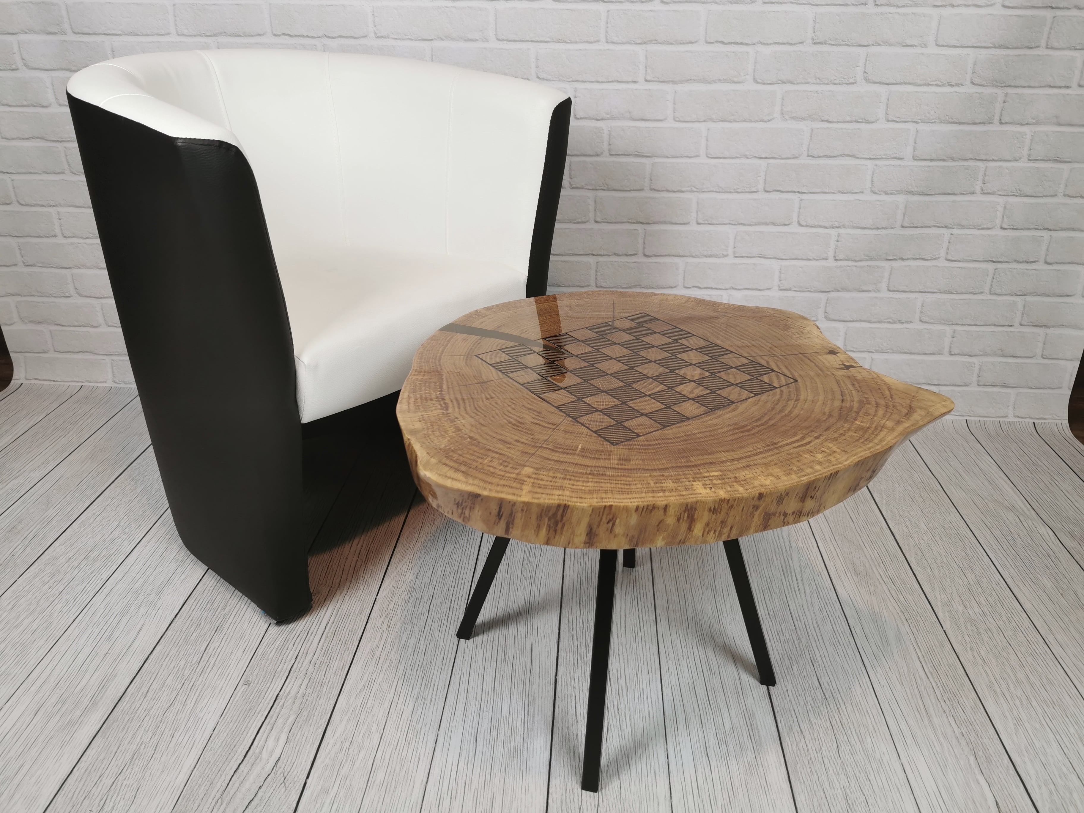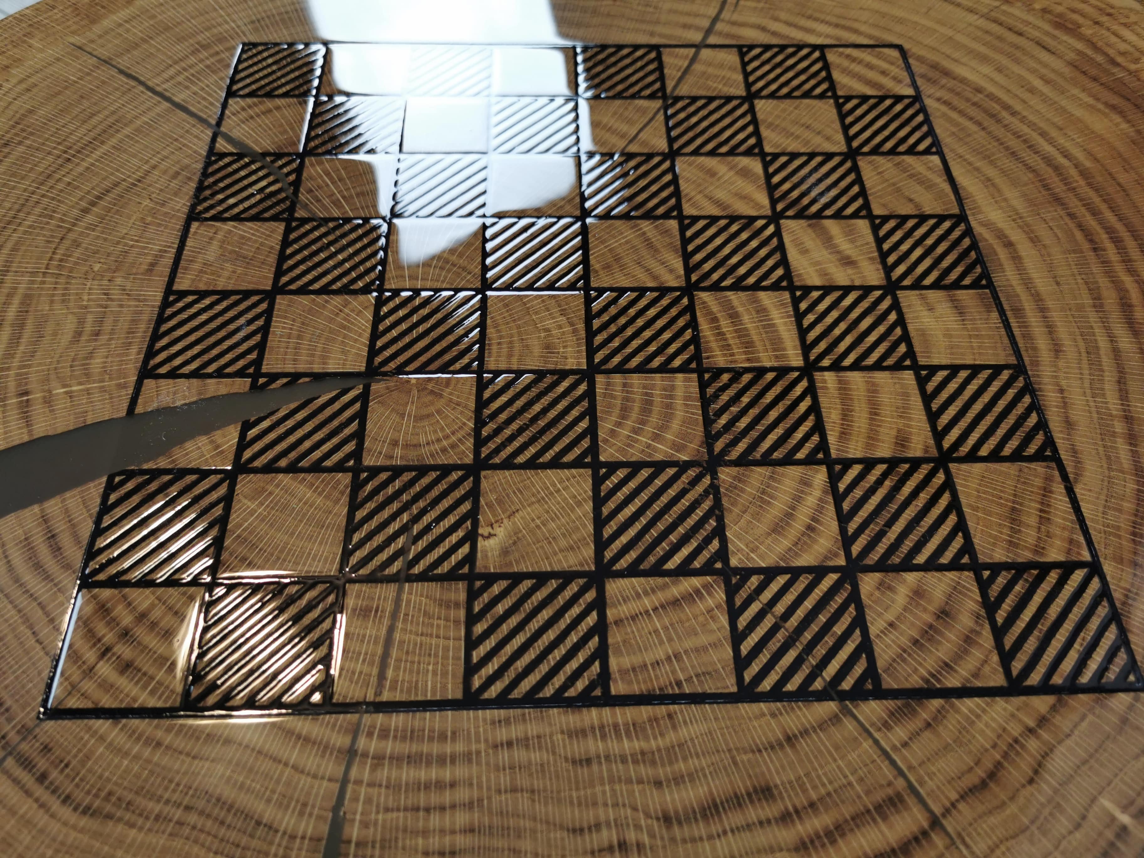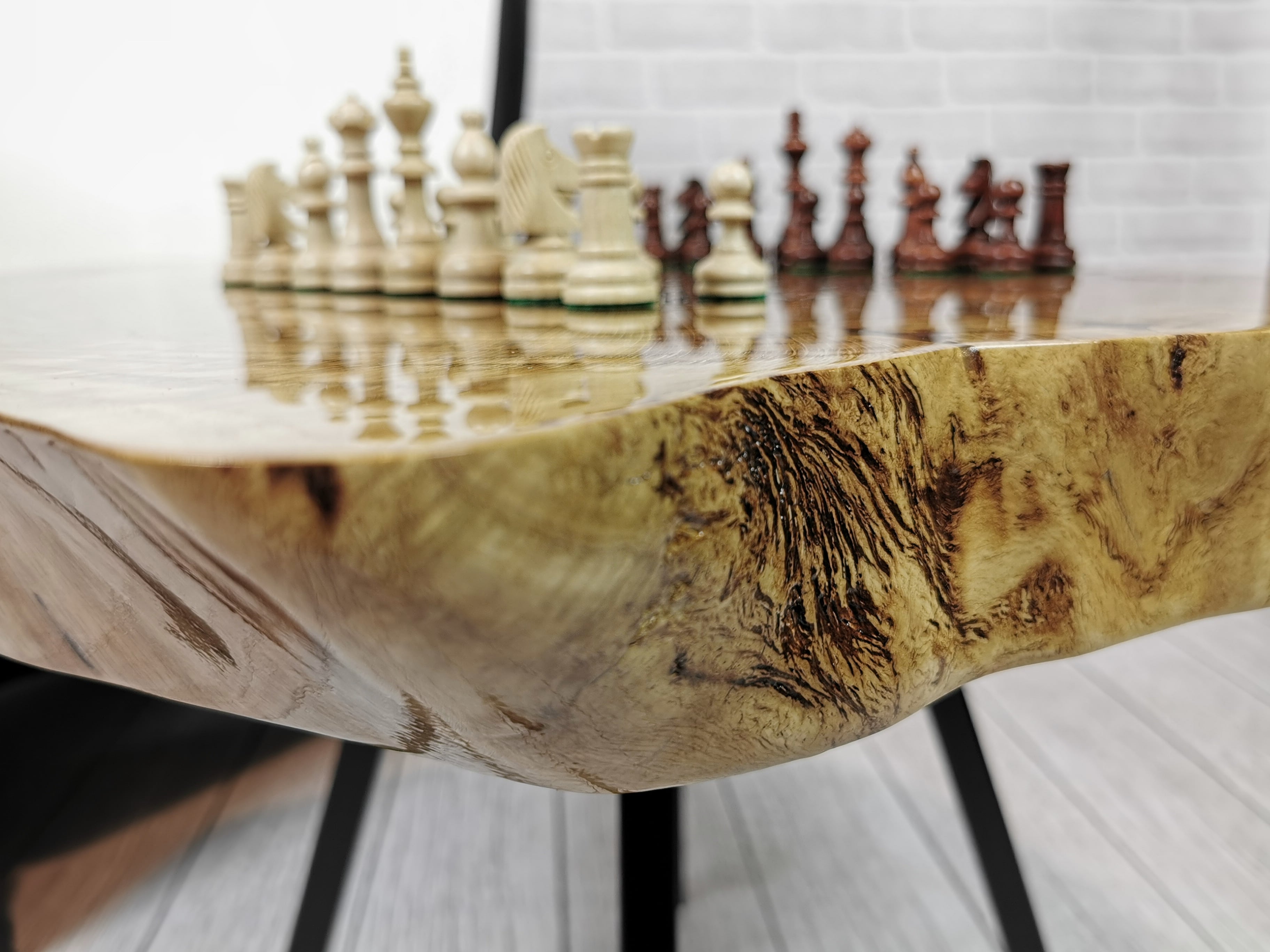 Idealny prezent dla szachisty. Niepowtarzalny stolik kawowy z wygrawerowaną laserem szachownicą. Blat wykonany z oryginalnego dużego plastra dębu. Zaimpregnowany żywicą, wyszlifowany i polakierowany na wysoki połysk. Głębokie grawerowanie stwarza przyjemną w dotyku fakturę szachownicy, która na tle tafli lakieru daje piękny efekt. W komplecie ze stołem zestaw drewnianych ręcznie robionych figur szachowych No.4 w dedykowanym kuferku. Nogi stołu metalowe skośne w stylu LOFT w czarnym kolorze.