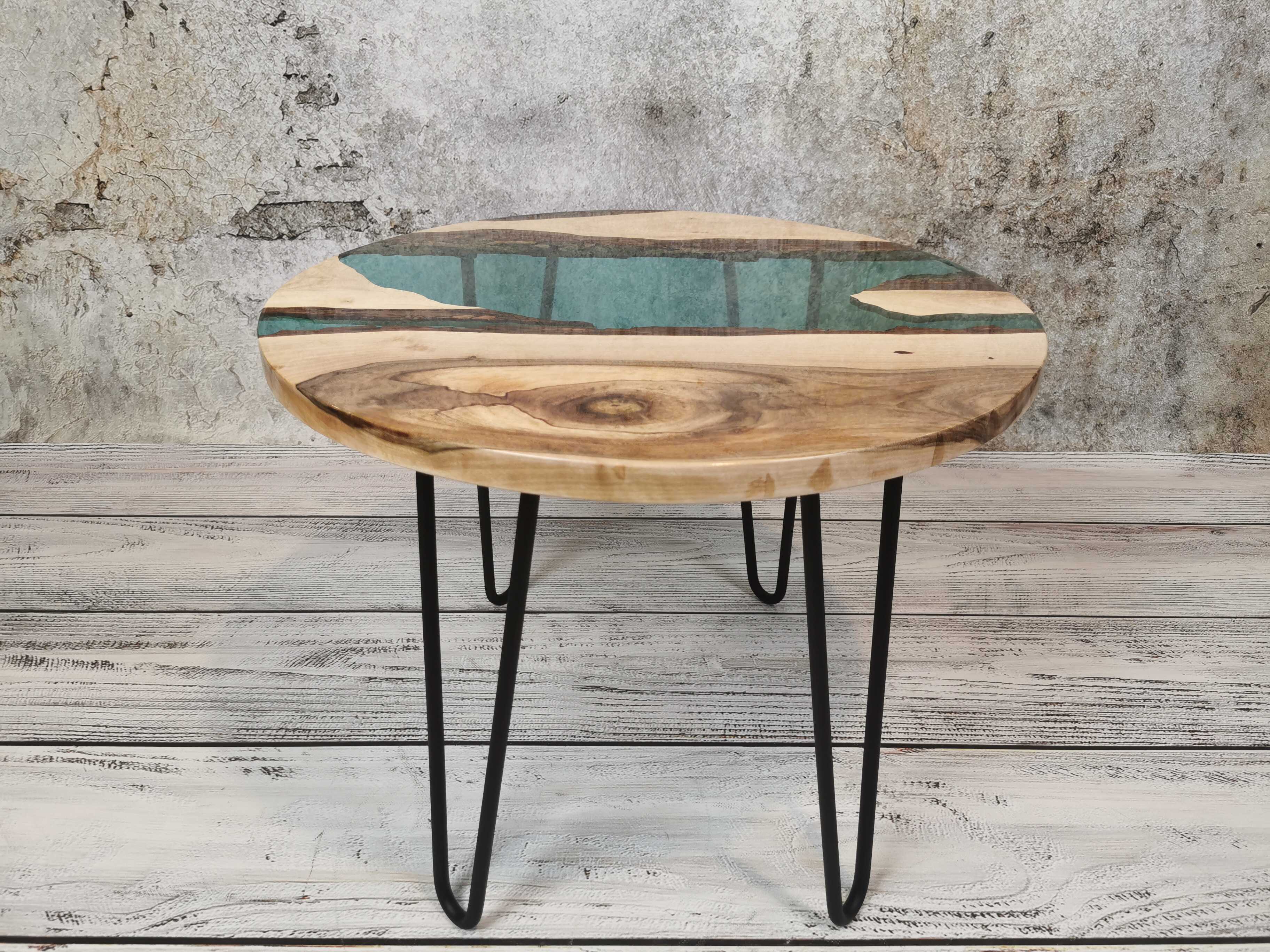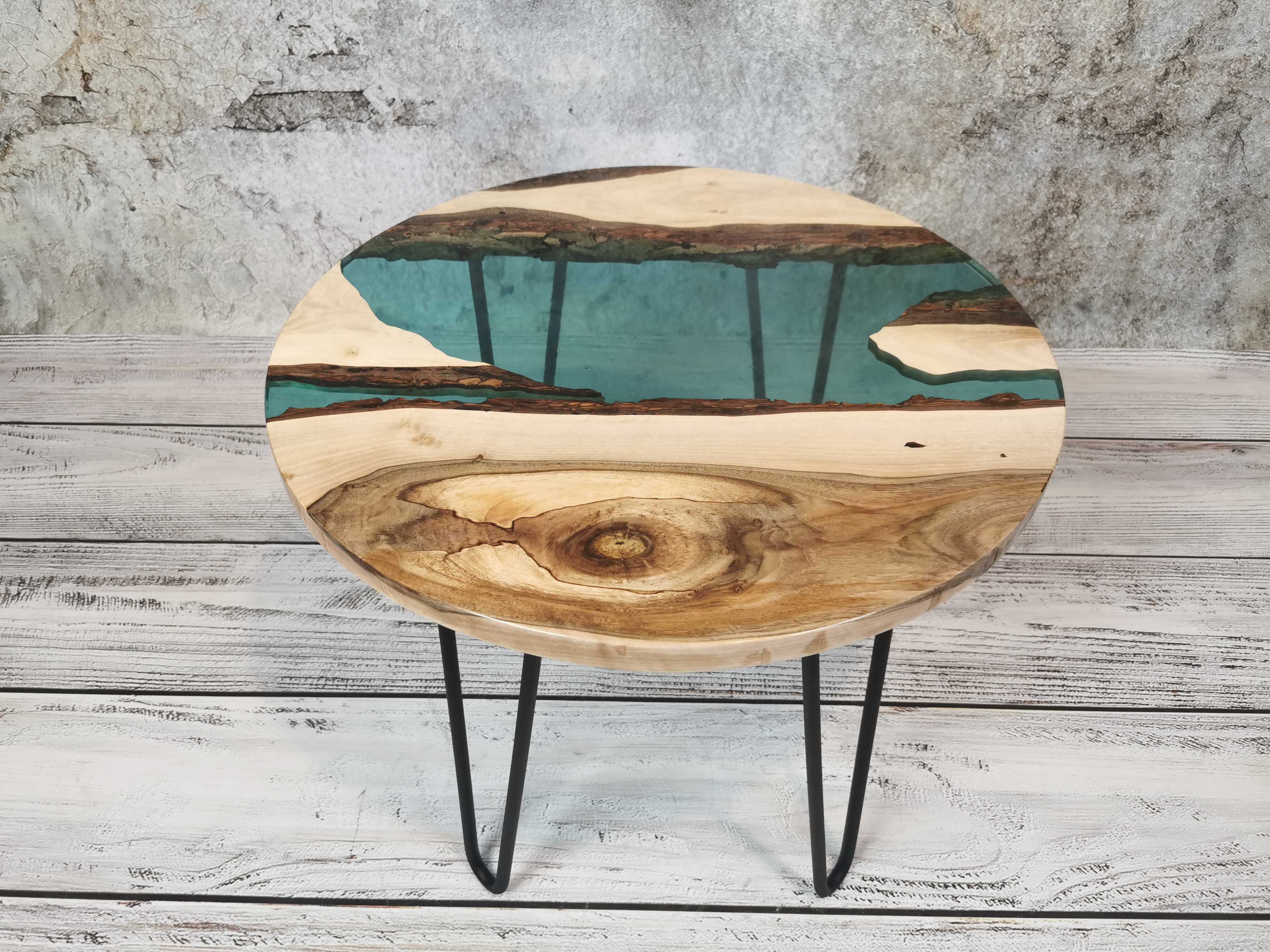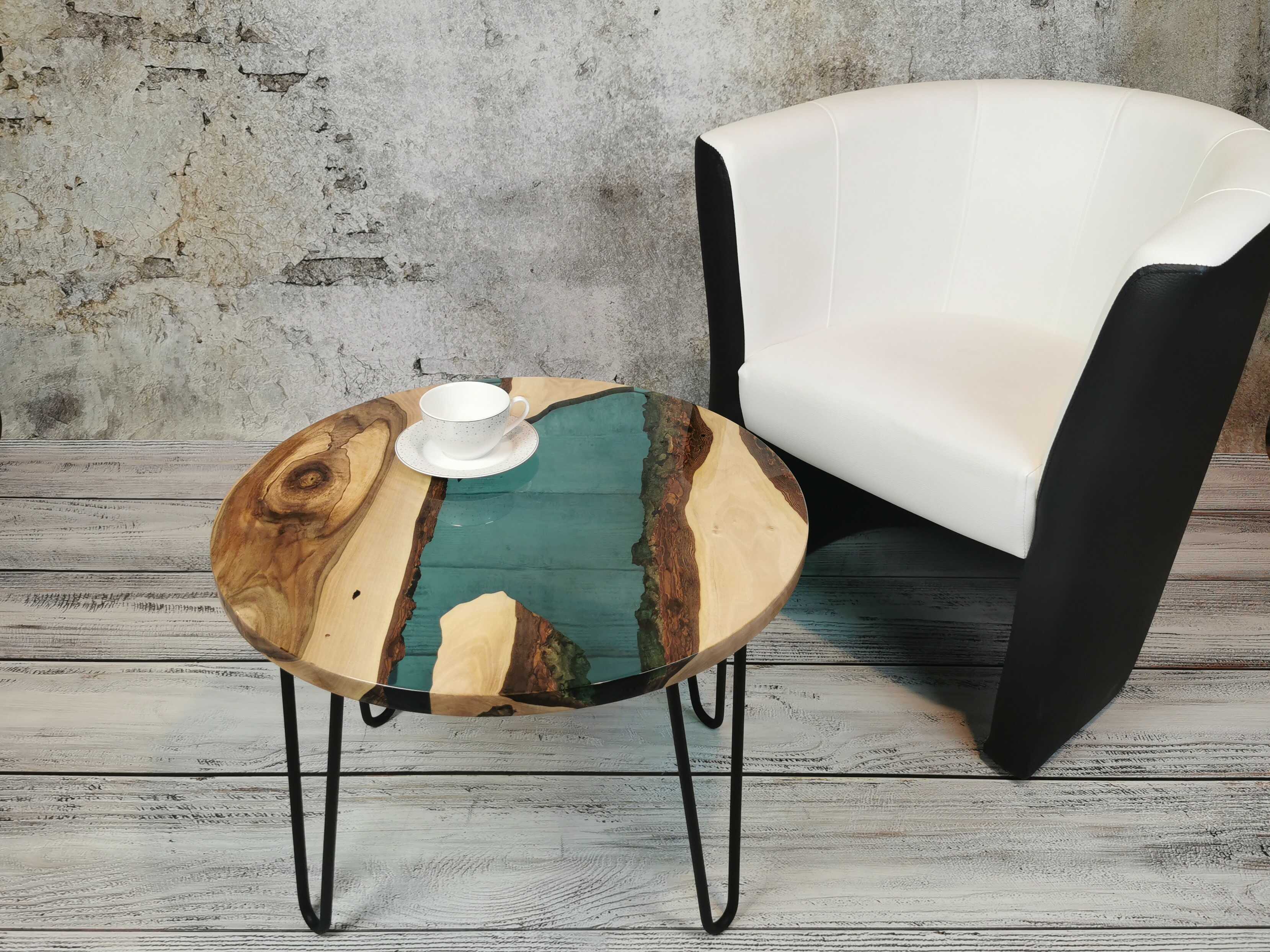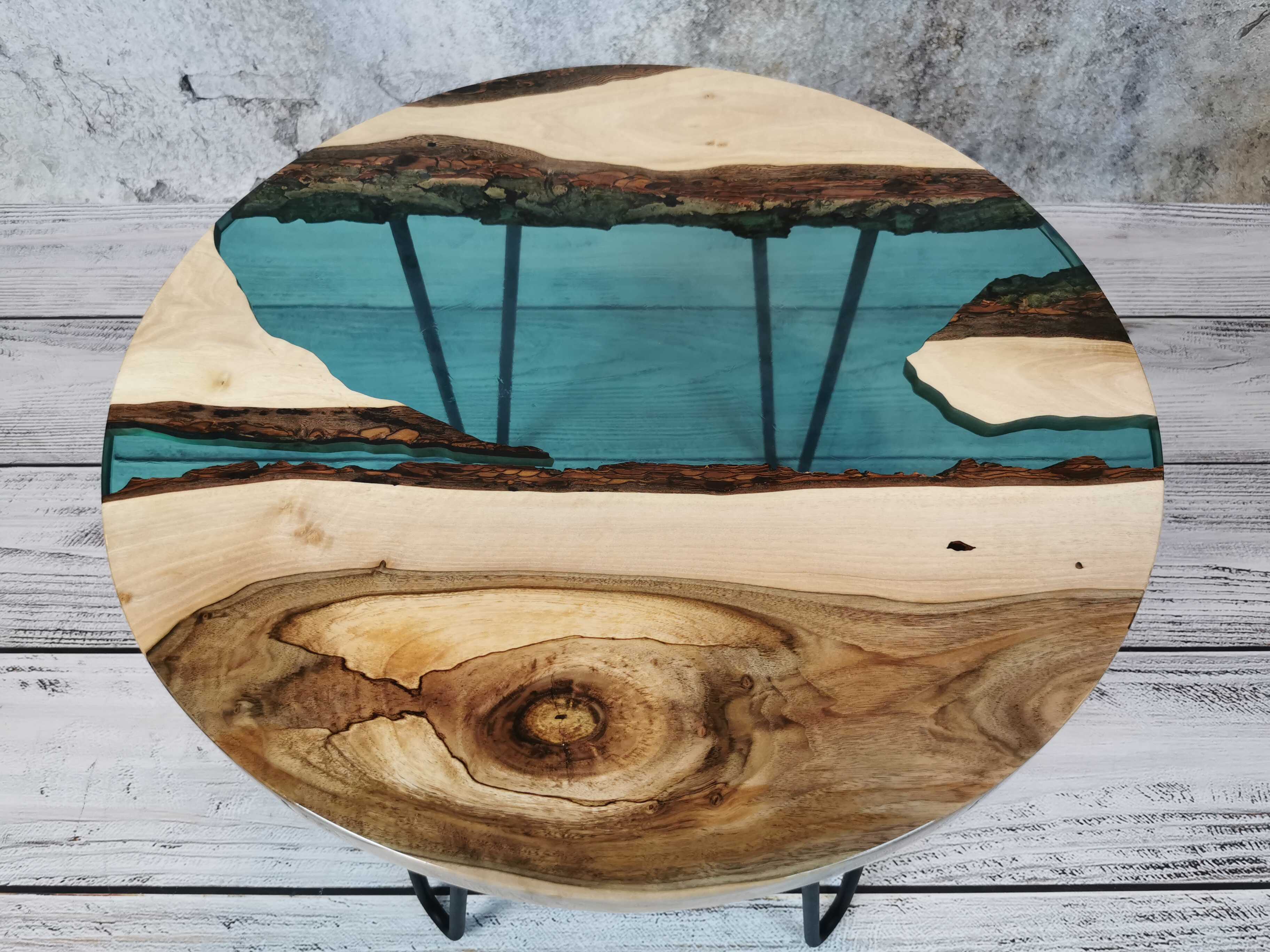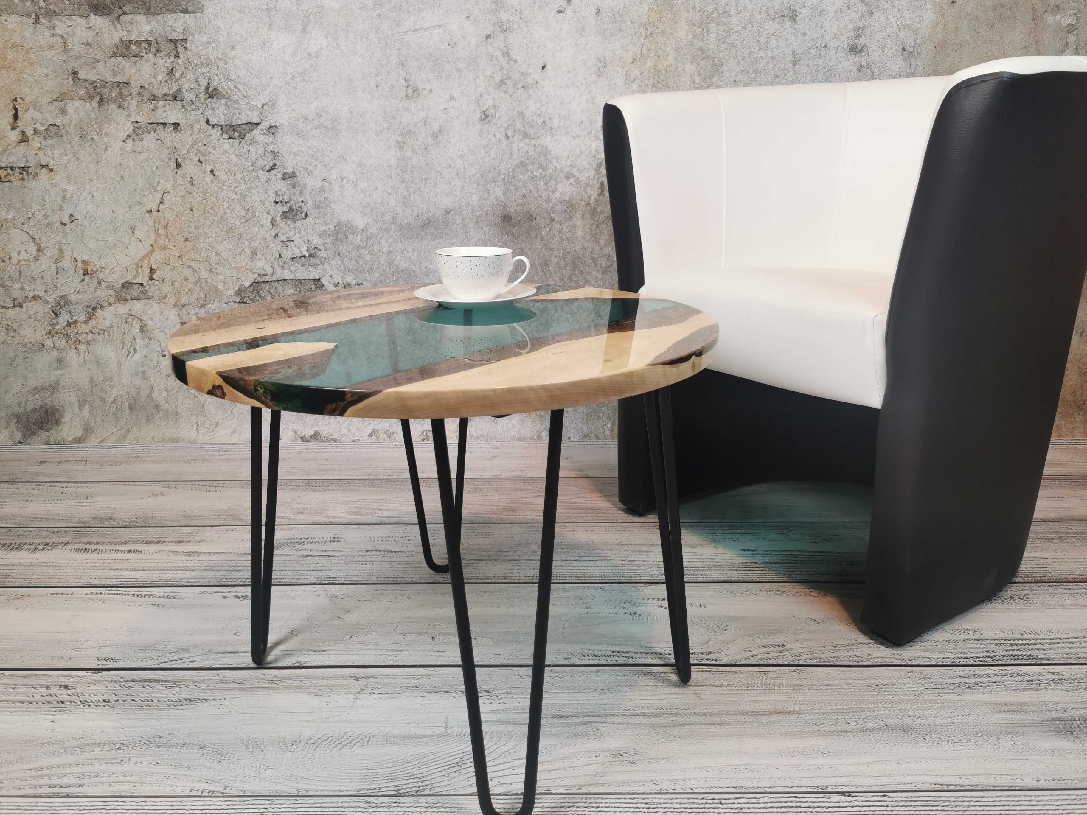 Przez środek blatu biegnie pas turkusowej żywicy epoksydowej, który przywodzi na myśl spokojną taflę wody i nadaje całości wyjątkowej głębi. Kontrast pomiędzy naturalnym drewnem a chłodnym odcieniem żywicy sprawia, że stolik przyciąga wzrok, nie dominując wnętrza.