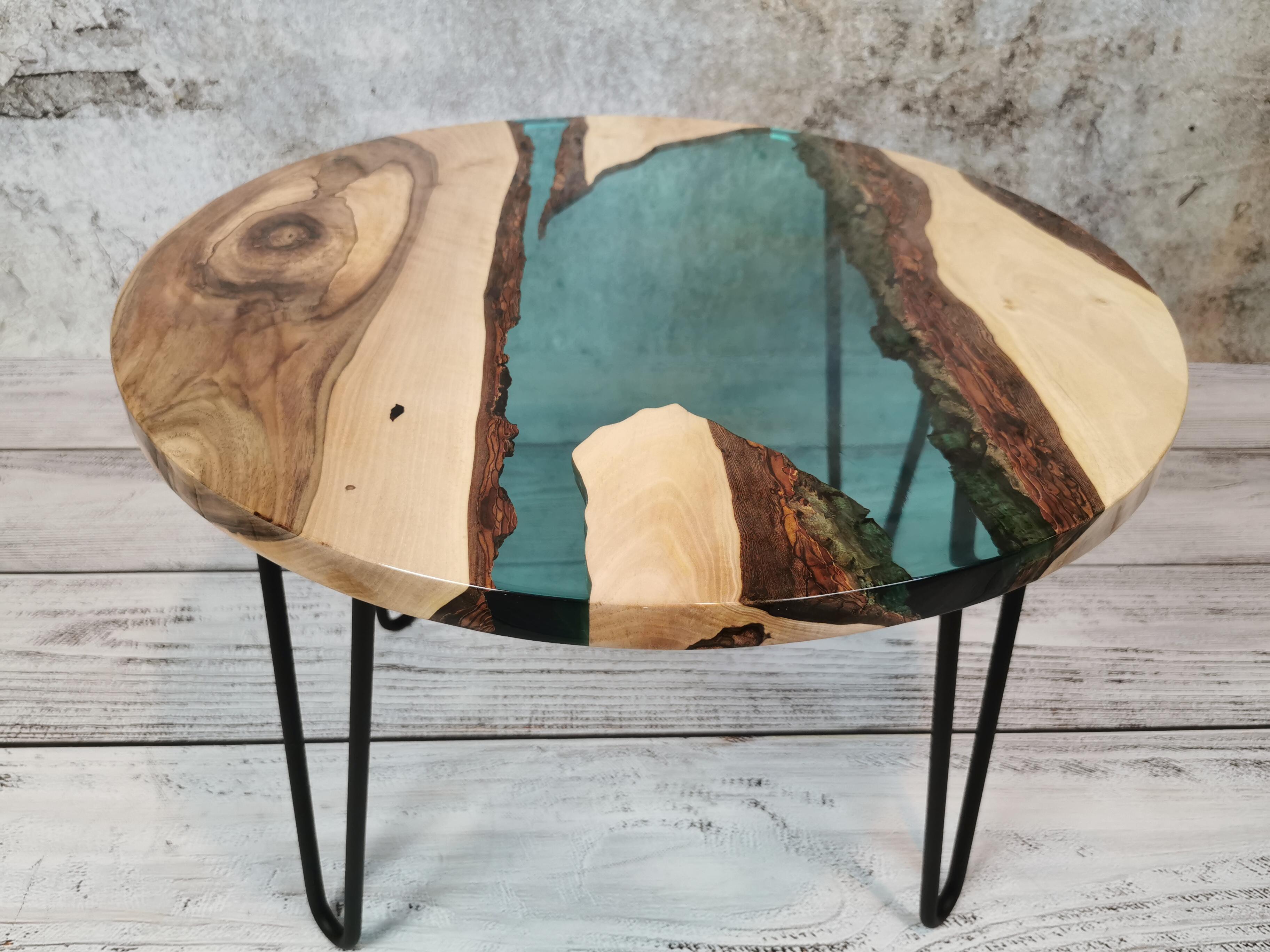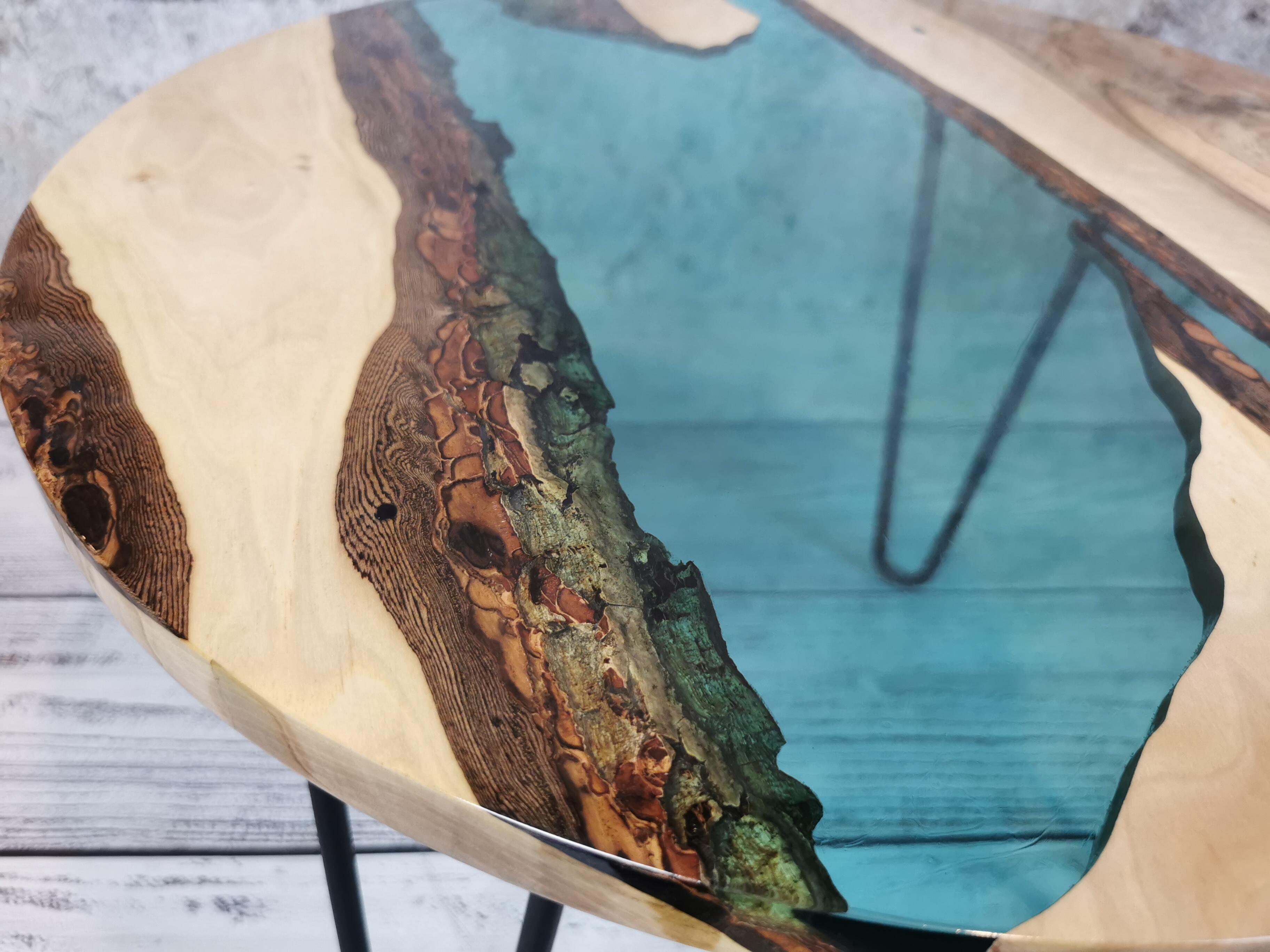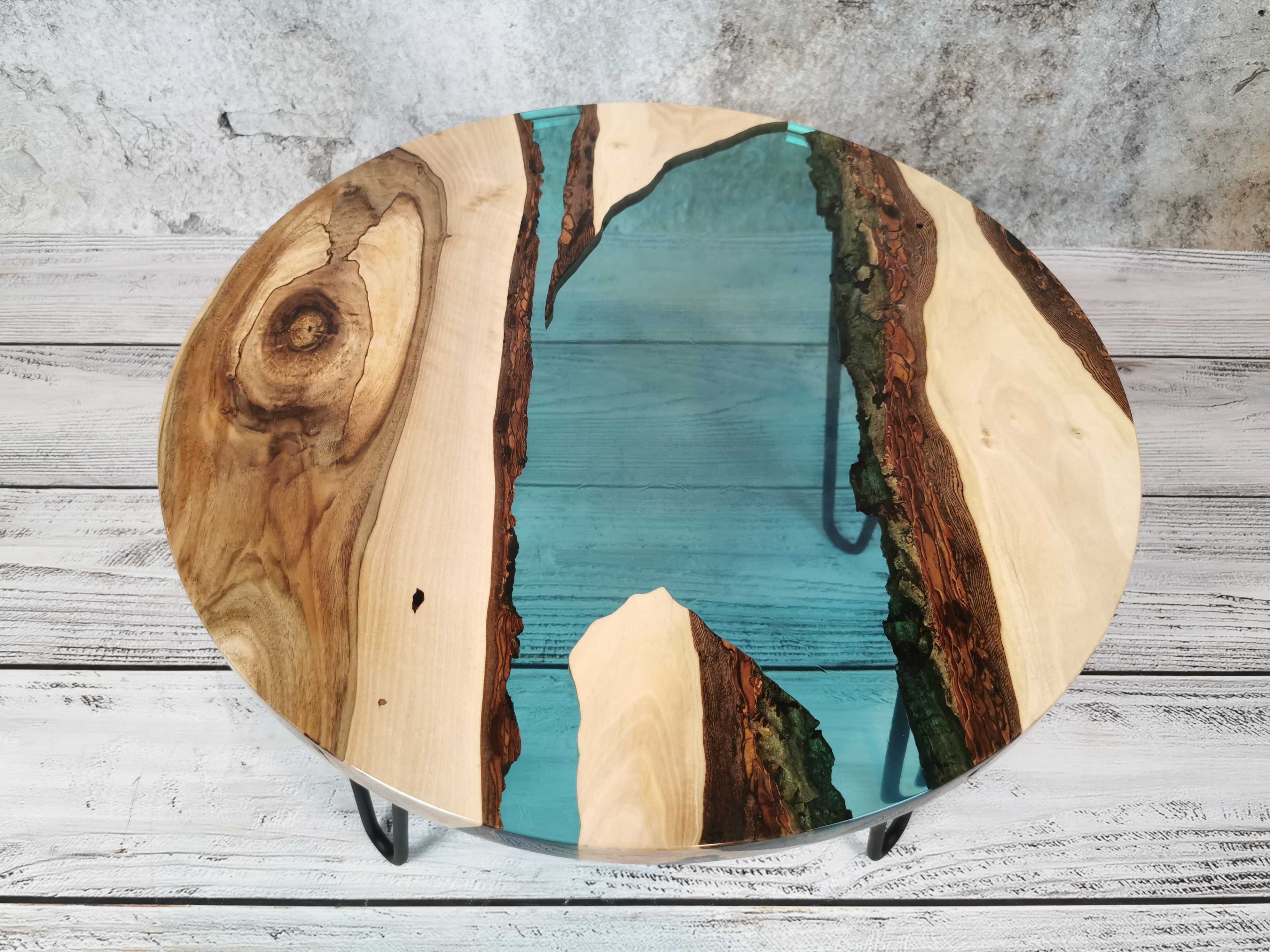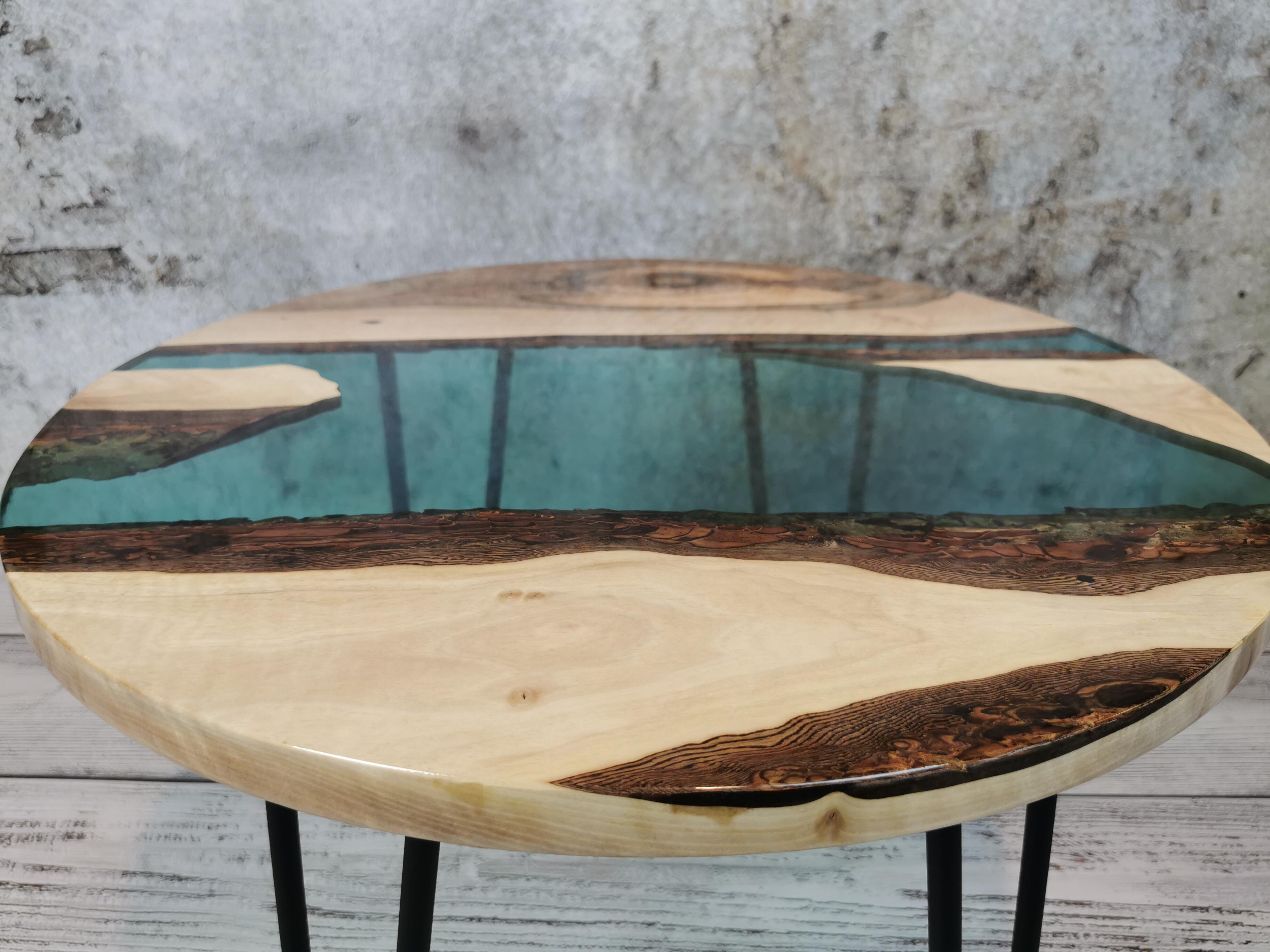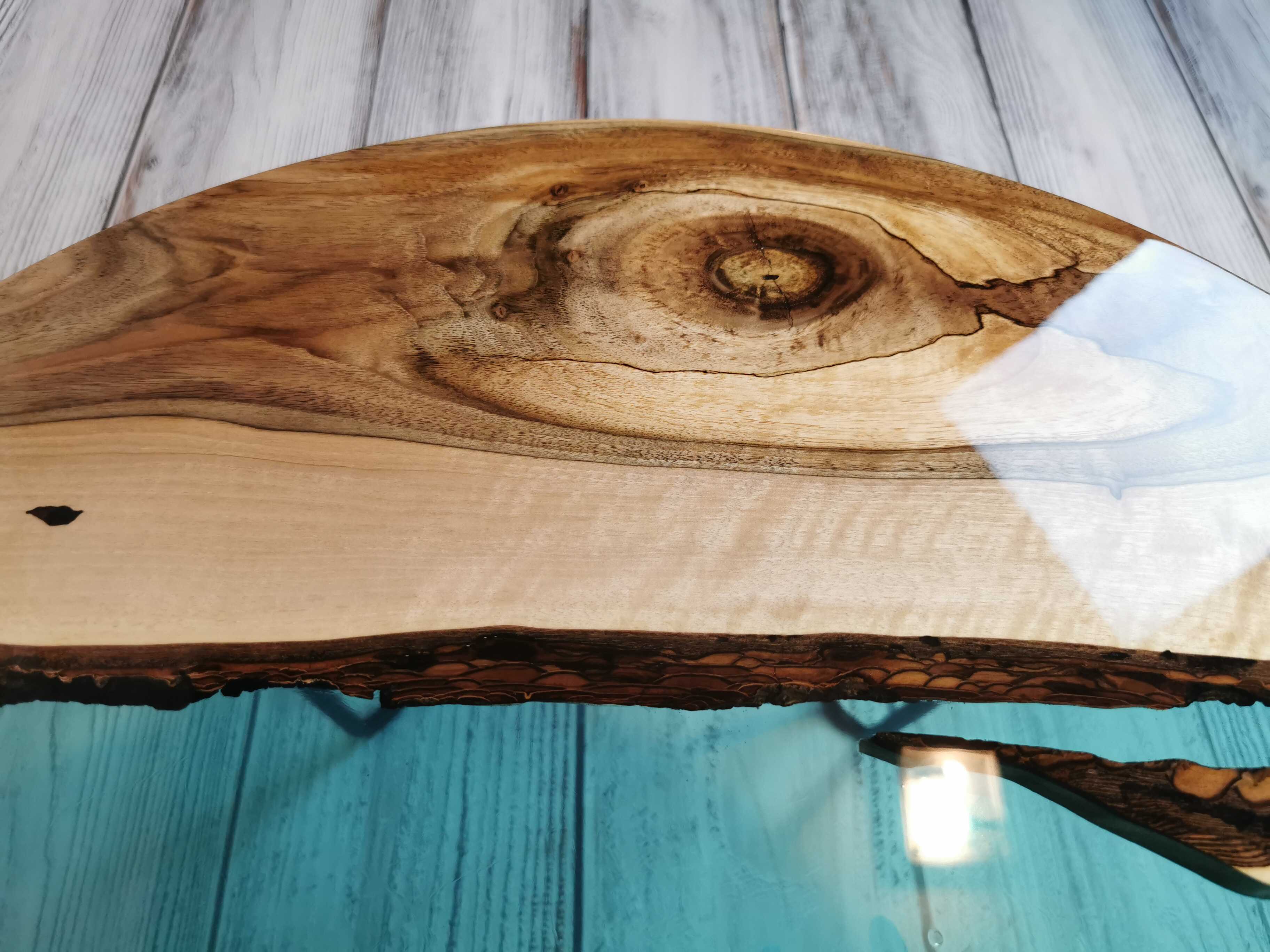 Przez środek blatu biegnie pas turkusowej żywicy epoksydowej, który przywodzi na myśl spokojną taflę wody i nadaje całości wyjątkowej głębi. Kontrast pomiędzy naturalnym drewnem a chłodnym odcieniem żywicy sprawia, że stolik przyciąga wzrok, nie dominując wnętrza.