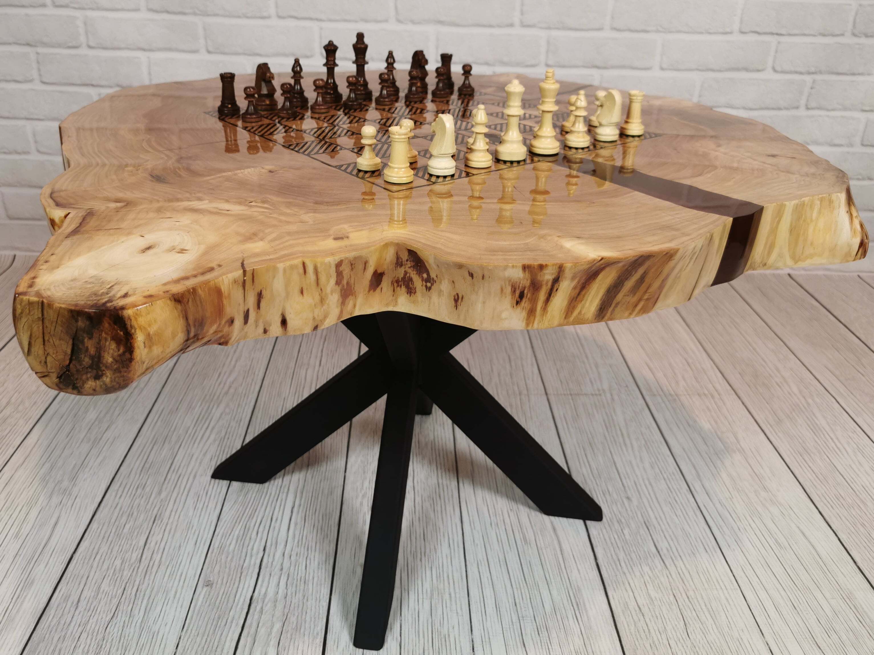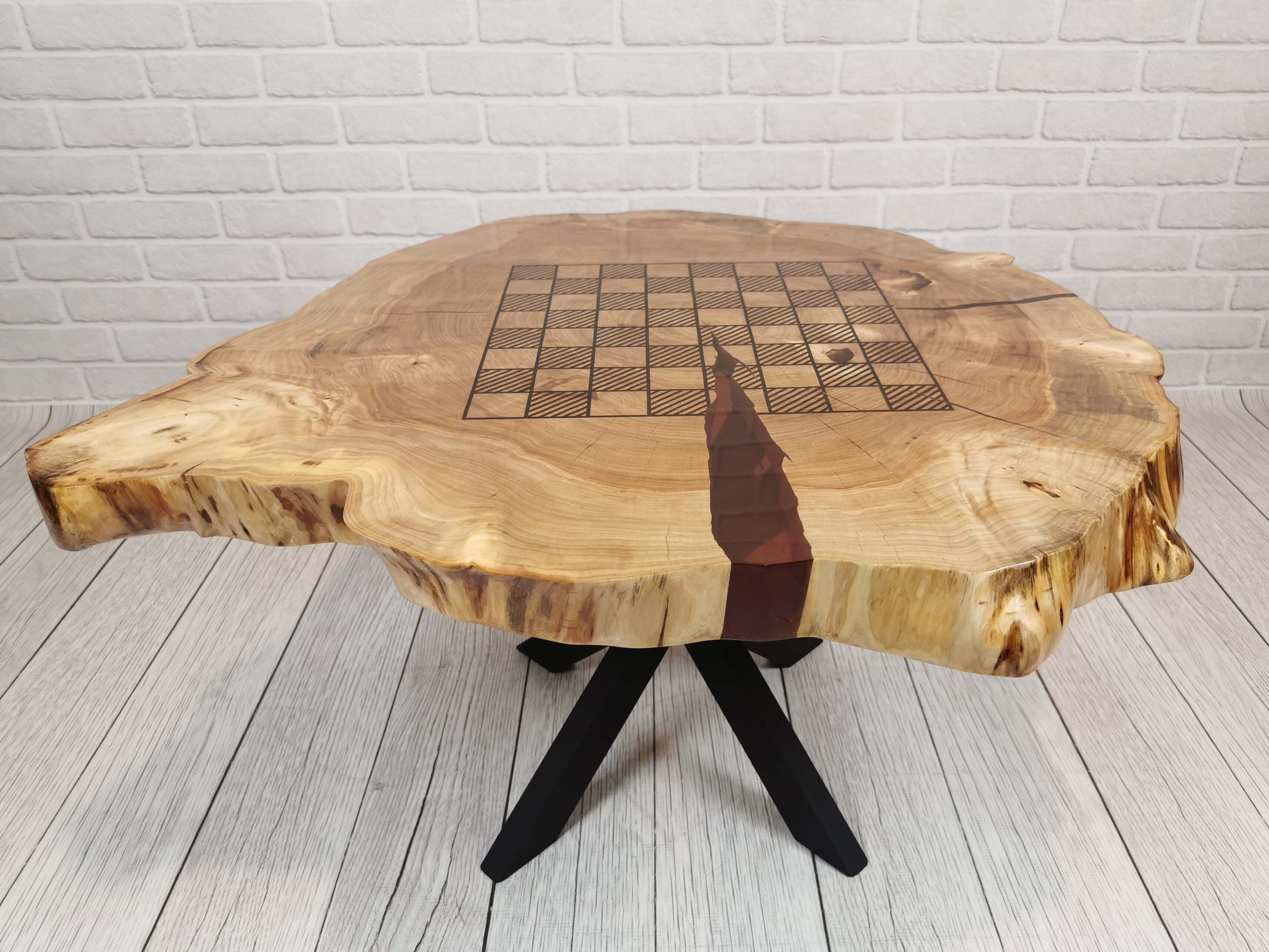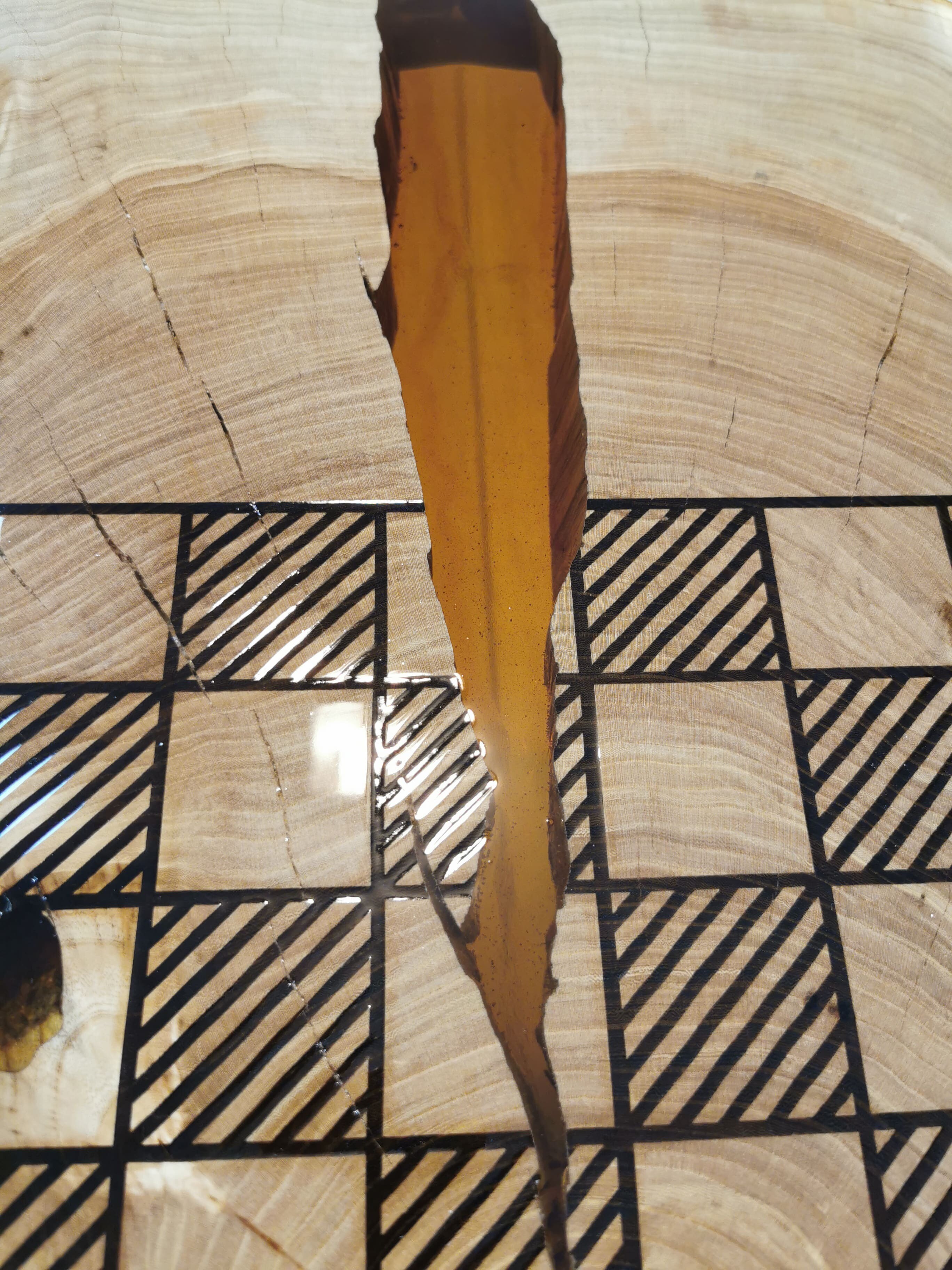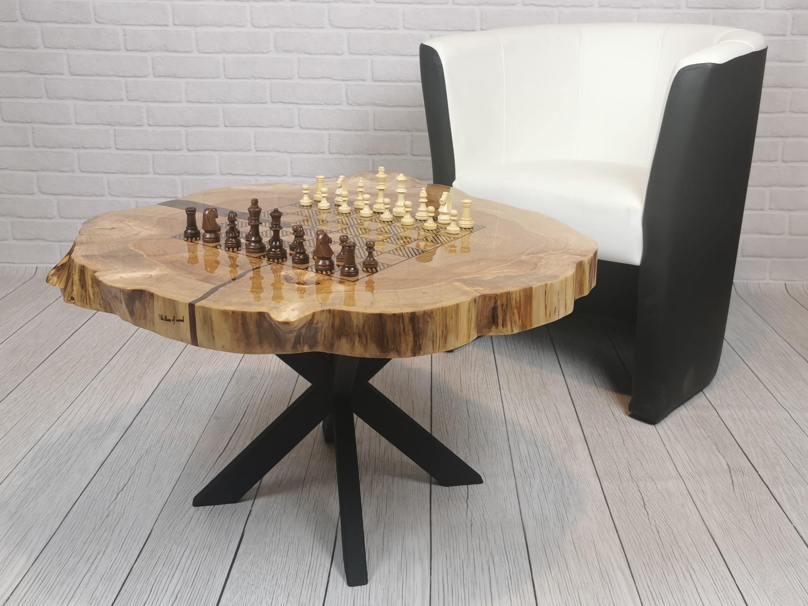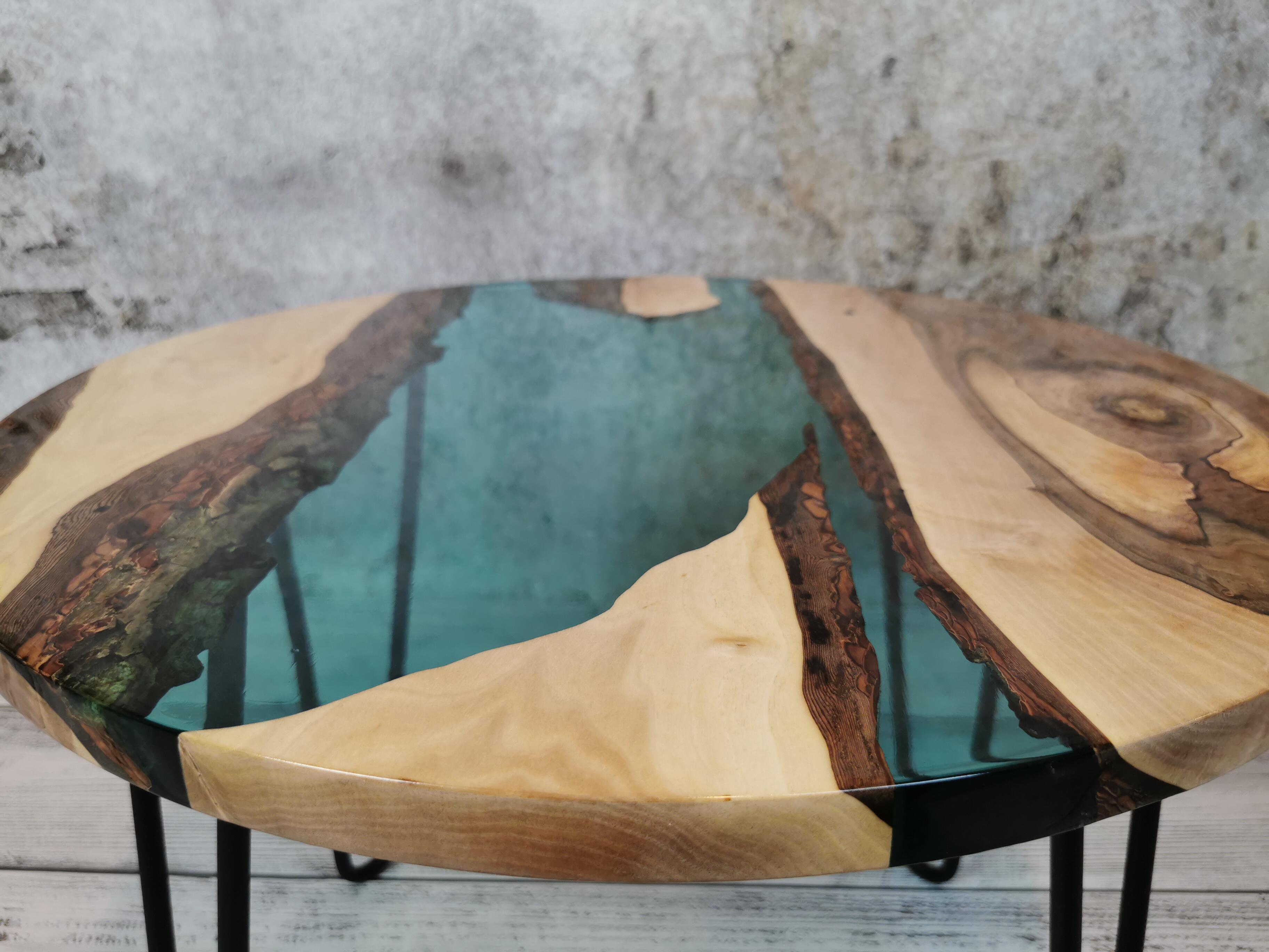 Przez środek blatu biegnie pas turkusowej żywicy epoksydowej, który przywodzi na myśl spokojną taflę wody i nadaje całości wyjątkowej głębi. Kontrast pomiędzy naturalnym drewnem a chłodnym odcieniem żywicy sprawia, że stolik przyciąga wzrok, nie dominując wnętrza.