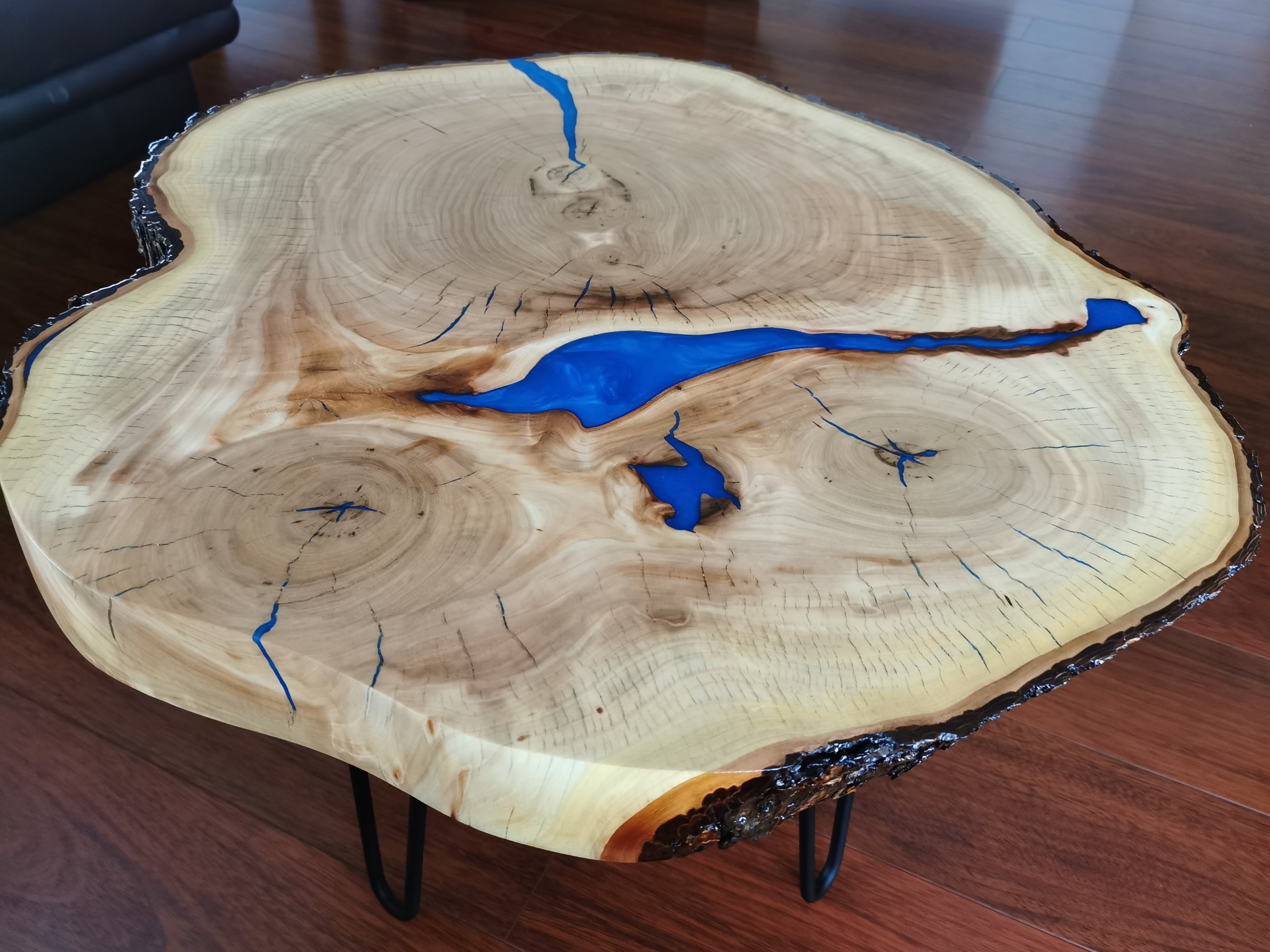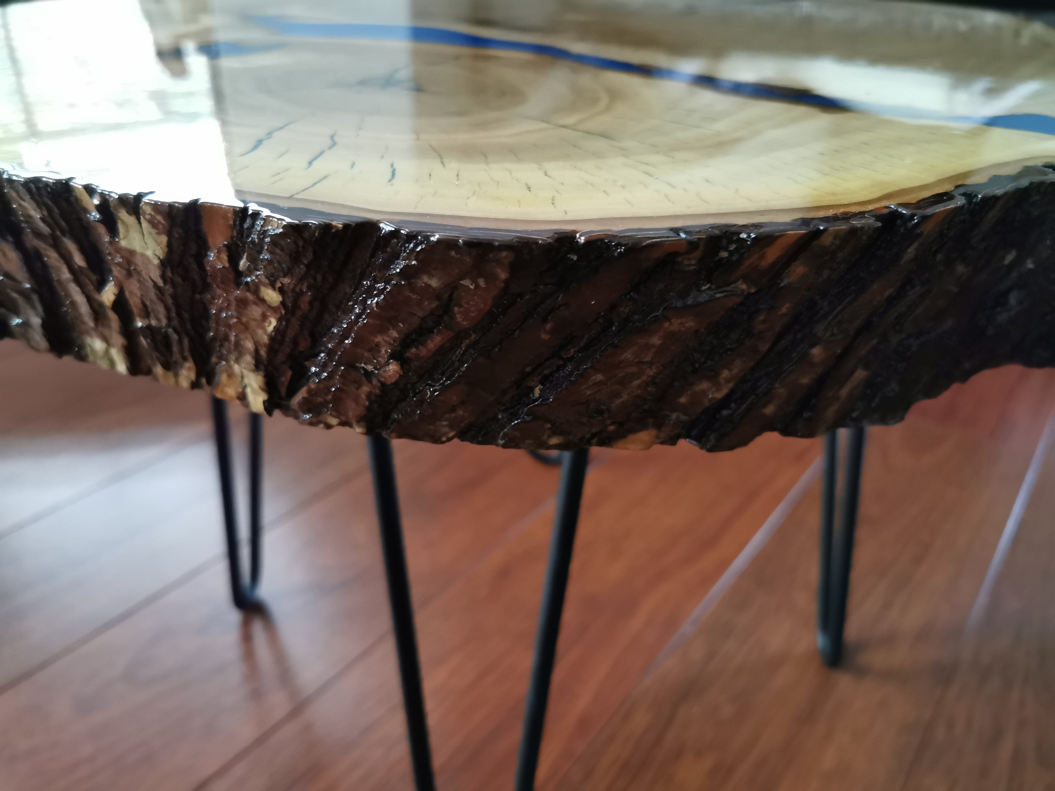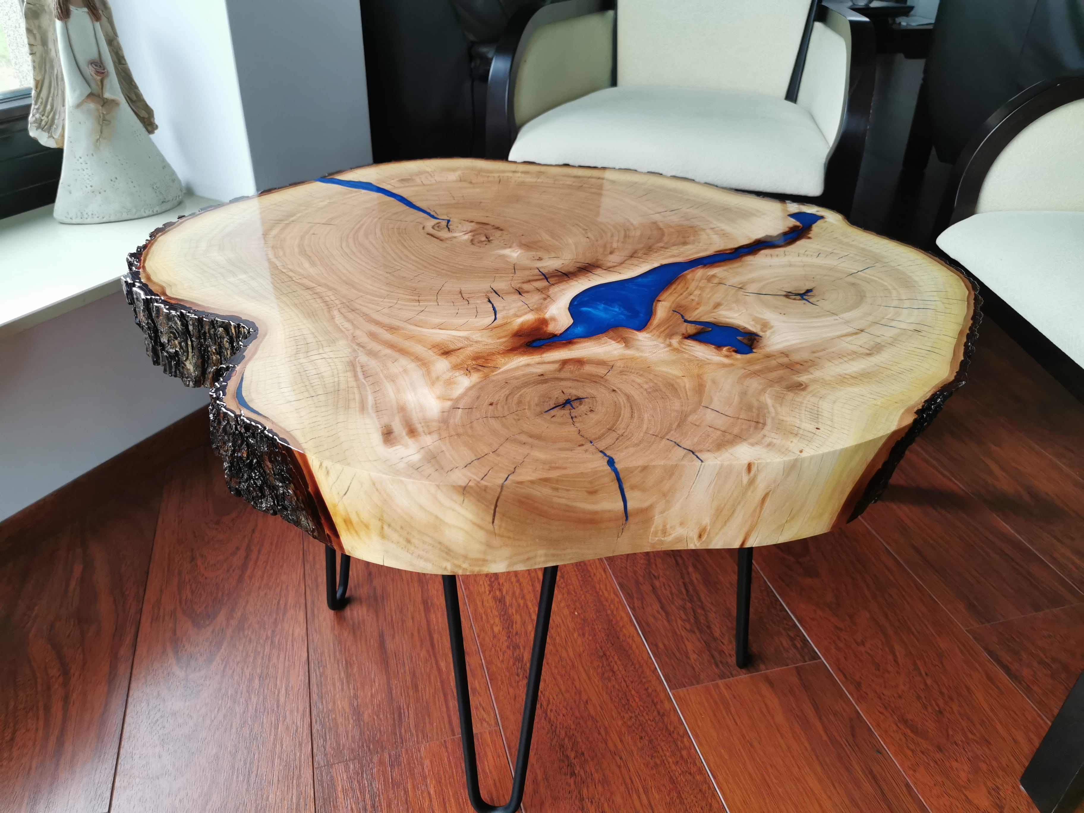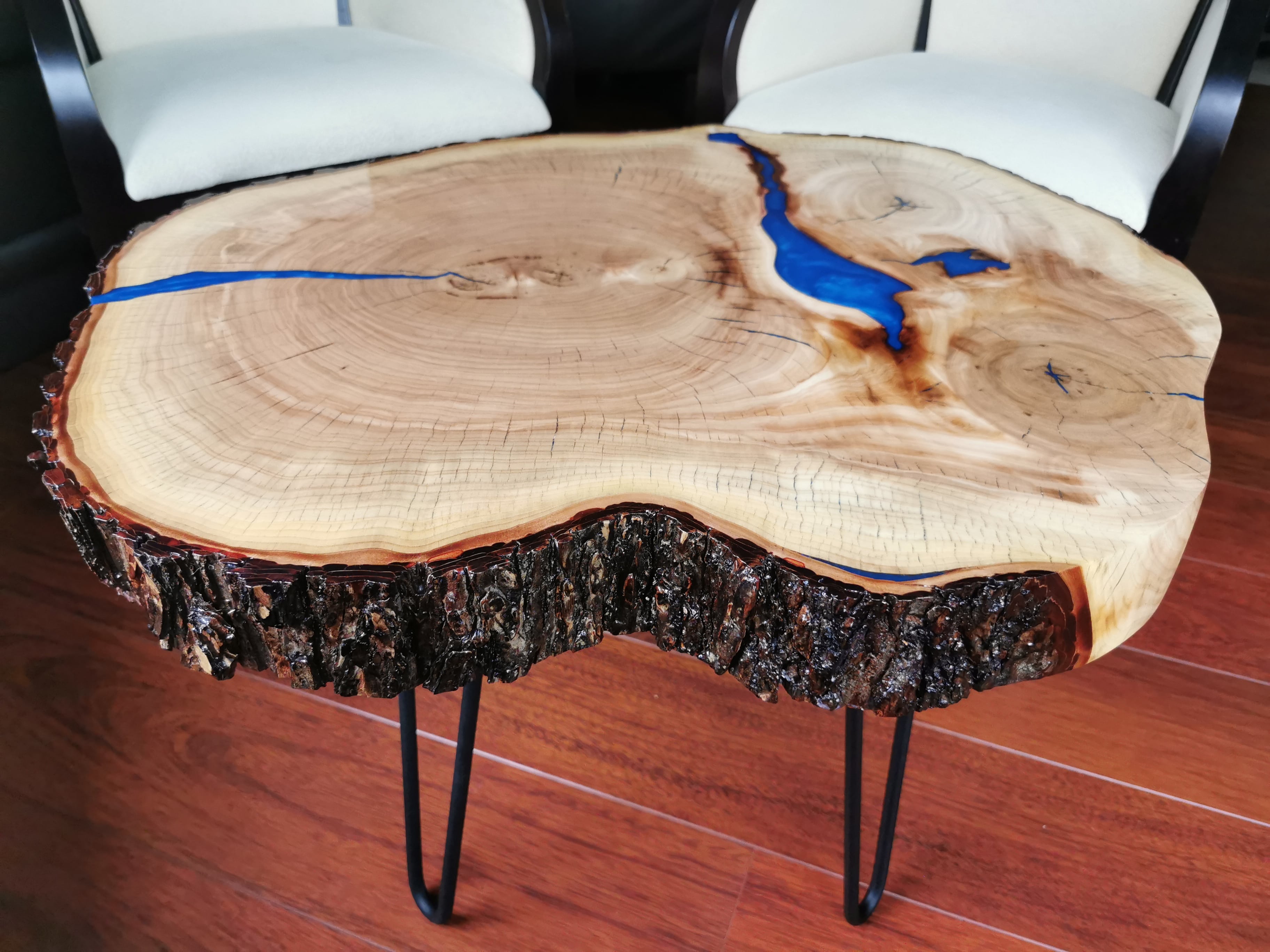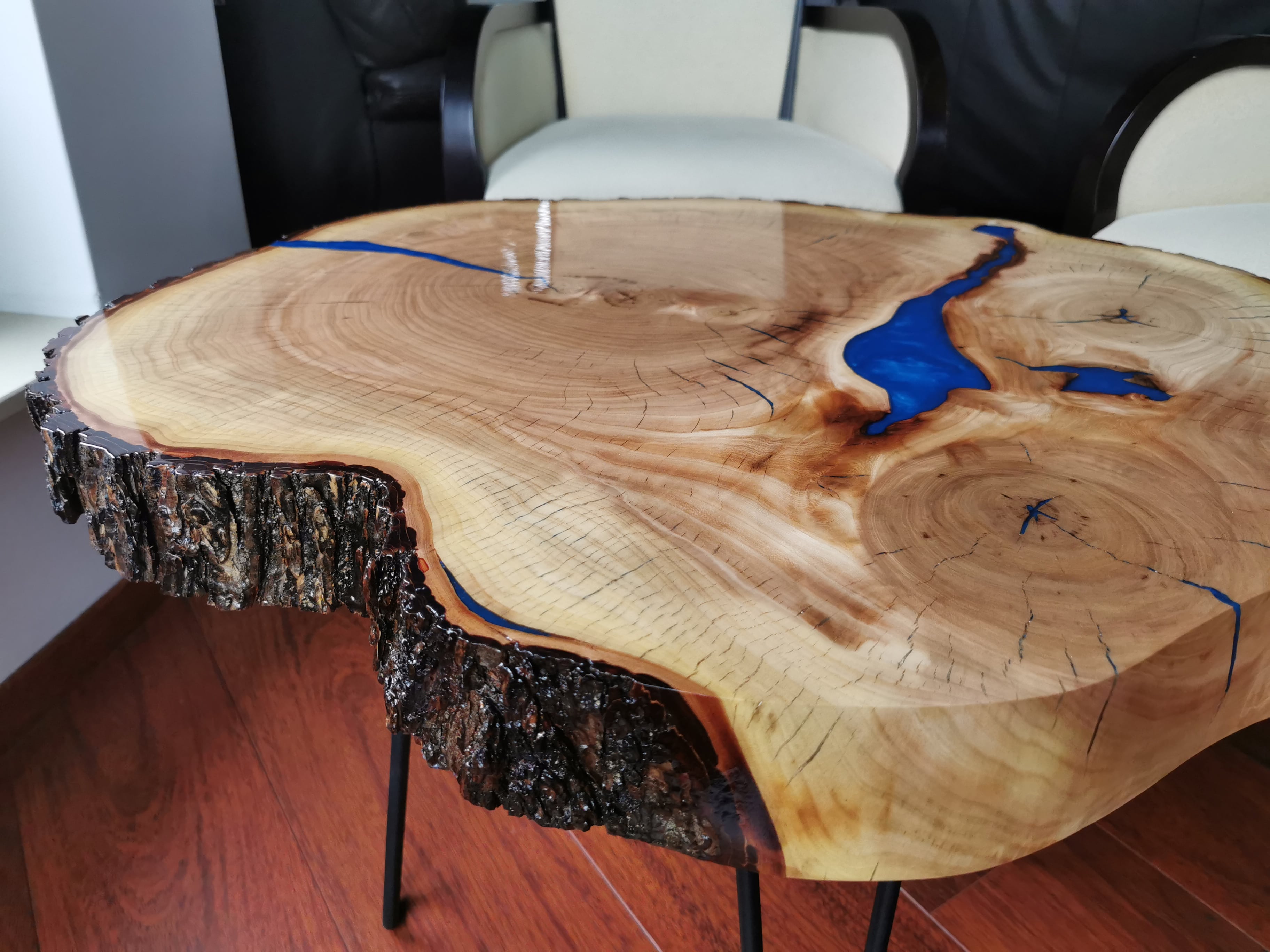 Plaster wiązu z przepiękną korą i usłojeniem, Blat idealnie wyrównany i obustronnie wyszlifowany. Kaniony z perłowej niebieskiej żywicy: " dwa samotne jeziora pośród wzgórz i dolin pustynnych, a wszystko to w kawałku drewna". Całość zabezpieczona z obu stron dwuskładnikowym lakierem poliuretanowym włoskiego producenta. Wypolerowany na wysoki połysk. Nogi typu HAIRPIN wykonane z metalu i pokryte trwałym lakierem proszkowym w kolorze czarny mat.