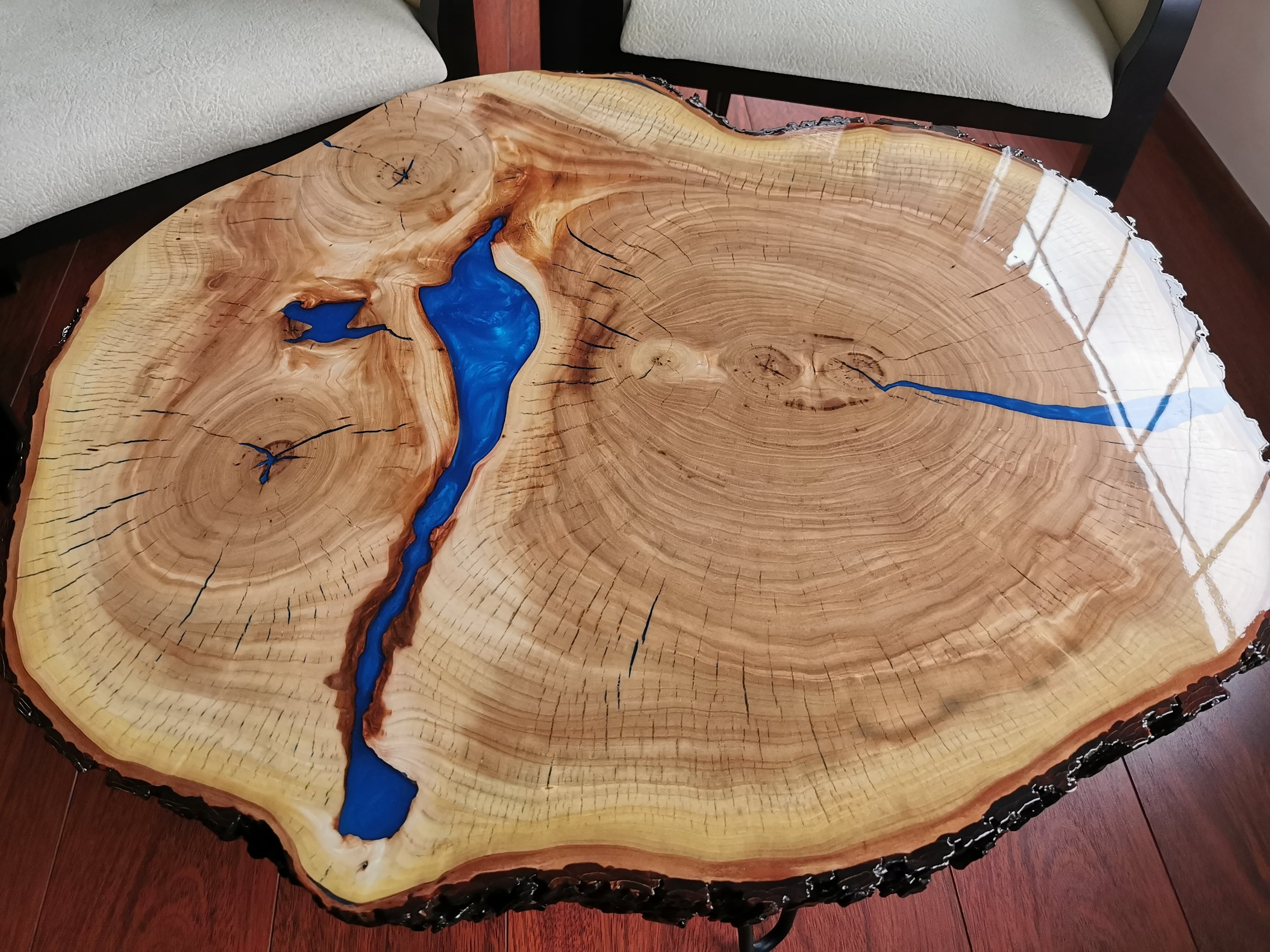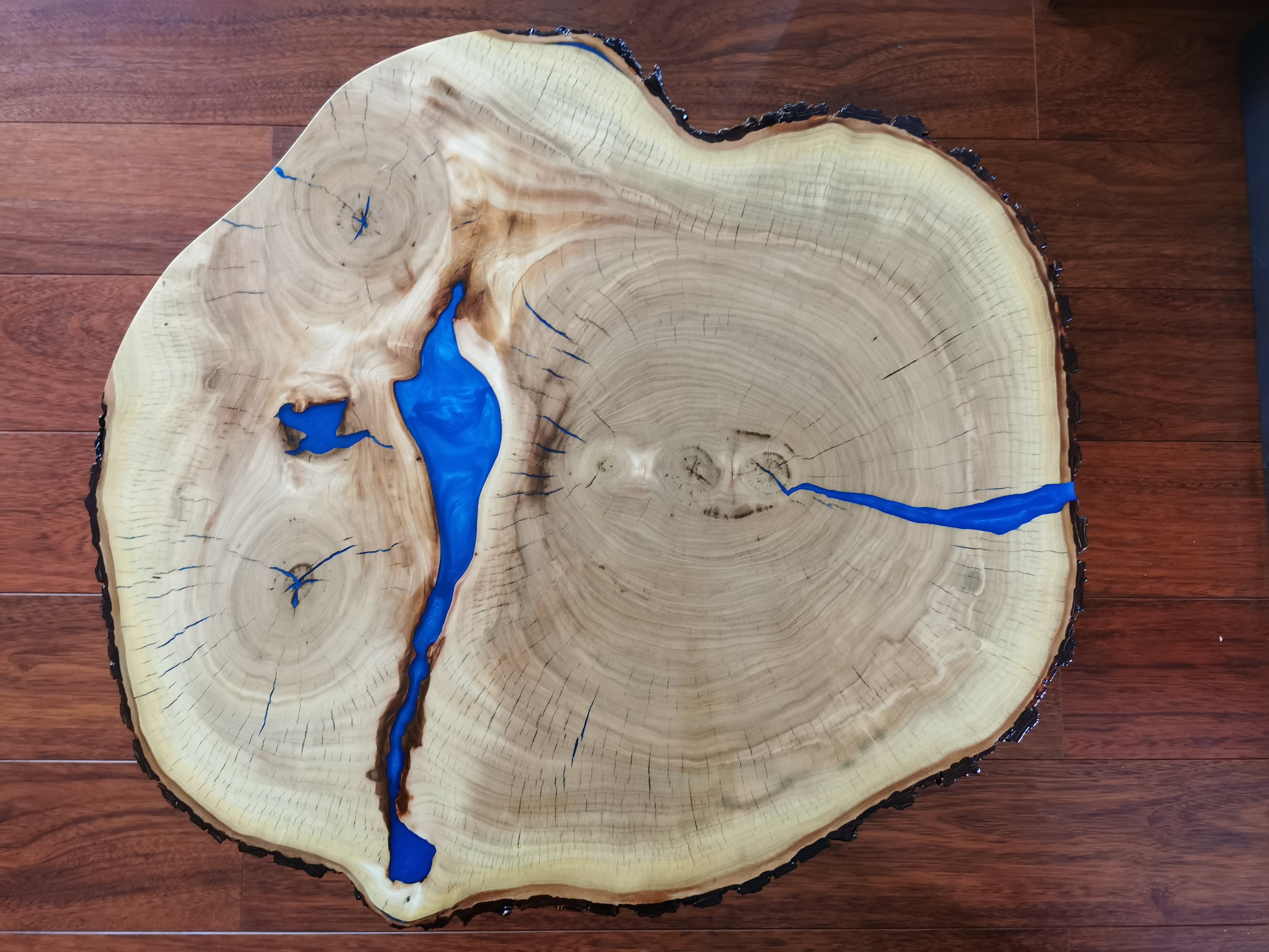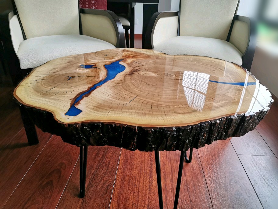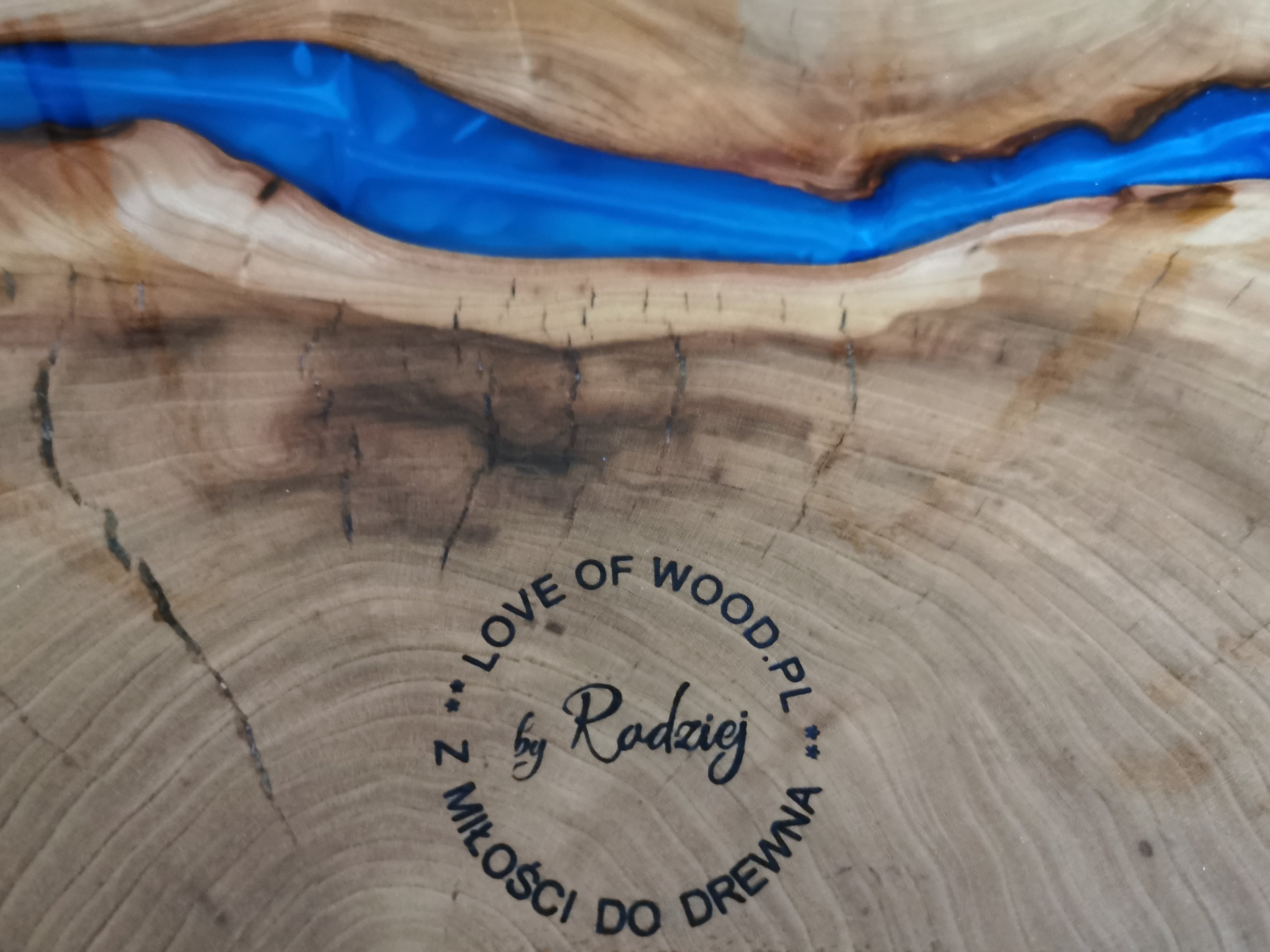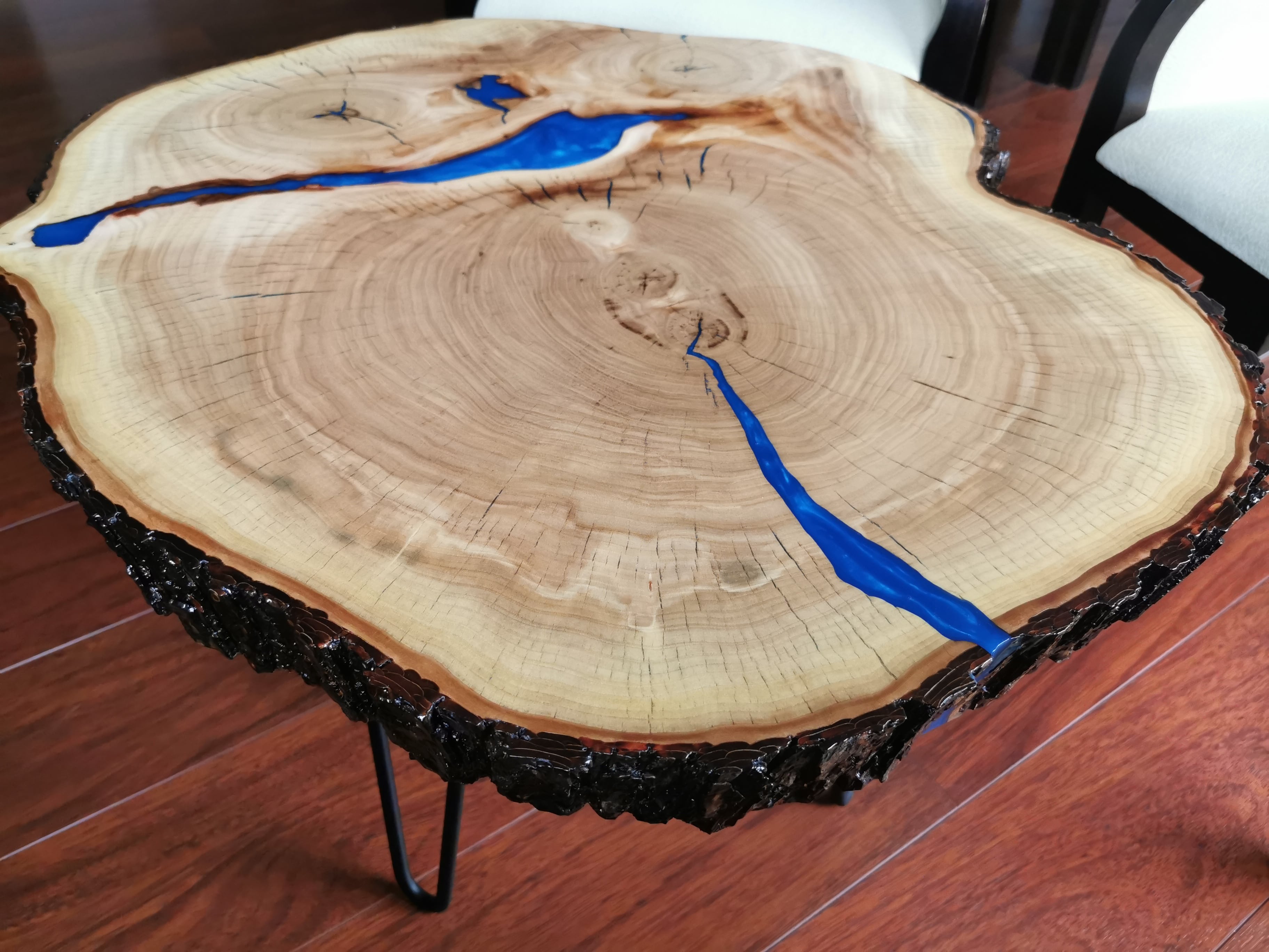 Plaster wiązu z przepiękną korą i usłojeniem, Blat idealnie wyrównany i obustronnie wyszlifowany. Kaniony z perłowej niebieskiej żywicy: " dwa samotne jeziora pośród wzgórz i dolin pustynnych, a wszystko to w kawałku drewna". Całość zabezpieczona z obu stron dwuskładnikowym lakierem poliuretanowym włoskiego producenta. Wypolerowany na wysoki połysk. Nogi typu HAIRPIN wykonane z metalu i pokryte trwałym lakierem proszkowym w kolorze czarny mat.
