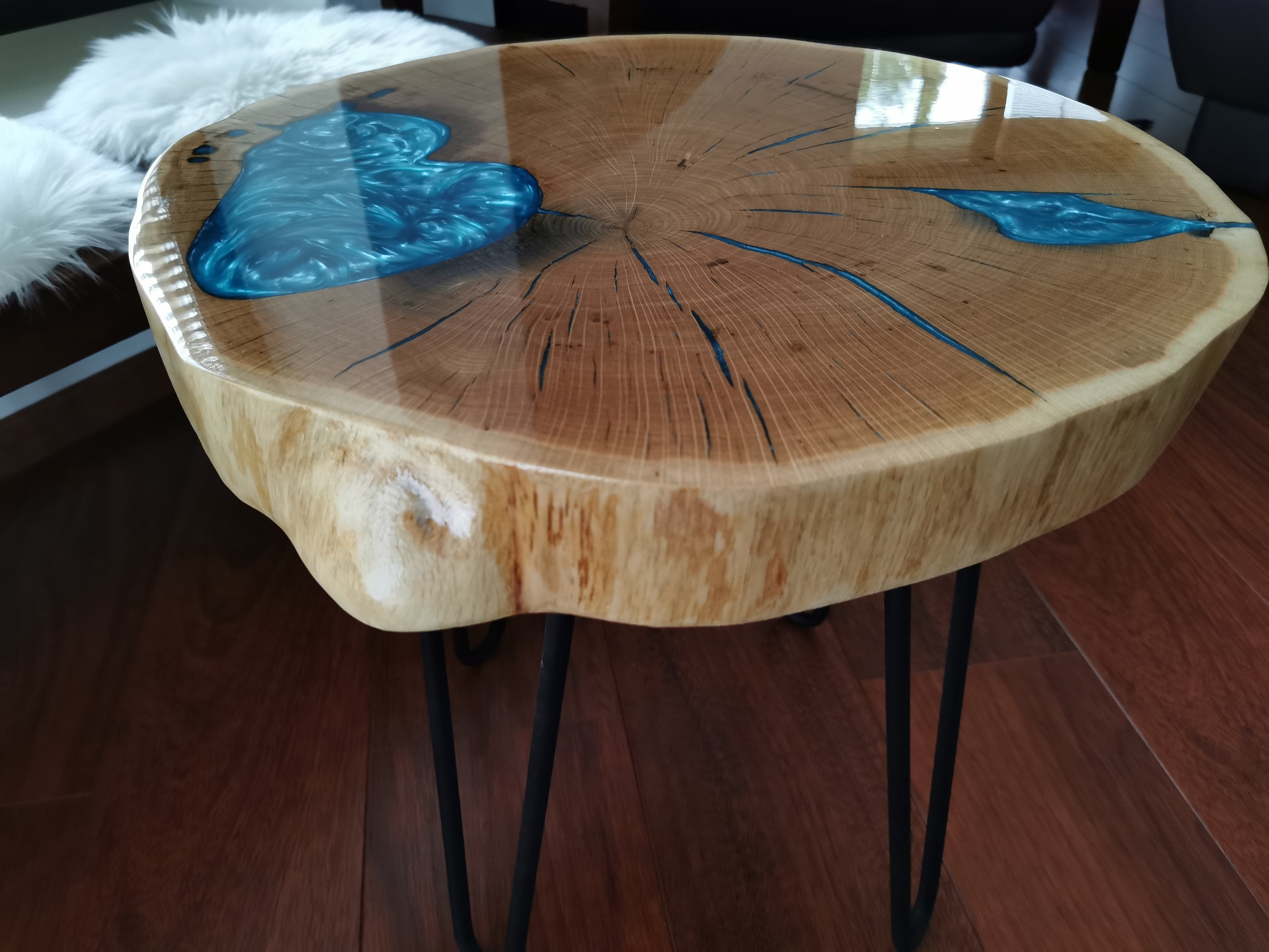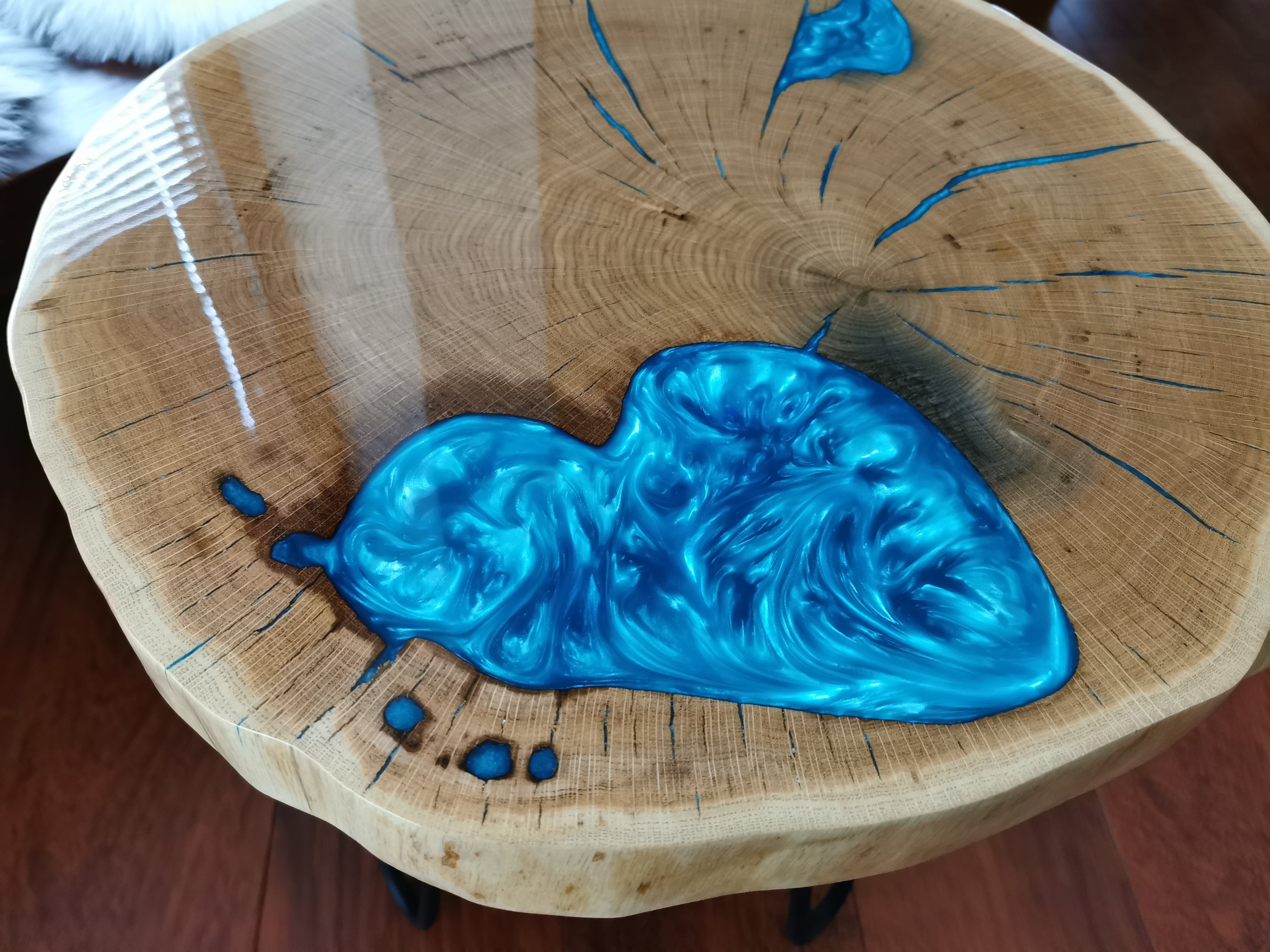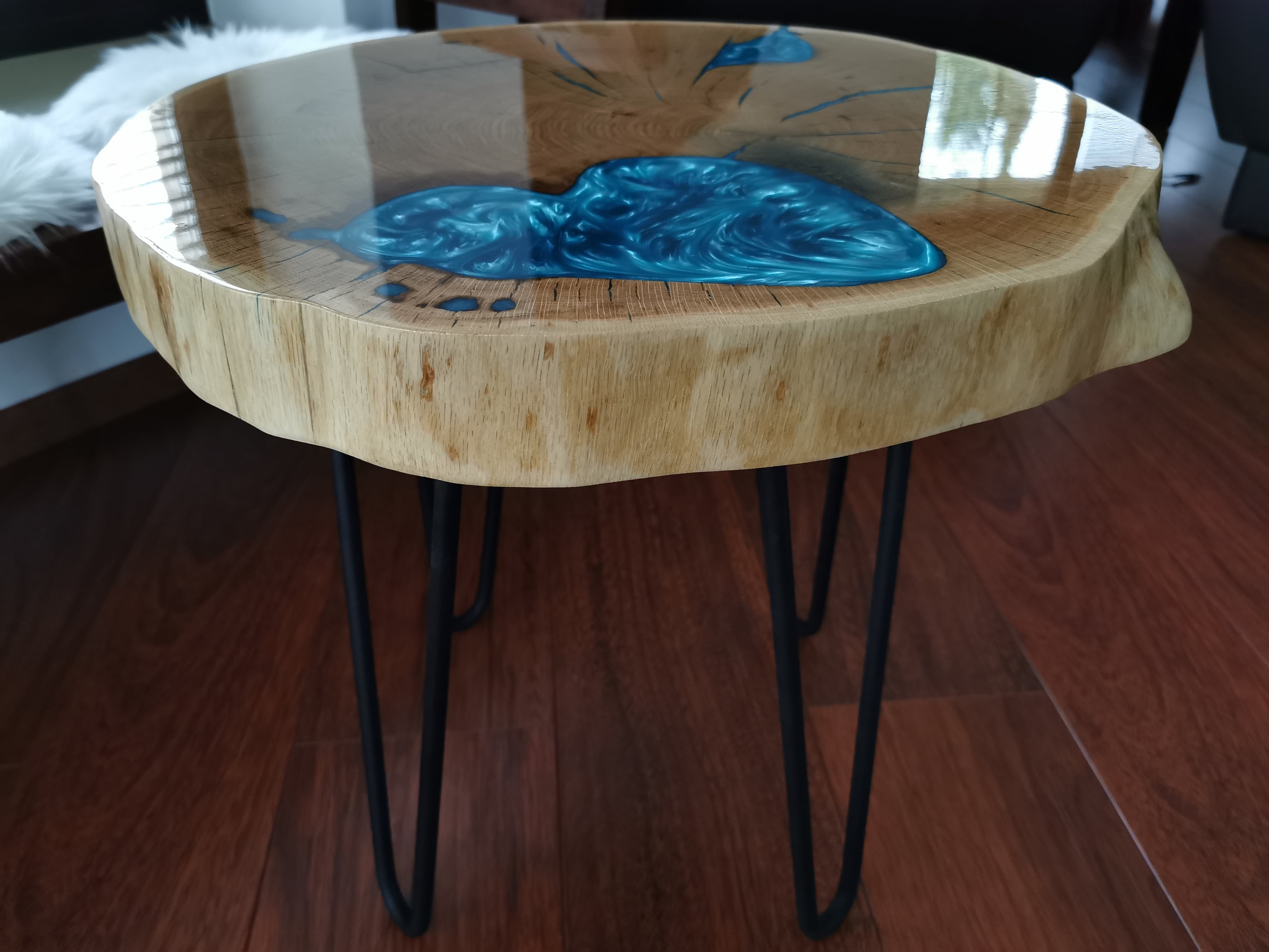 Stolik z plastra dębu. Idealnie wyrównany i obustronnie wyszlifowany. Zaimpregnowany i wzmocniony żywicą epoksydową renomowanej polskiej firmy. Kaniony i pęknięcia zalane piękną perłową żywicą w dwóch kolorach - jasno i ciemno niebieskim. Całość zabezpieczona dwuskładnikowym lakierem poliuretanowym włoskiego producenta. Blat wypolerowane na wysoki połysk - tafla szkła. Nogi typu Hairpin wykonane z metalu i pokryte trwałym lakierem proszkowym w kolorze czarny mat.