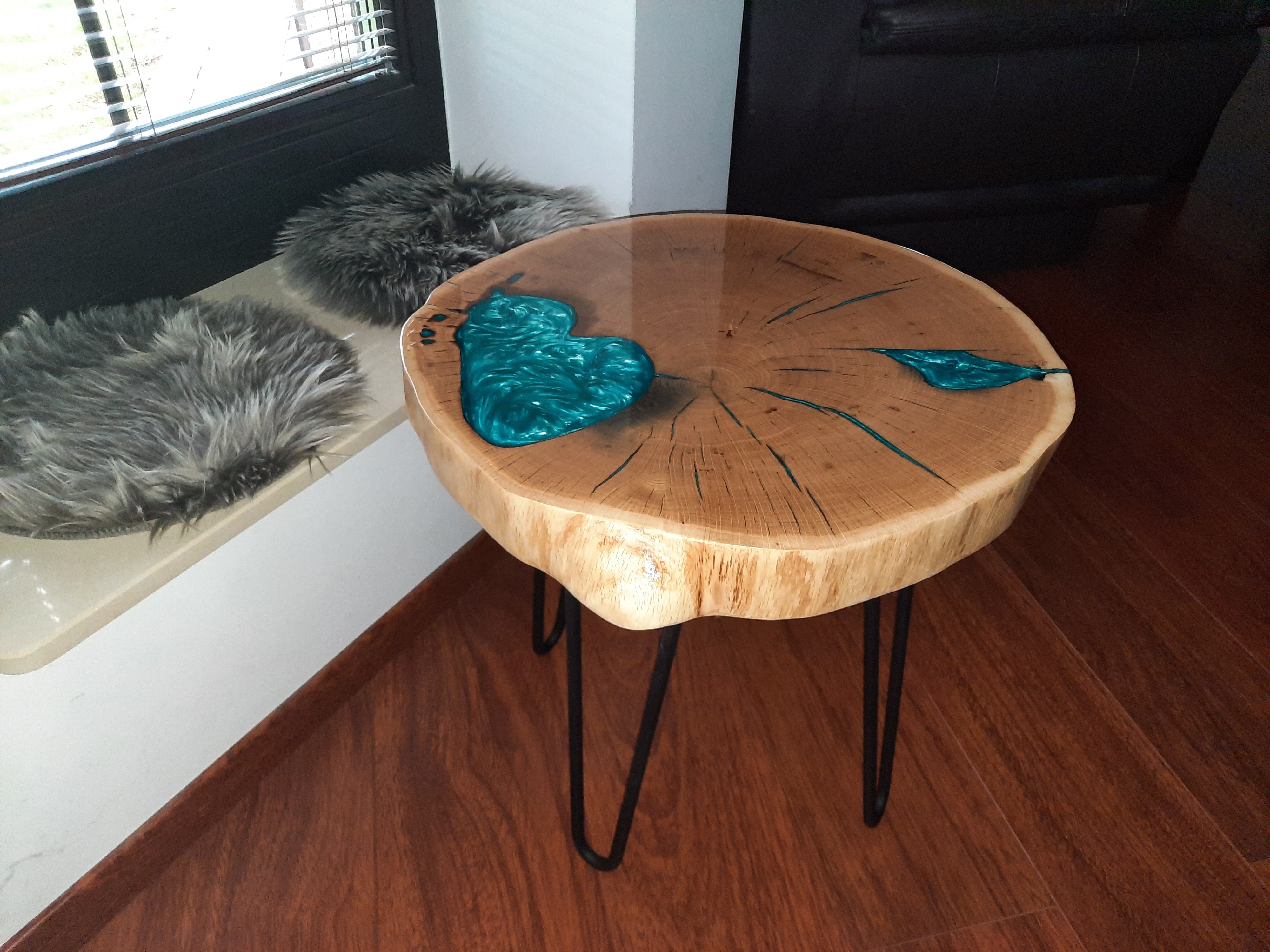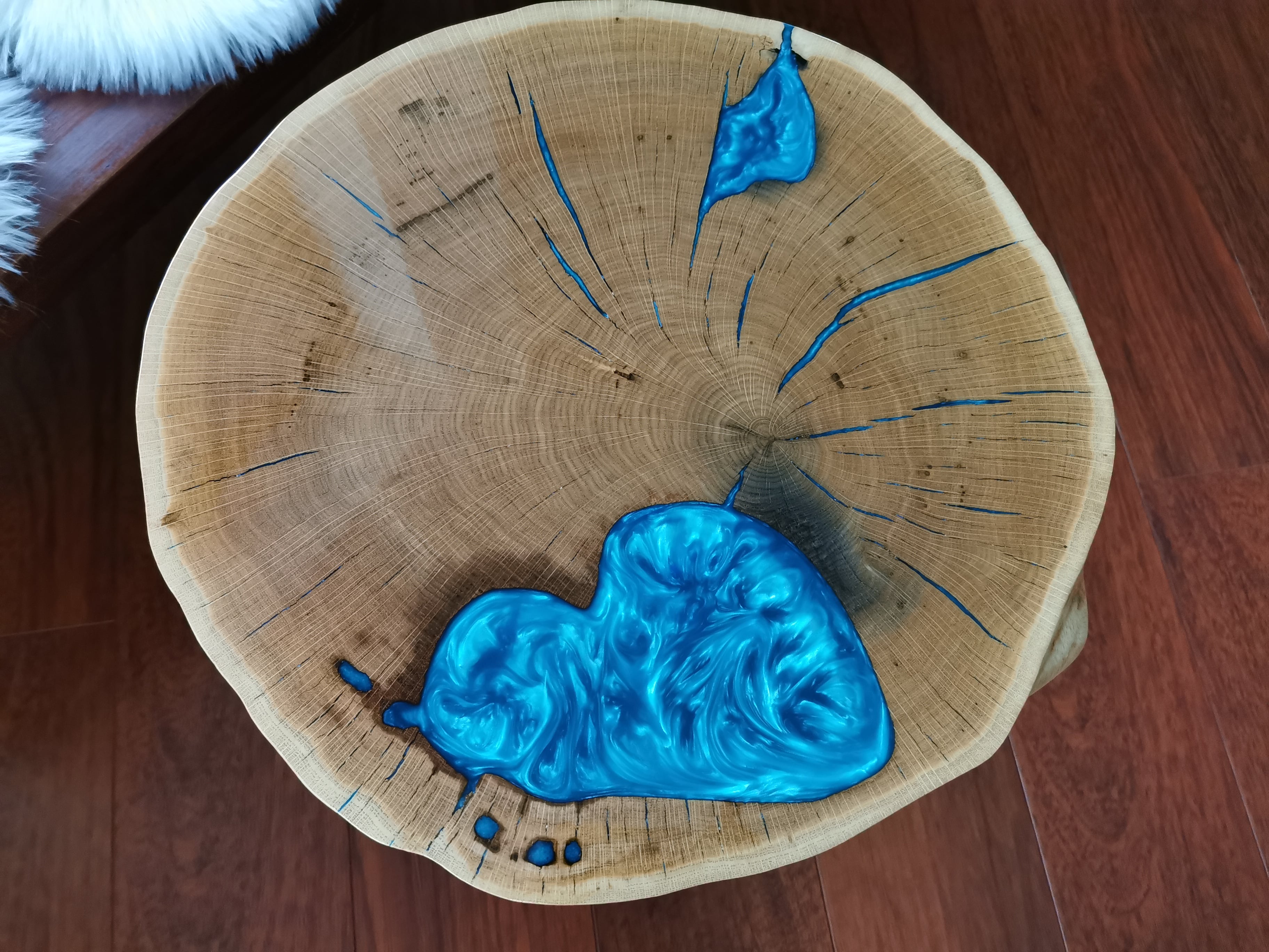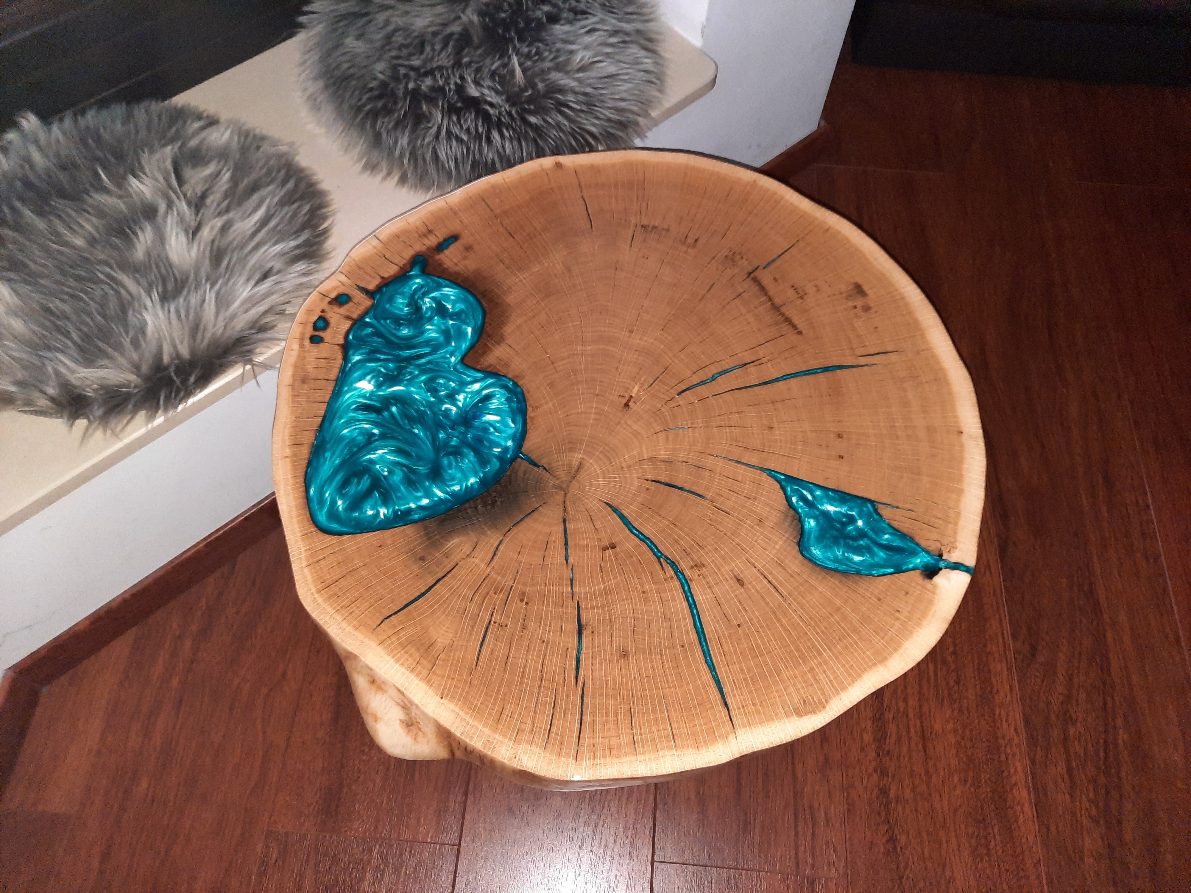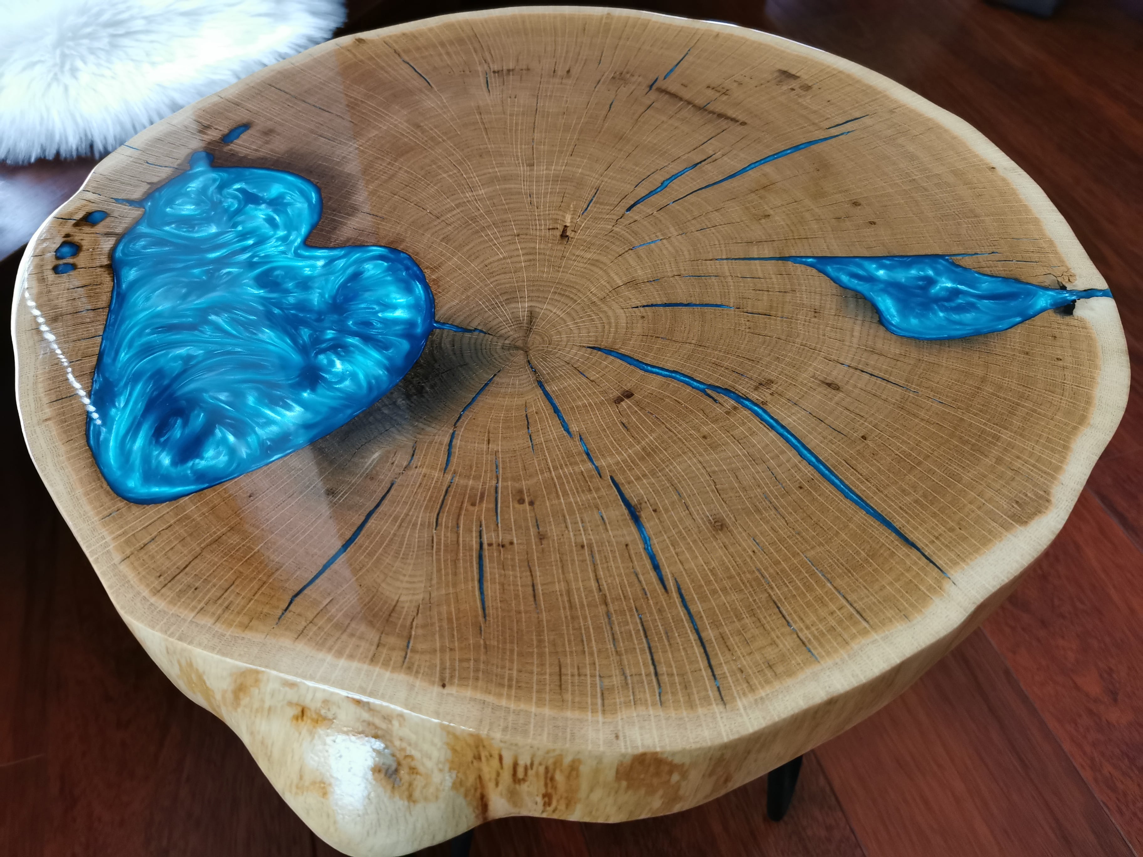 Stolik z plastra dębu. Idealnie wyrównany i obustronnie wyszlifowany. Zaimpregnowany i wzmocniony żywicą epoksydową renomowanej polskiej firmy. Kaniony i pęknięcia zalane piękną perłową żywicą w dwóch kolorach - jasno i ciemno niebieskim. Całość zabezpieczona dwuskładnikowym lakierem poliuretanowym włoskiego producenta. Blat wypolerowane na wysoki połysk - tafla szkła. Nogi typu Hairpin wykonane z metalu i pokryte trwałym lakierem proszkowym w kolorze czarny mat.