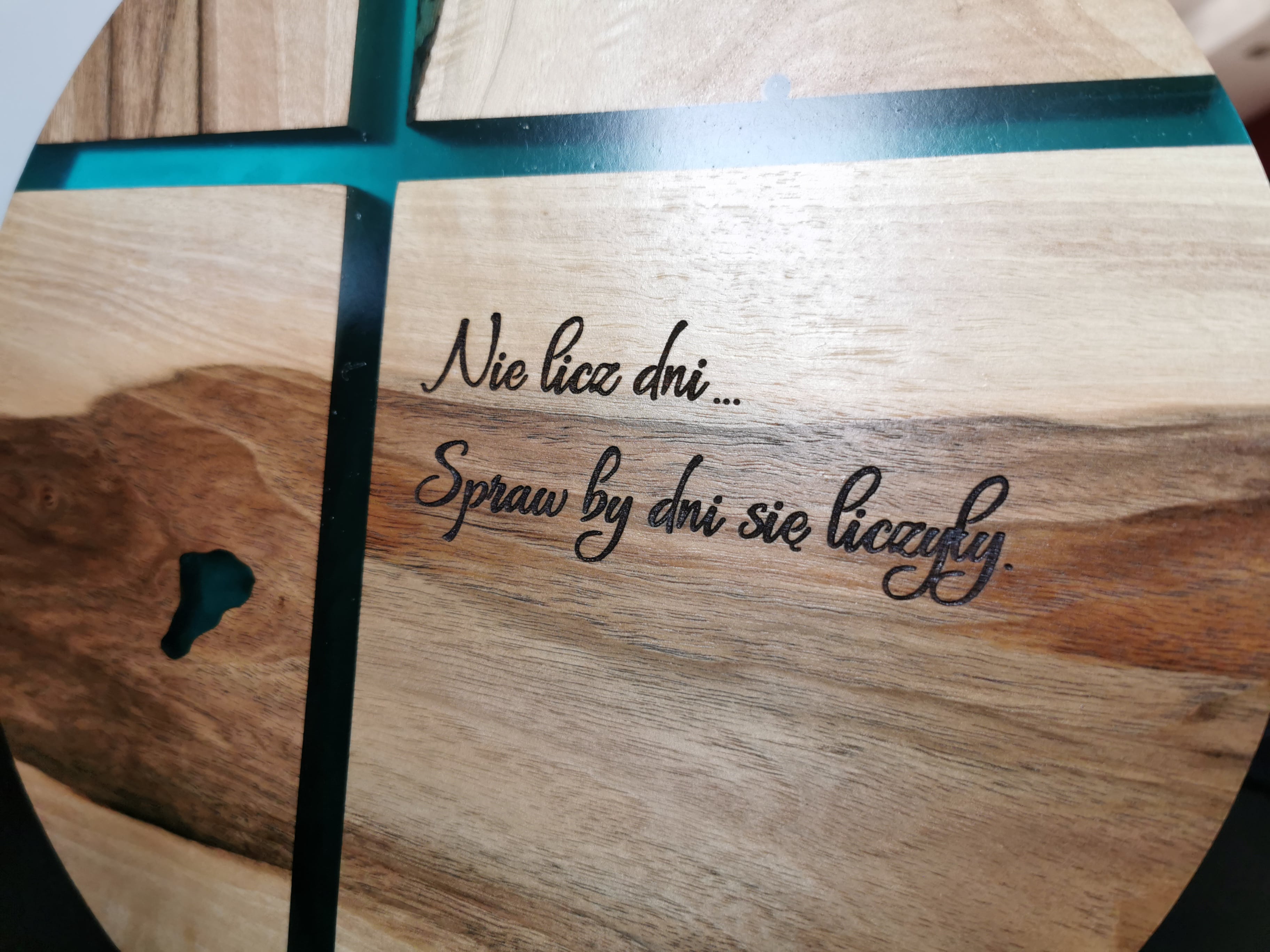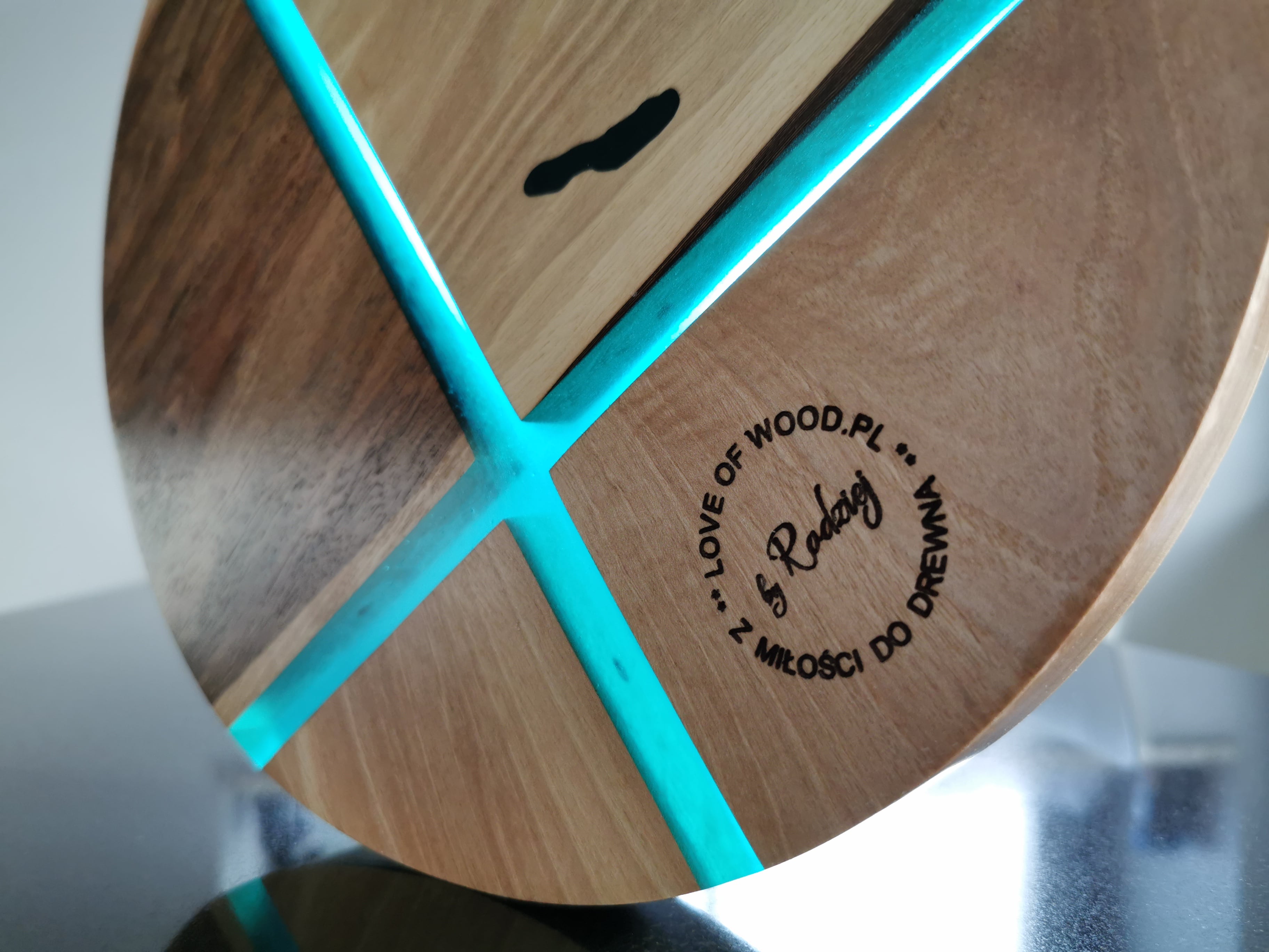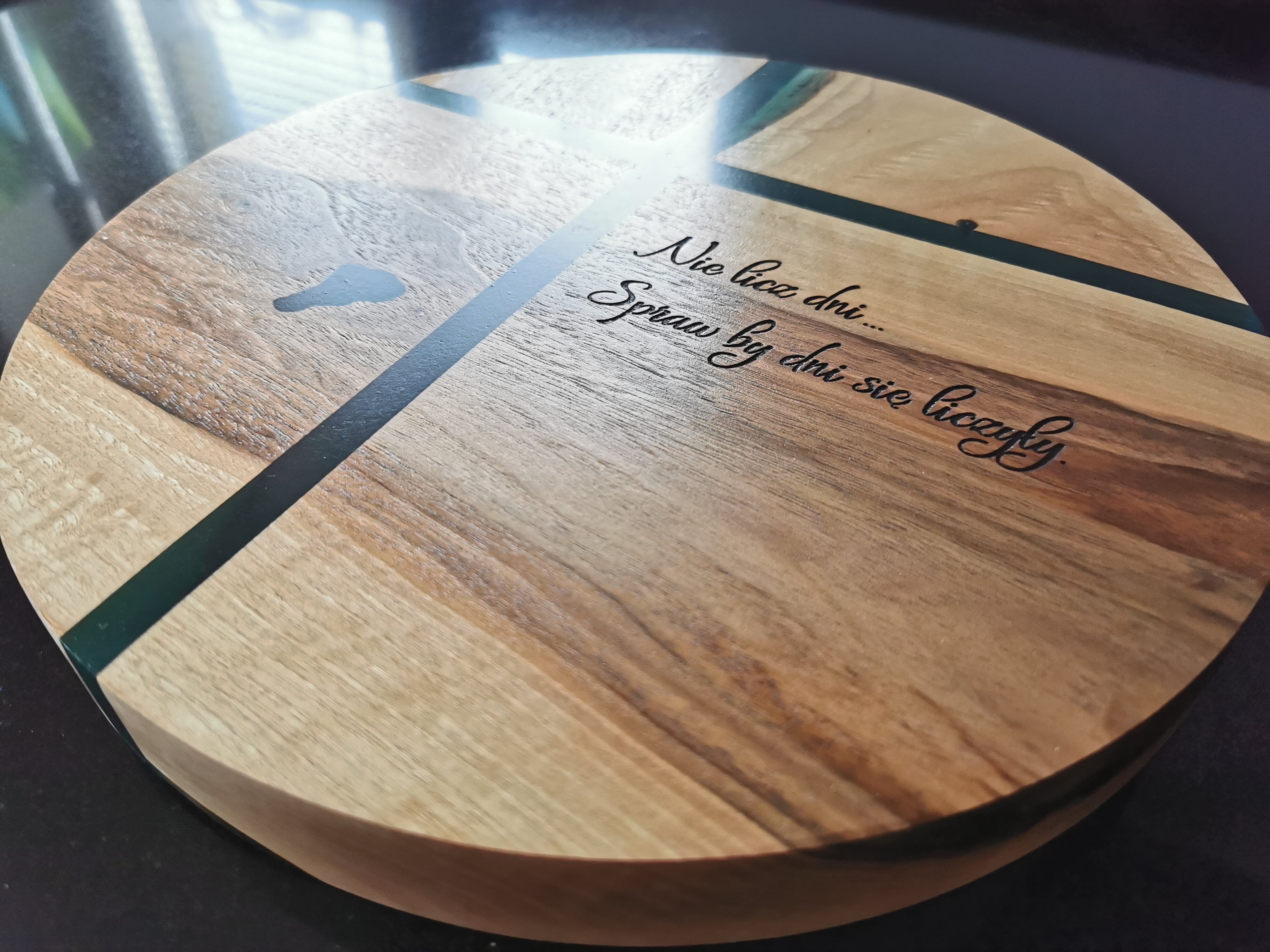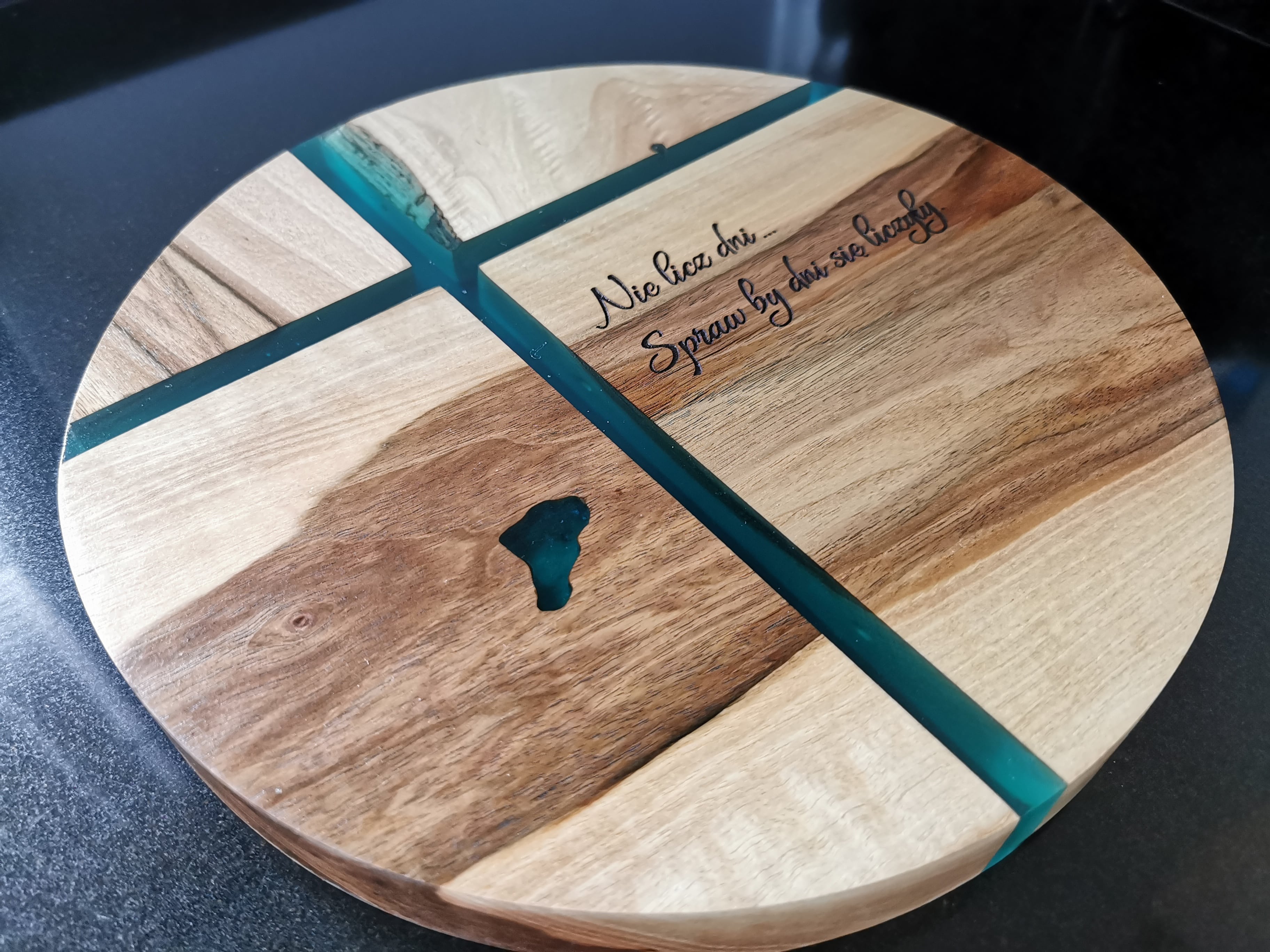 Taca /deska do serwowania. Niepowtarzalna, ręcznie wykonana taca ze szlachetnego drewna orzecha włoskiego i żywicy epoksydowej w kolorze turkusu. Wyjątkowe usłojenie oraz design. Całość zabezpieczona najwyższej jakości woskiem do drewna, dopuszczonym do kontaktu z żywnością. Wygrawerowany na desce tekst sprawia, że zaprezentowany przedmiot może być wyjątkowym prezentem na różne okazje, jak również artystycznym elementem zdobiącym własny stół, kuchnię.