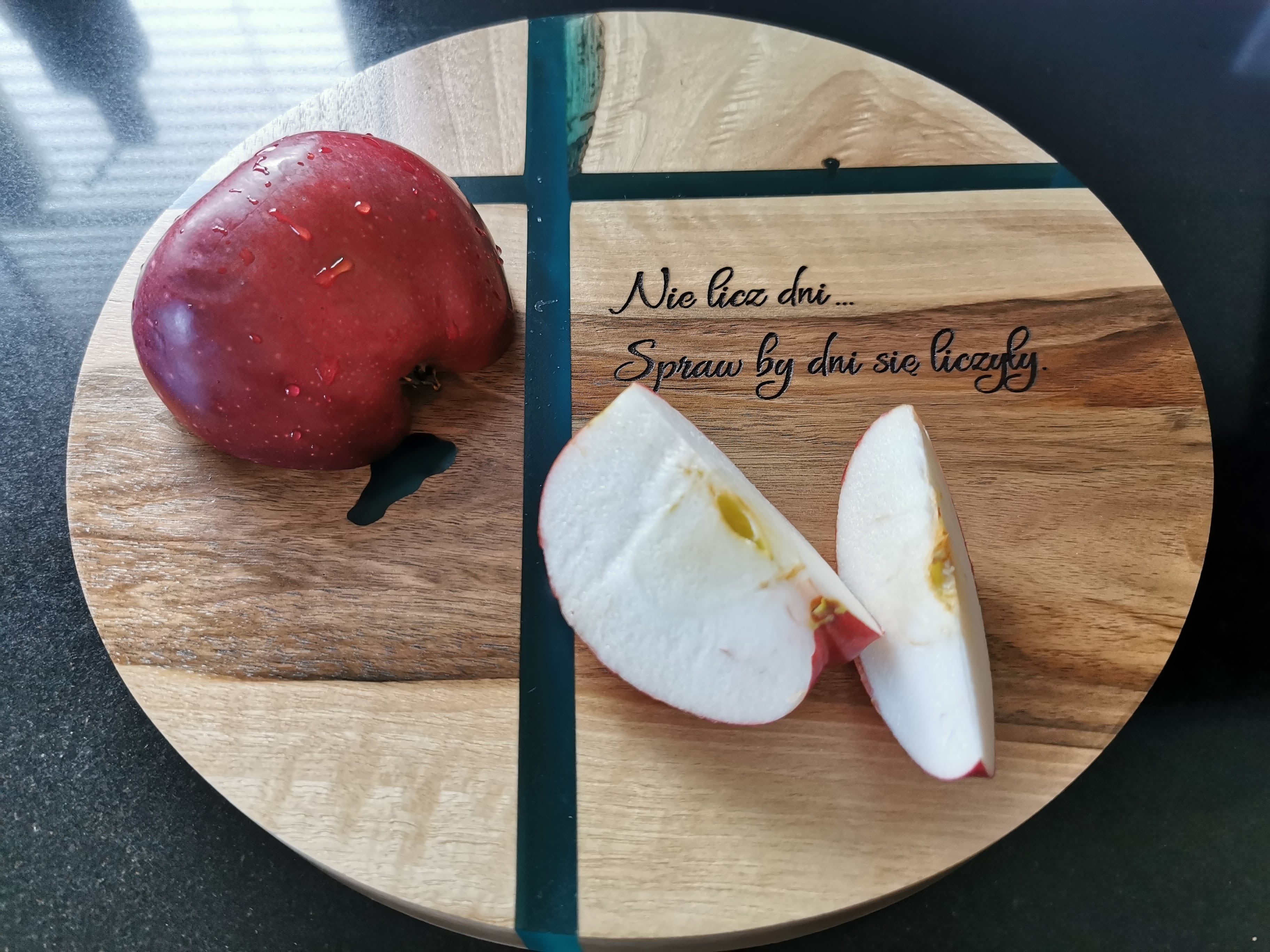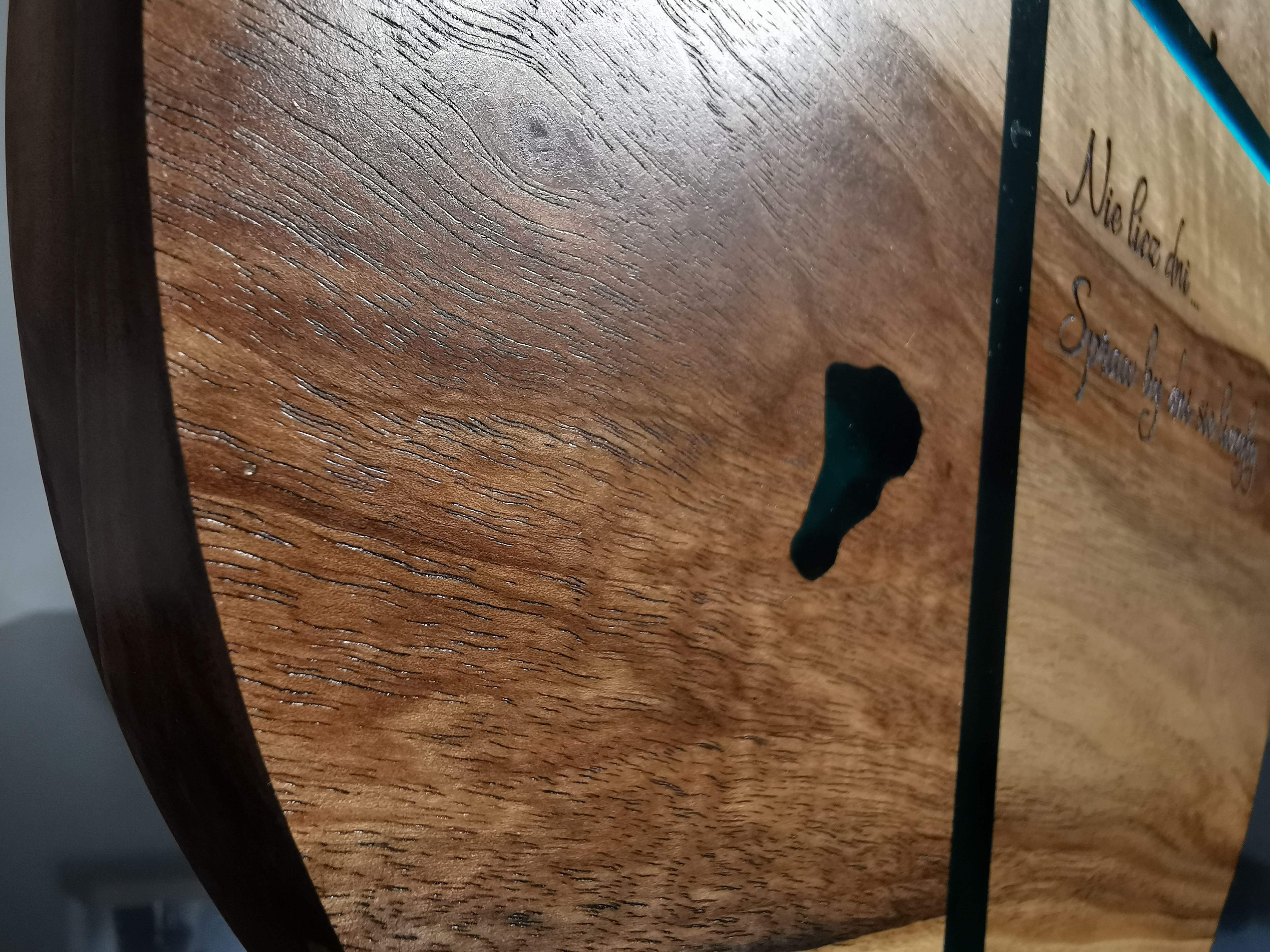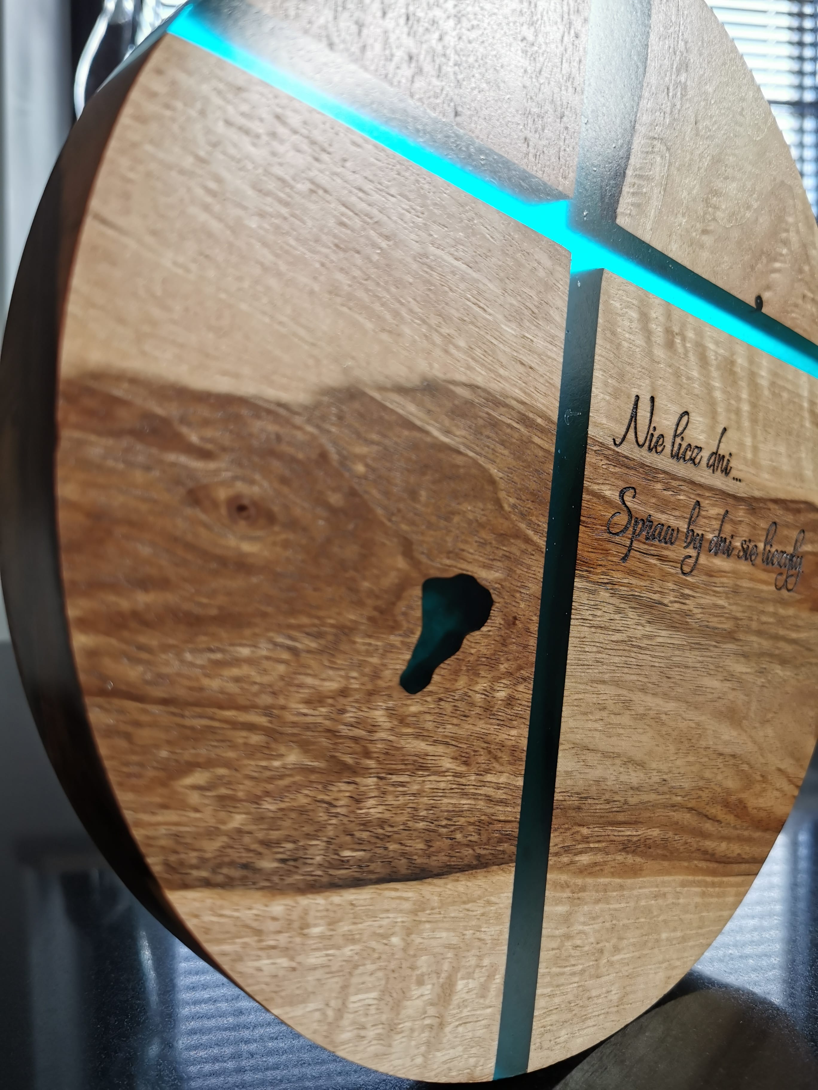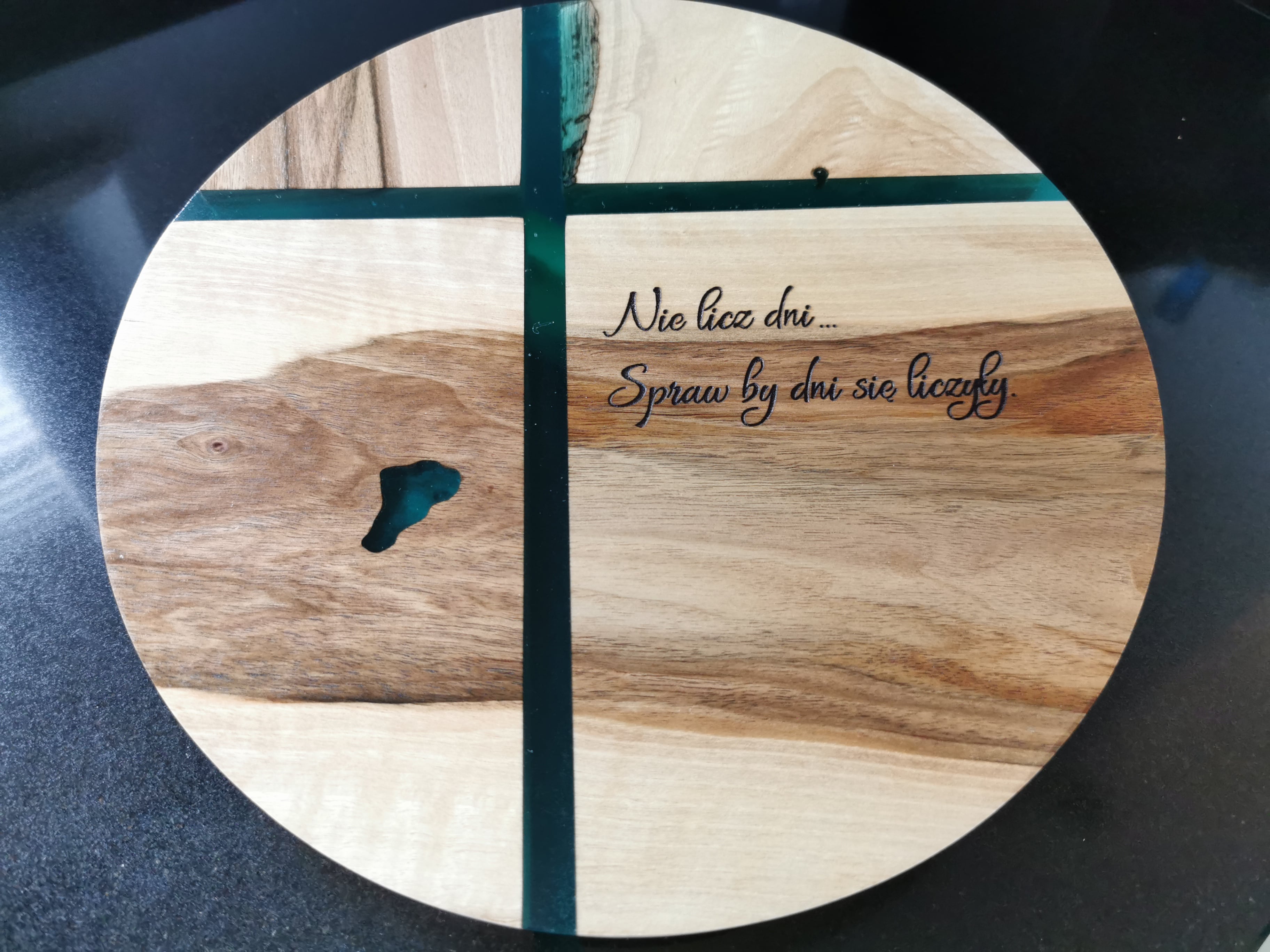Taca /deska do serwowania. Niepowtarzalna, ręcznie wykonana taca ze szlachetnego drewna orzecha włoskiego i żywicy epoksydowej w kolorze turkusu. Wyjątkowe usłojenie oraz design. Całość zabezpieczona najwyższej jakości woskiem do drewna, dopuszczonym do kontaktu z żywnością. Wygrawerowany na desce tekst sprawia, że zaprezentowany przedmiot może być wyjątkowym prezentem na różne okazje, jak również artystycznym elementem zdobiącym własny stół, kuchnię.
